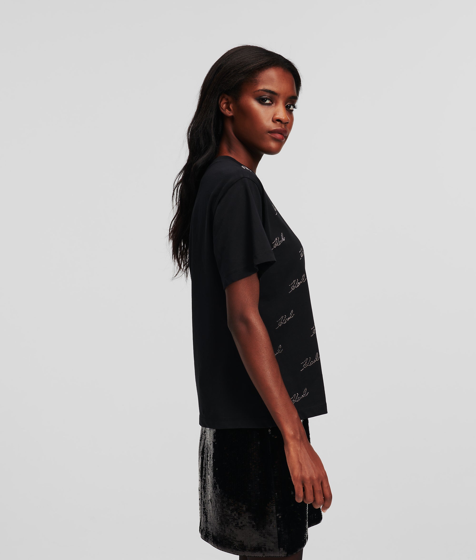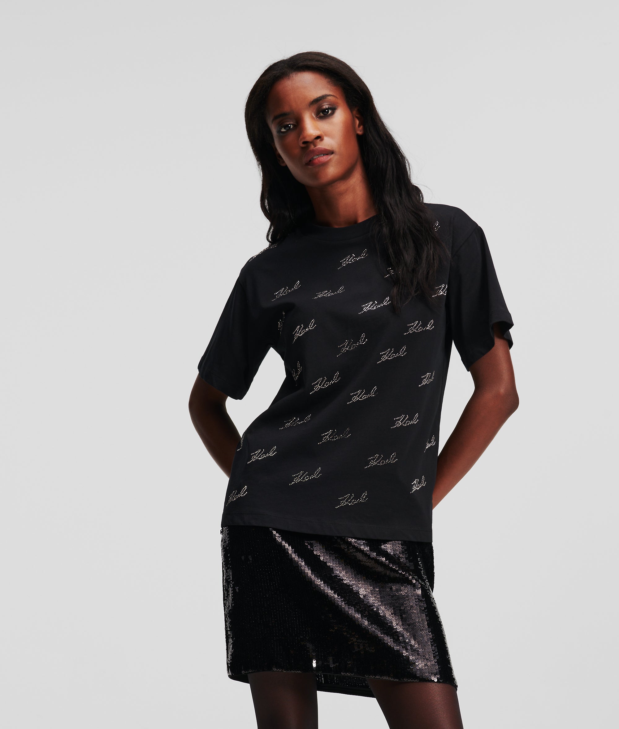 Dieses zeitlose TSshirt ist mit einer KARL-Signatur-Grafik aus glitzernden Strasssteinen verziert. Das auffällige T-Shirt ist aus Bio-Baumwolle gefertigt und lässt sich nahtlos in der Freizeit und am Abend tragen.