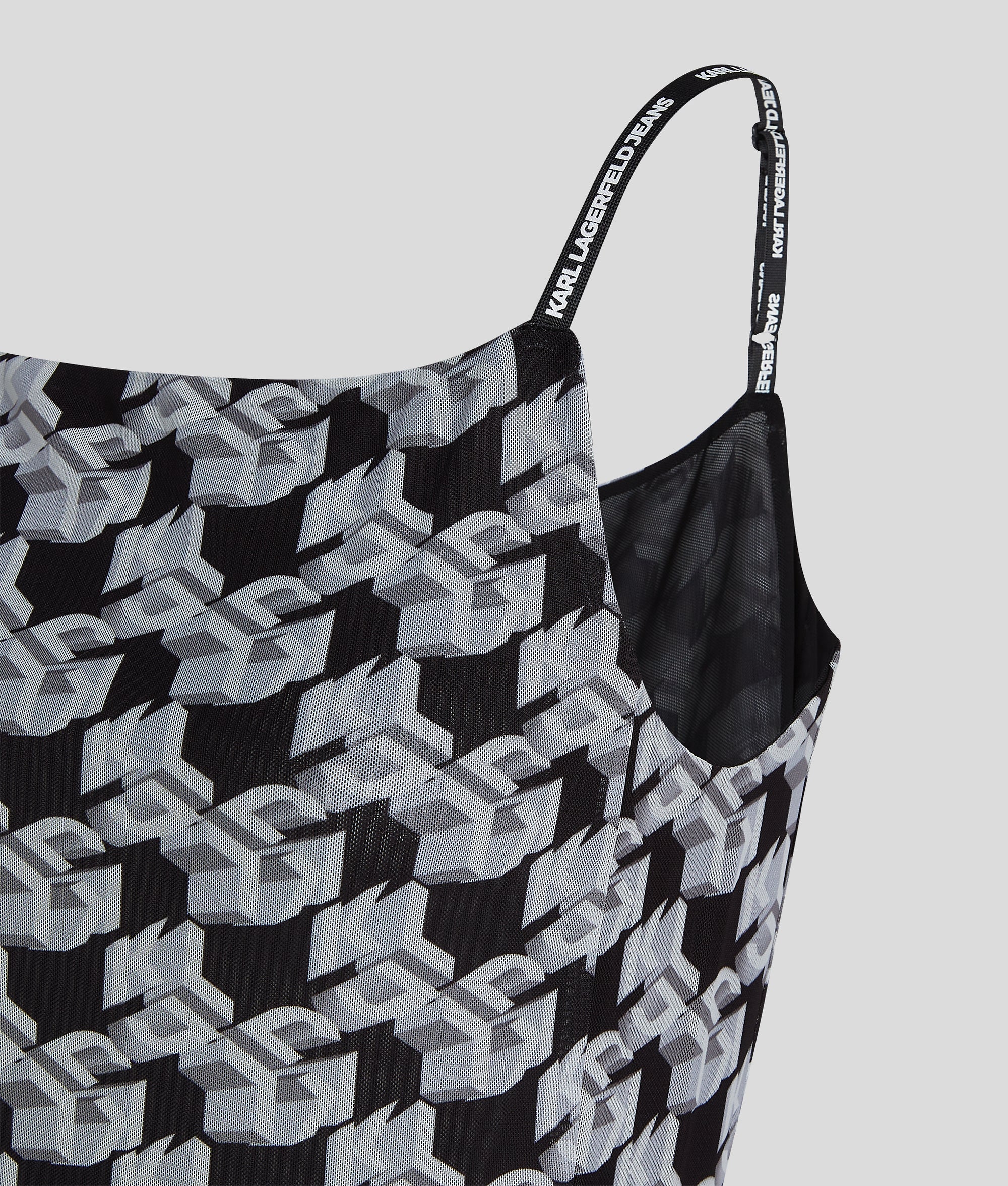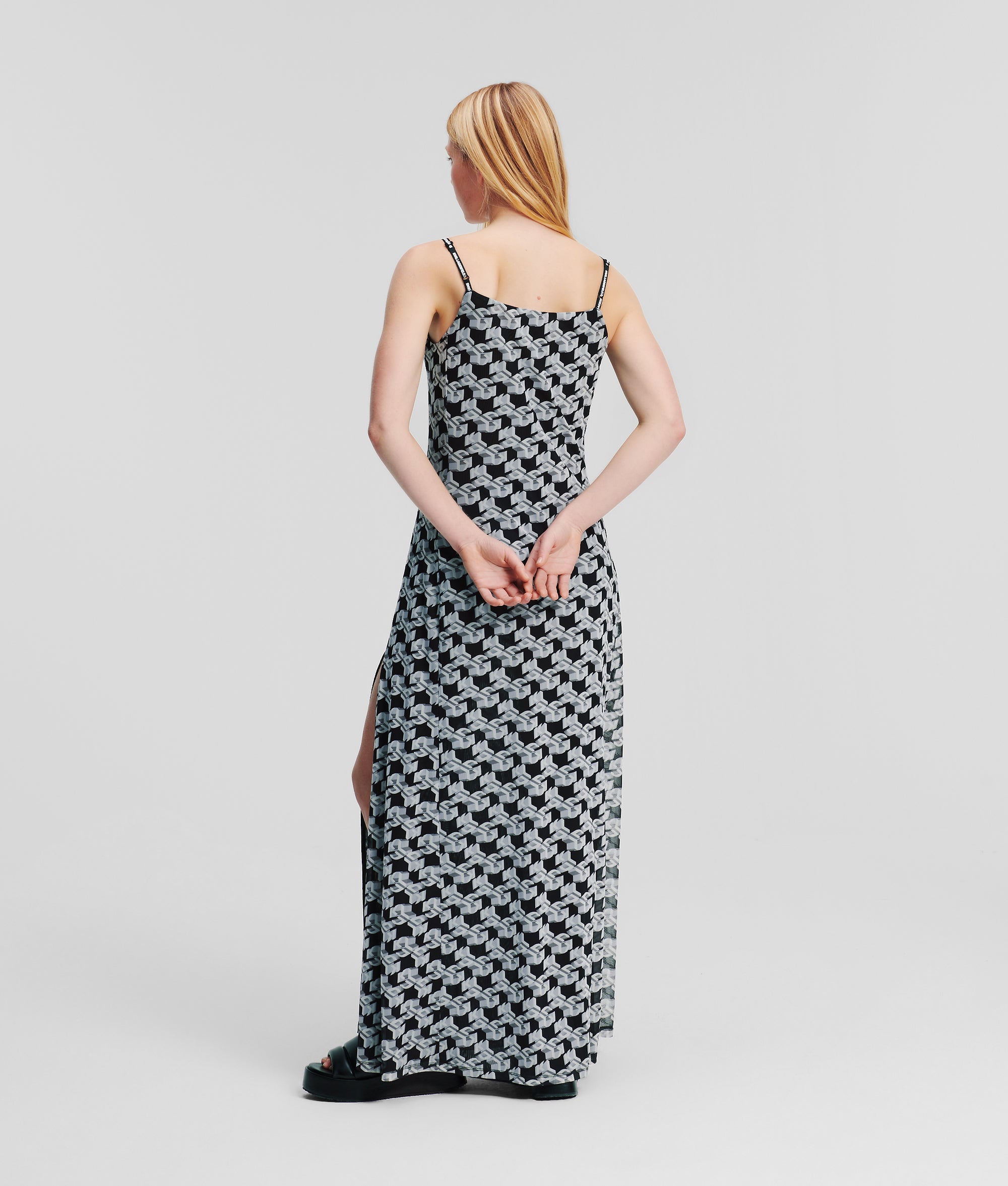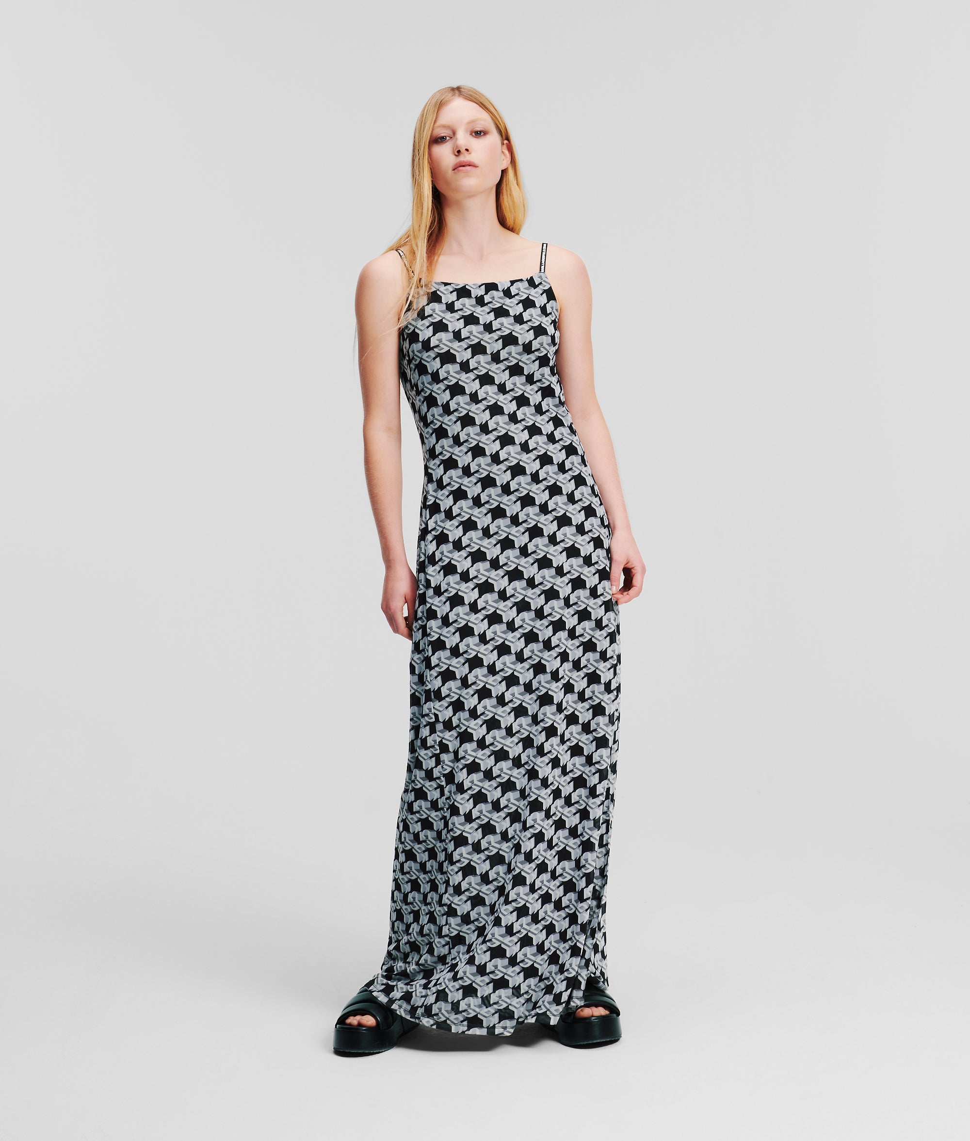 Optimieren Sie Ihre Tages- und Abendgarderobe mit diesem Slip-Kleid in Maxi-Länge, das über einen schicken Seitenschlitz sowie ein auffälliges Monogramm-Design verfügt. Mit einem Paar Stiefel mit Stollensohle sind Sie für jeden Anlass bestens gerüstet.