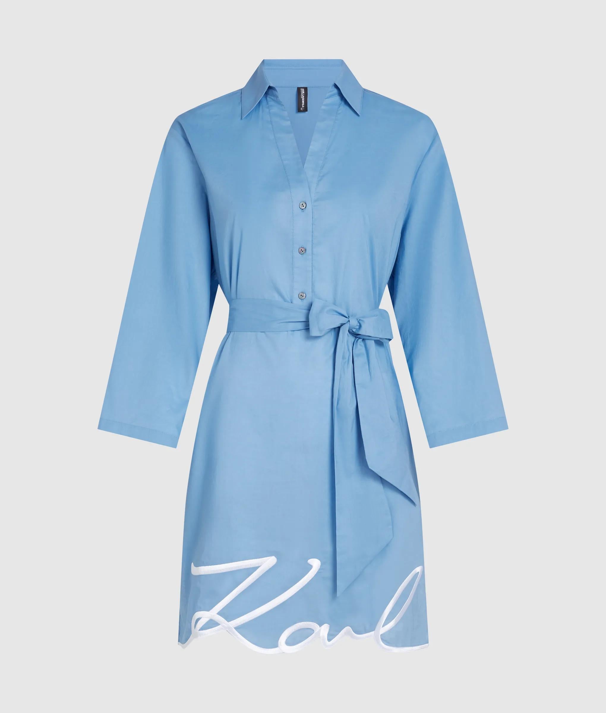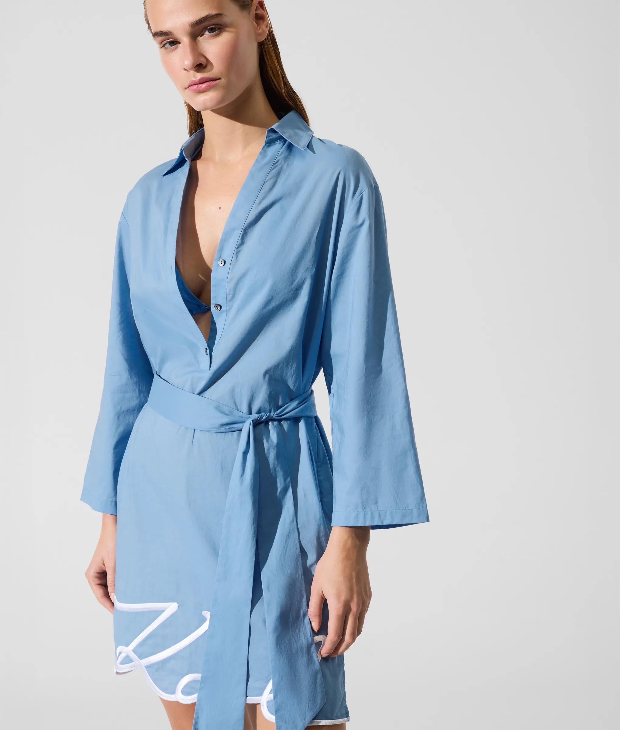 Die perfekte Mischung aus Komfort und Style: Das Strandkleid mit Knöpfen mit Markenlogo und Bindegürtel zum Raffen sorgt für einen figurbetonten Sitz. Die unverwechselbare KARL-Signatur-Stickerei auf dem Saum sorgt für einen Hauch von Einzigartigkeit und ist ein Must-have für sonnige Tage.