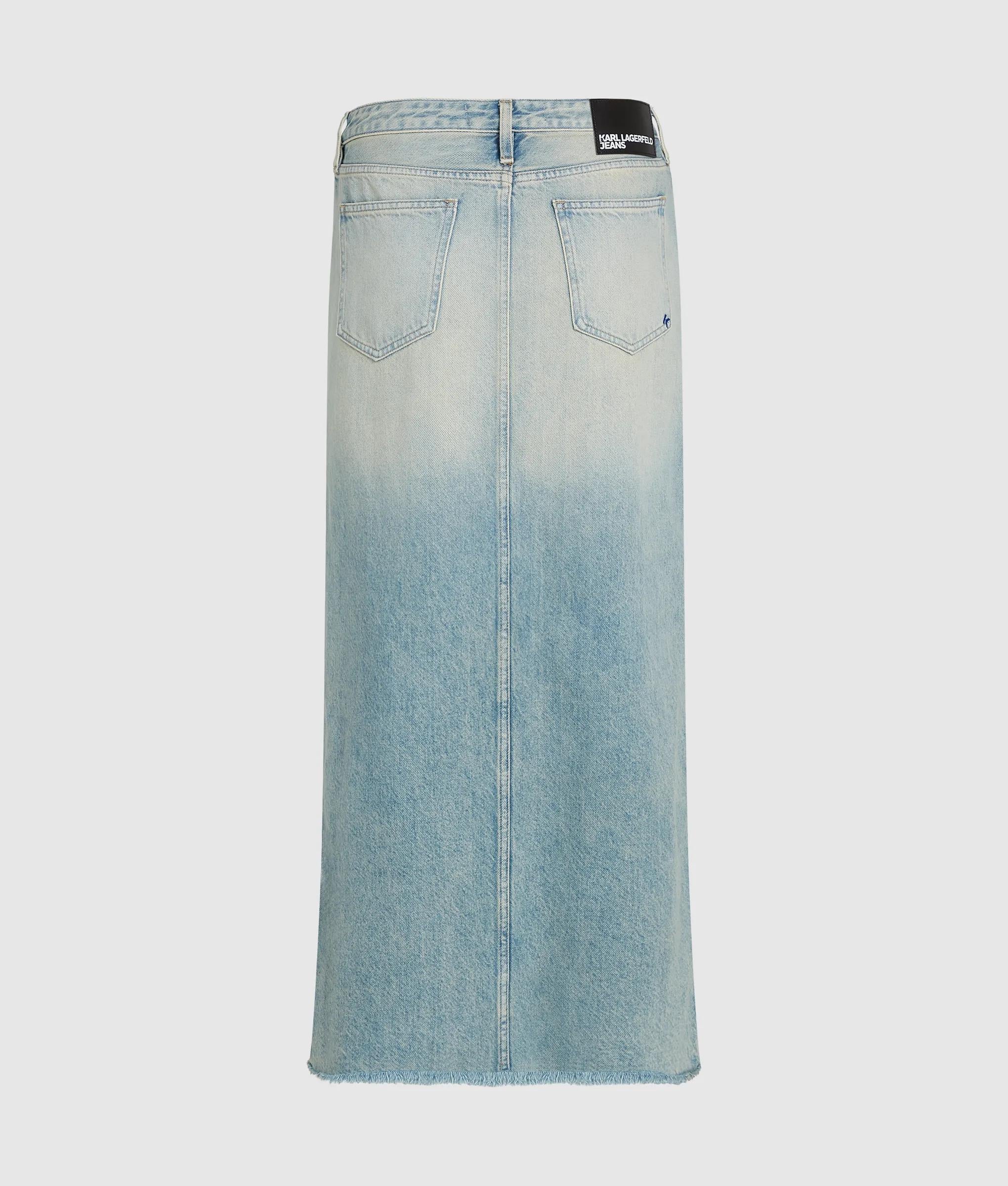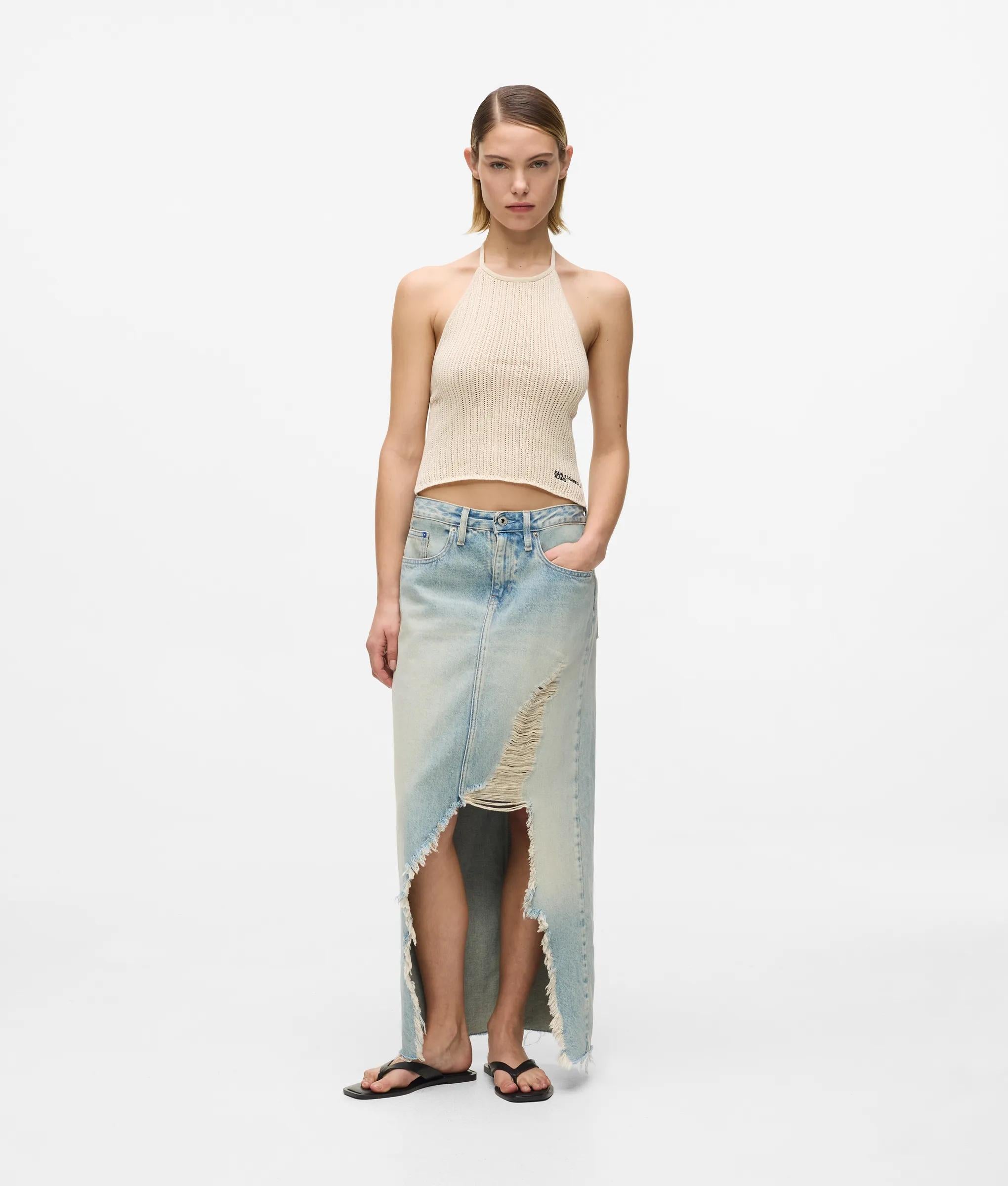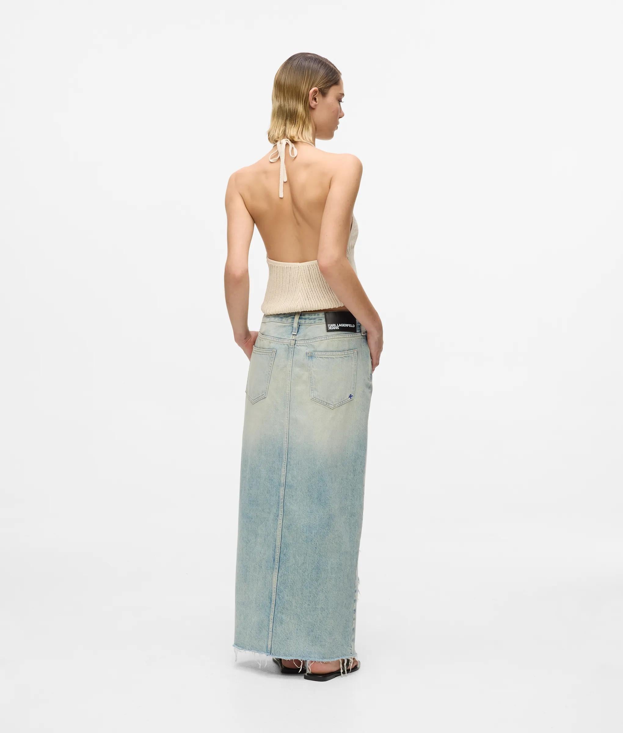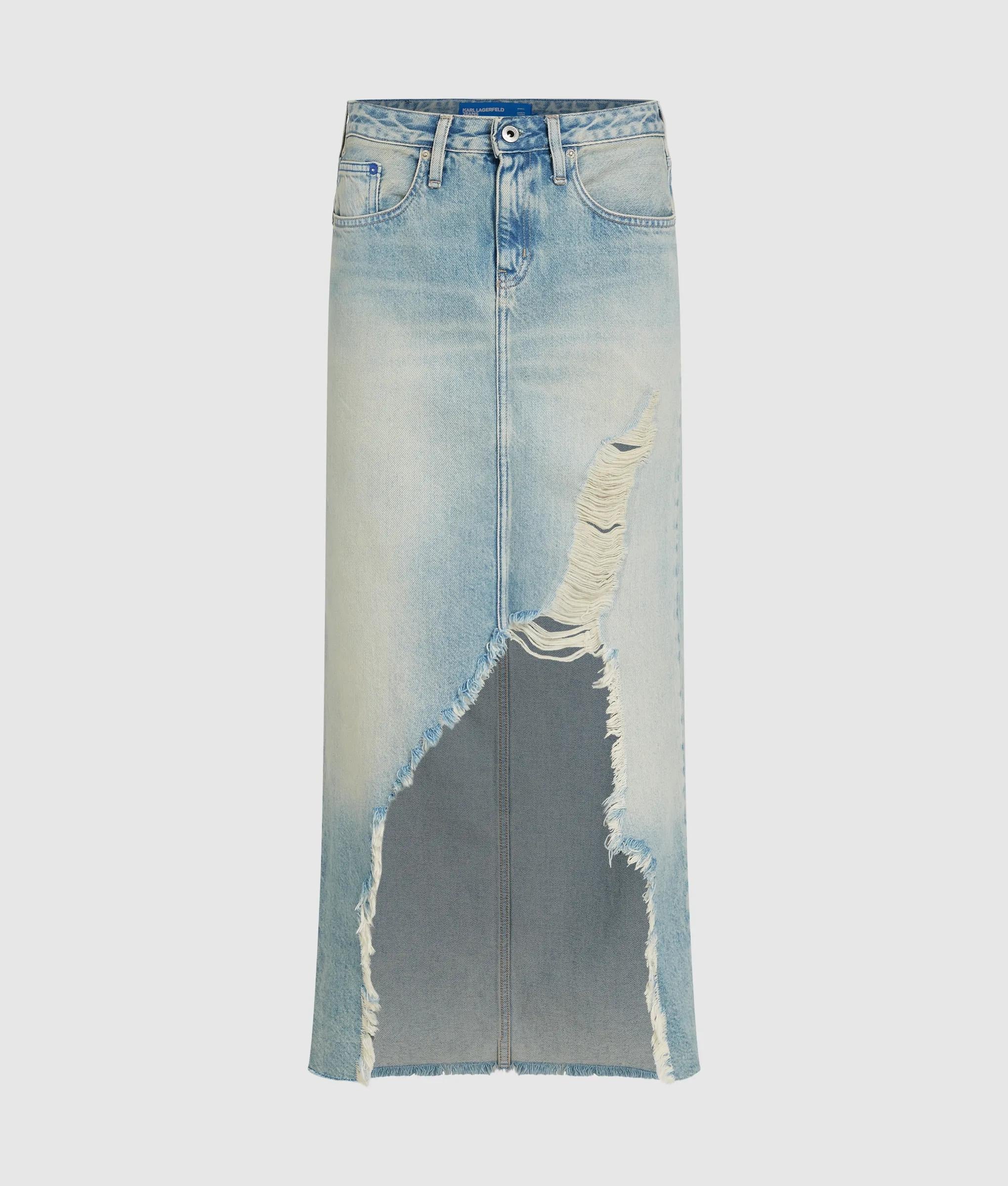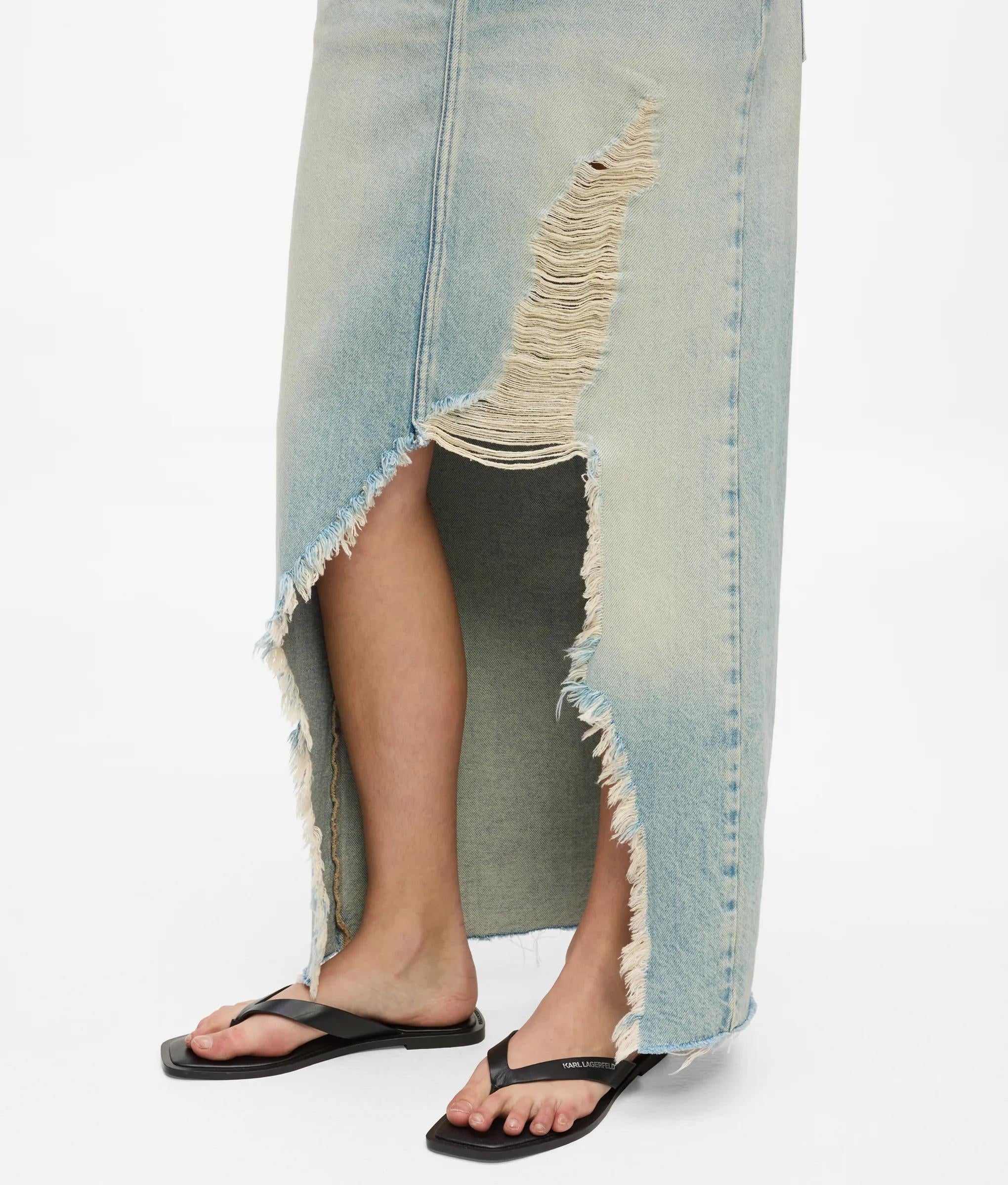 Ein steifer Maxi-Jeansrock mit ausgefranster Vorderseite und einem aufsehenerregenden High-Low-Saum, der bei jedem Schritt markantes, urbanes Selbstbewusstsein ausstrahlt.