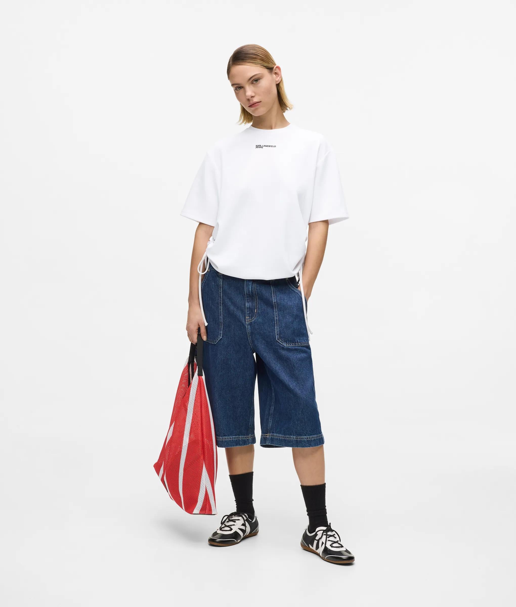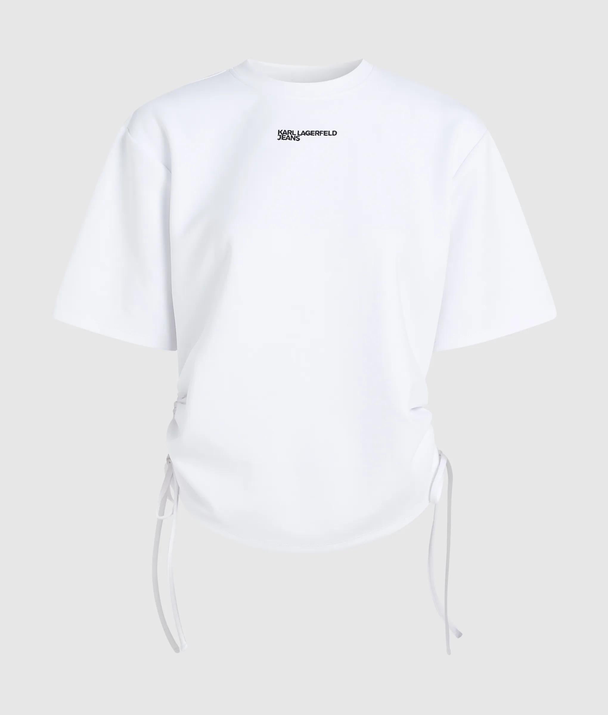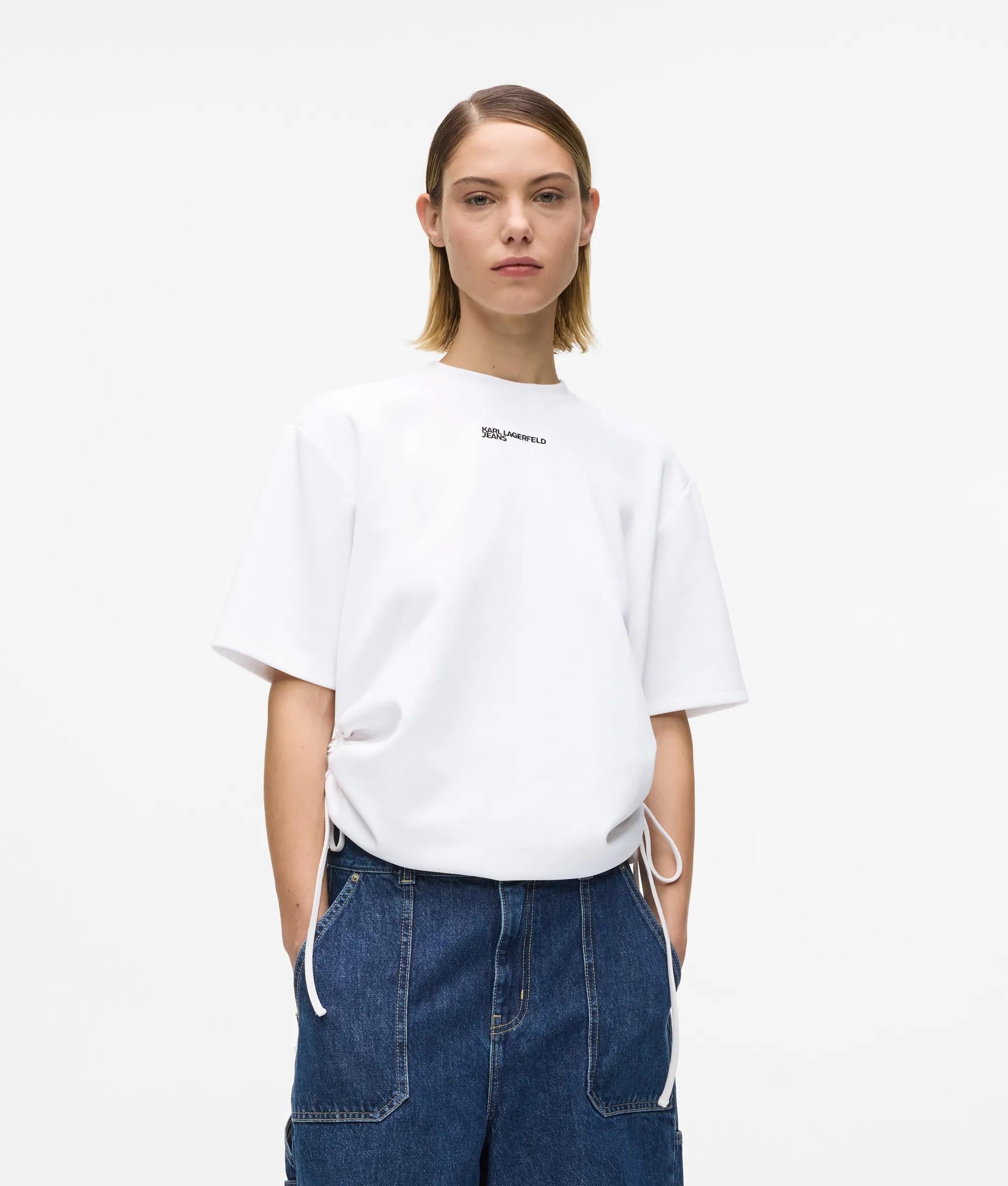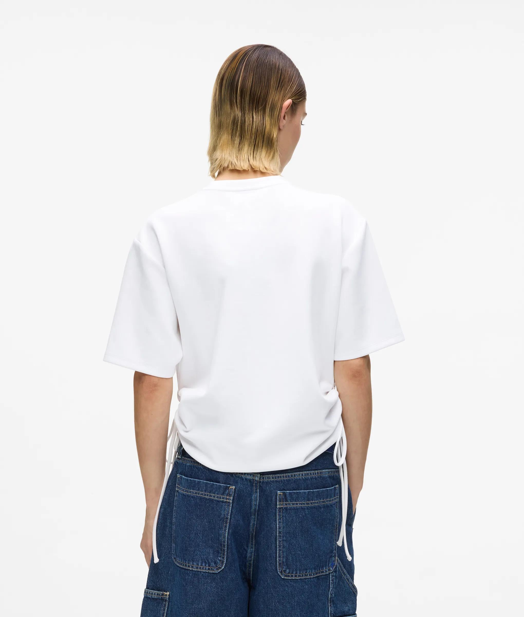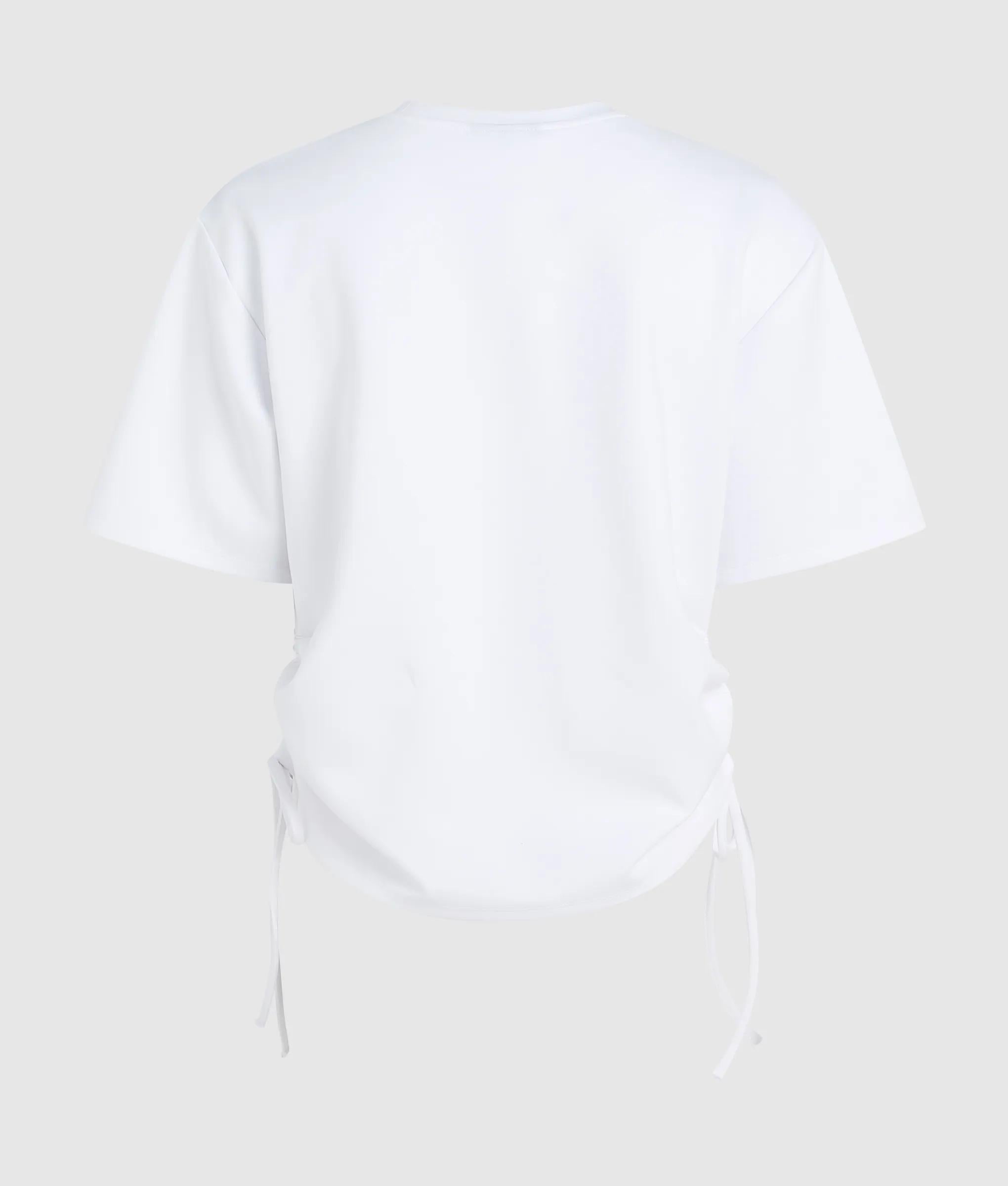 Eine neue Interpretation des klassischen T-Shirts. Dieses kurzärmelige T-Shirt mit Rundhalsausschnitt wird durch seitliche Schnürungen zum Raffen und Verkürzen der Silhouette neu interpretiert. Unkomplizierter Tragekomfort und müheloses Umgestalten.