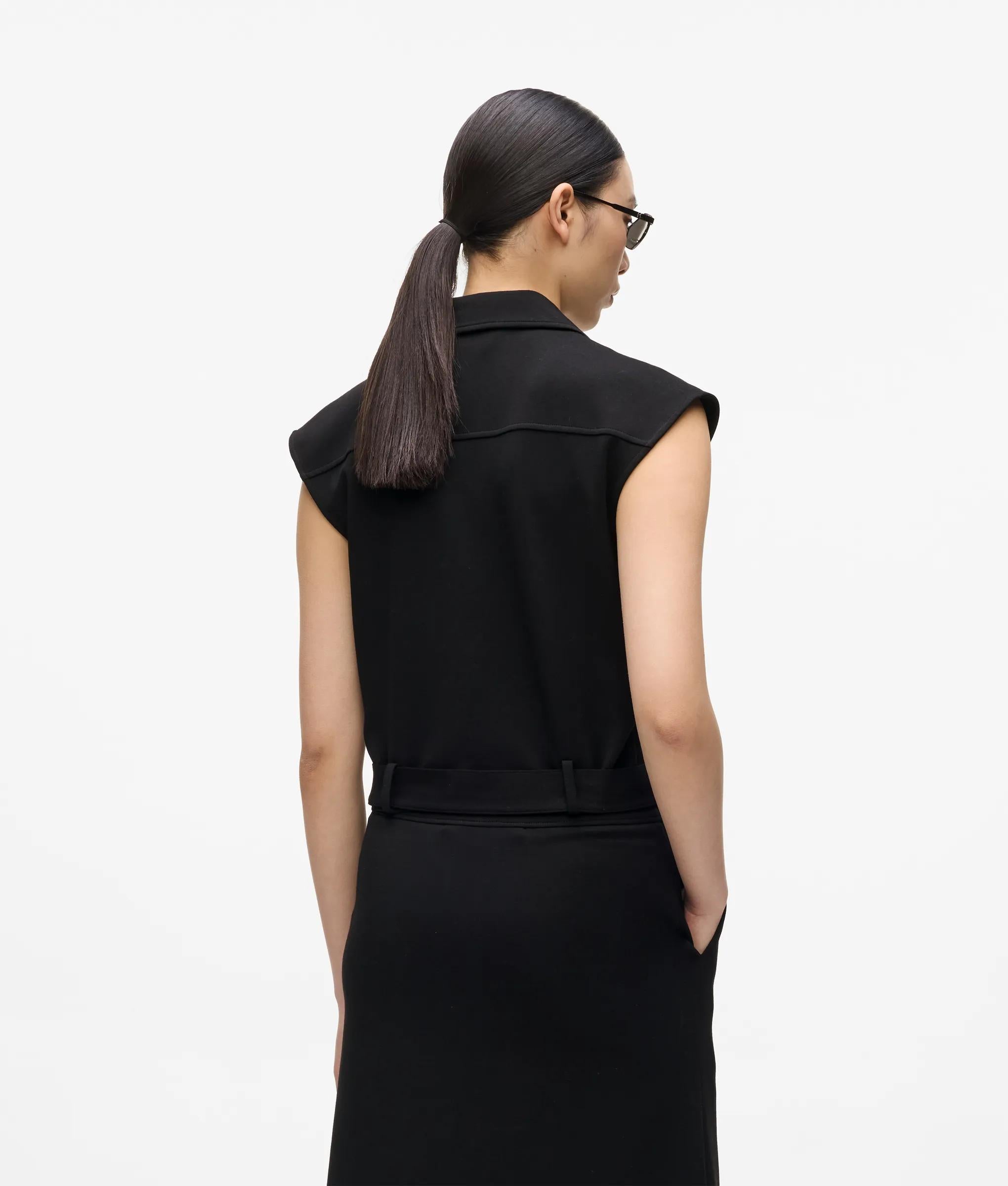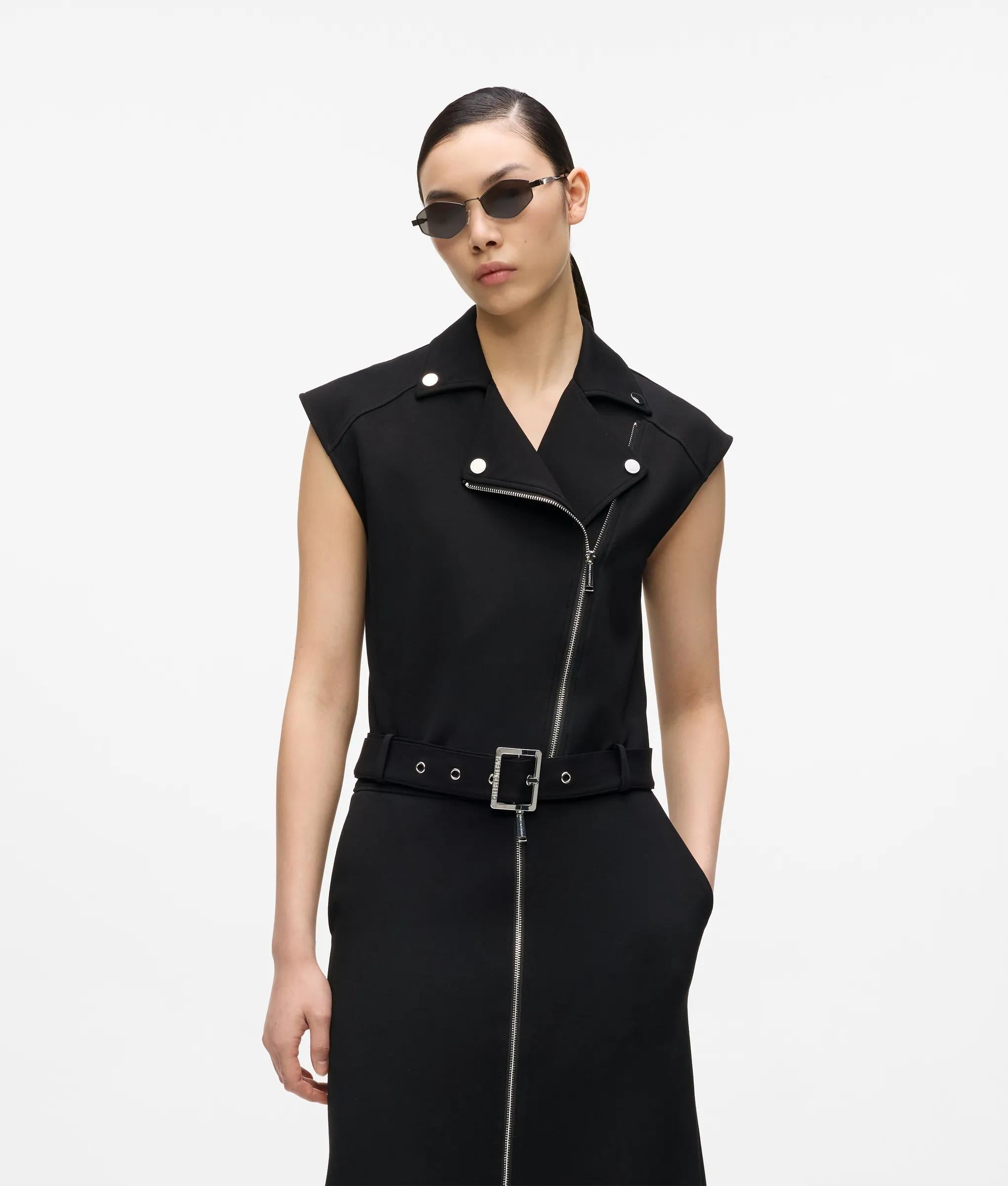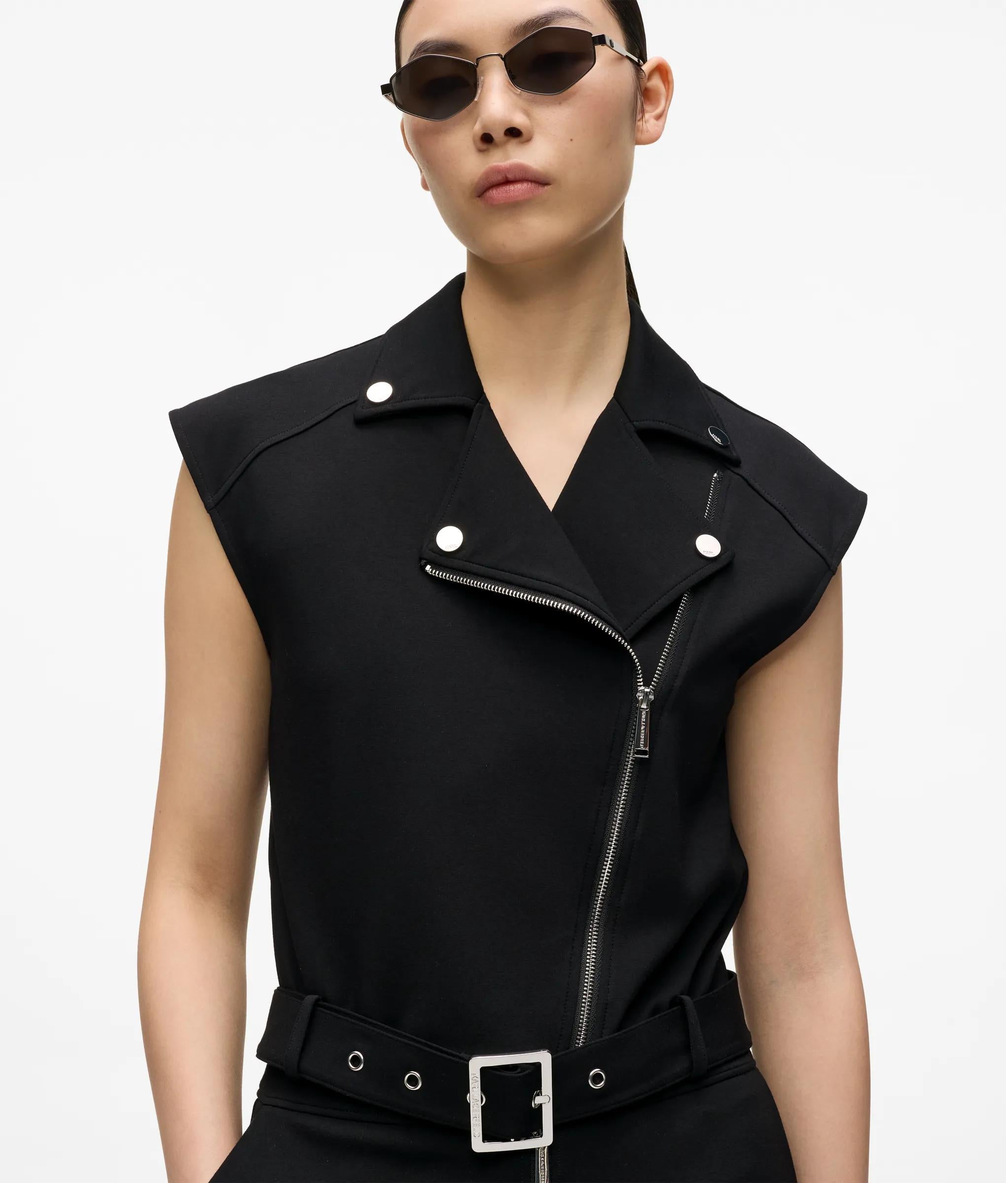 Dieses ärmellose Jersey-Sweatshirt ist eine gewagte Neuinterpretation der klassischen Bikerjacke und besticht durch einen asymmetrischen Reißverschluss sowie einen breiten, mit Druckknöpfen versehenen Kragen, die für eine skulpturale Ausstrahlung sorgen. Der mit einer glänzenden Schnalle und Nieten verzierte Taillengürtel definiert die Silhouette, die perfekt mit dem passenden Maxirock harmoniert.