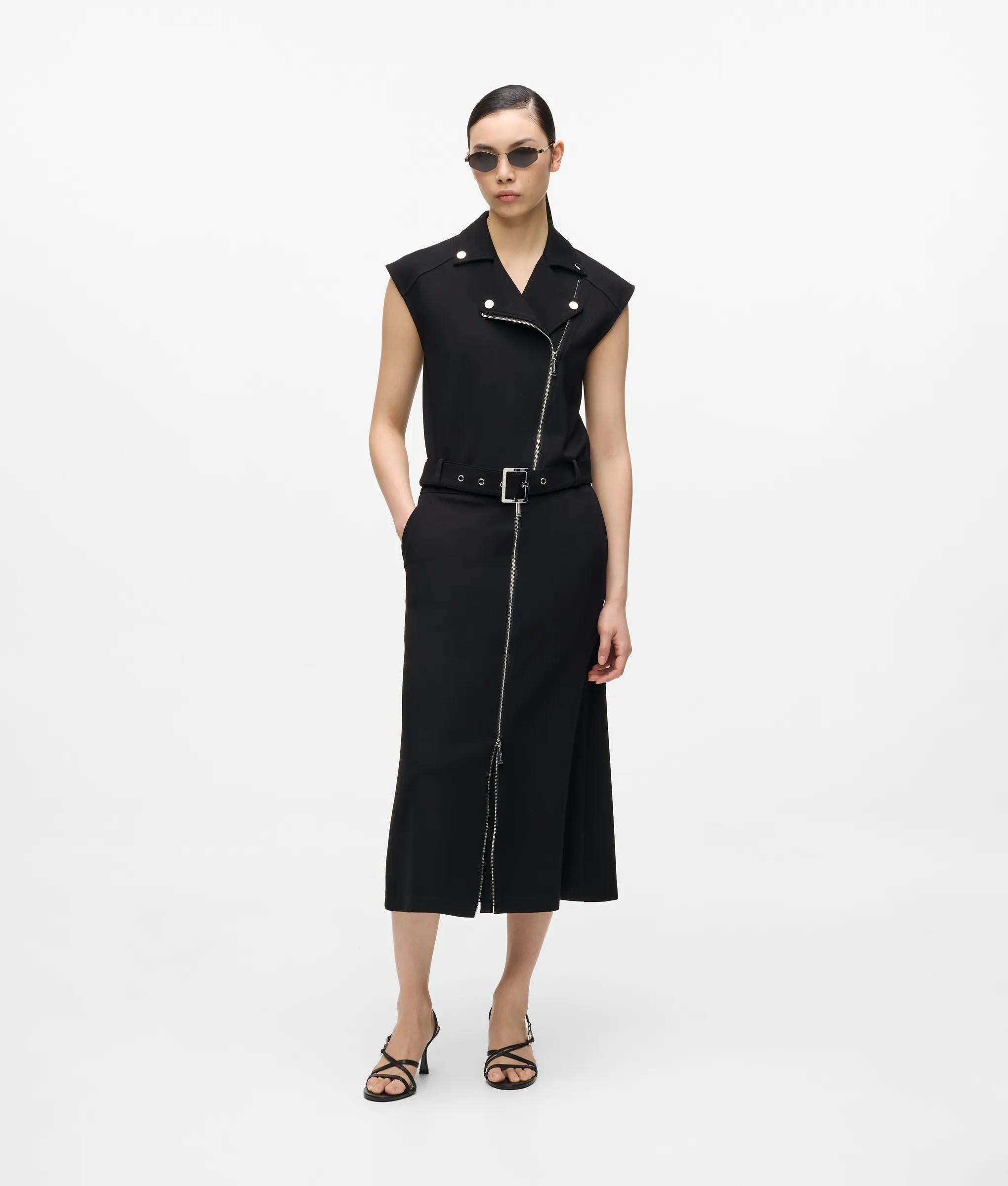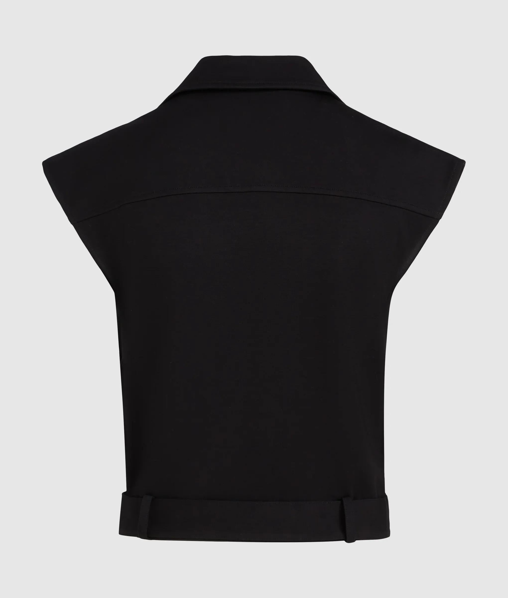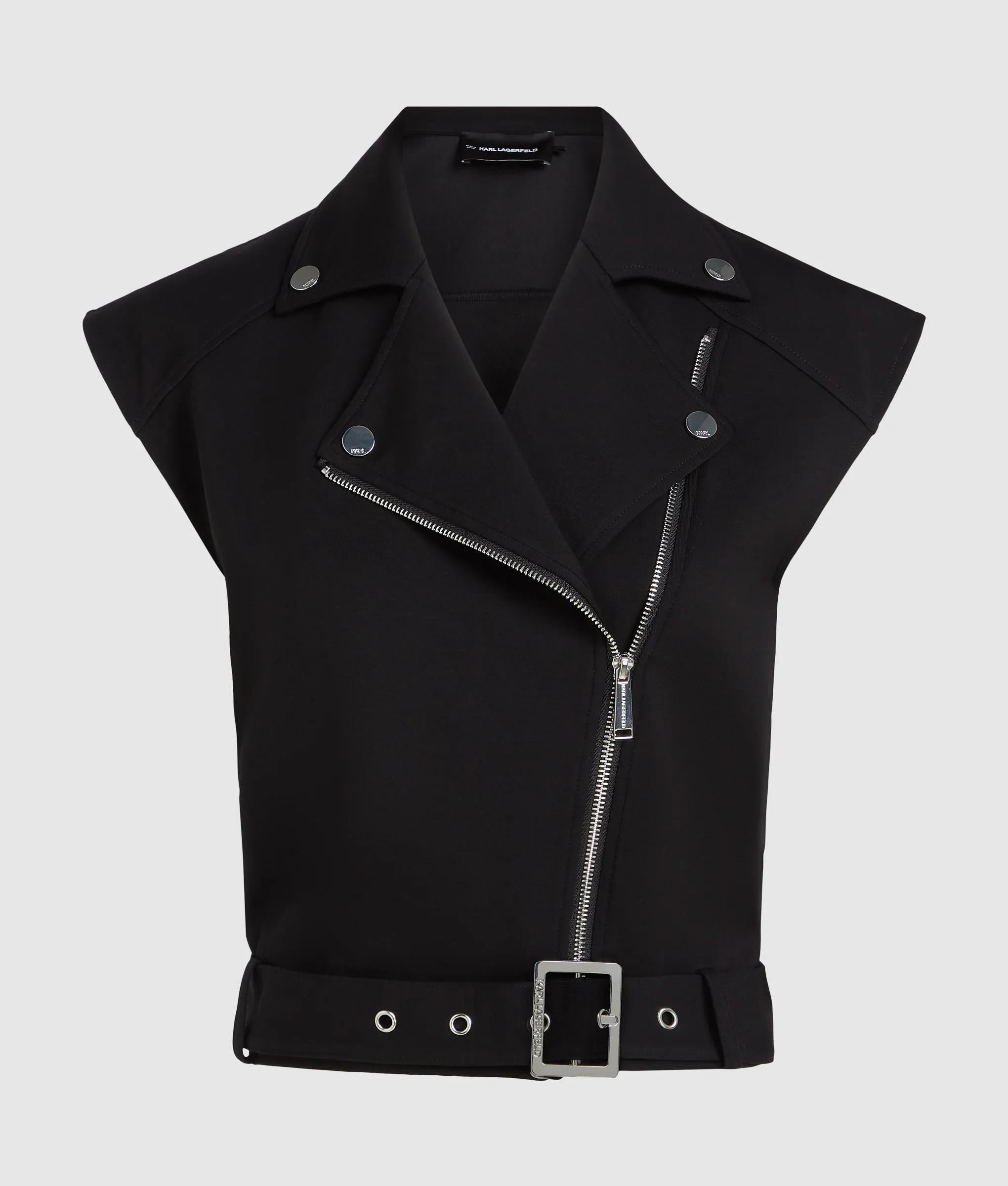 Dieses ärmellose Jersey-Sweatshirt ist eine gewagte Neuinterpretation der klassischen Bikerjacke und besticht durch einen asymmetrischen Reißverschluss sowie einen breiten, mit Druckknöpfen versehenen Kragen, die für eine skulpturale Ausstrahlung sorgen. Der mit einer glänzenden Schnalle und Nieten verzierte Taillengürtel definiert die Silhouette, die perfekt mit dem passenden Maxirock harmoniert.