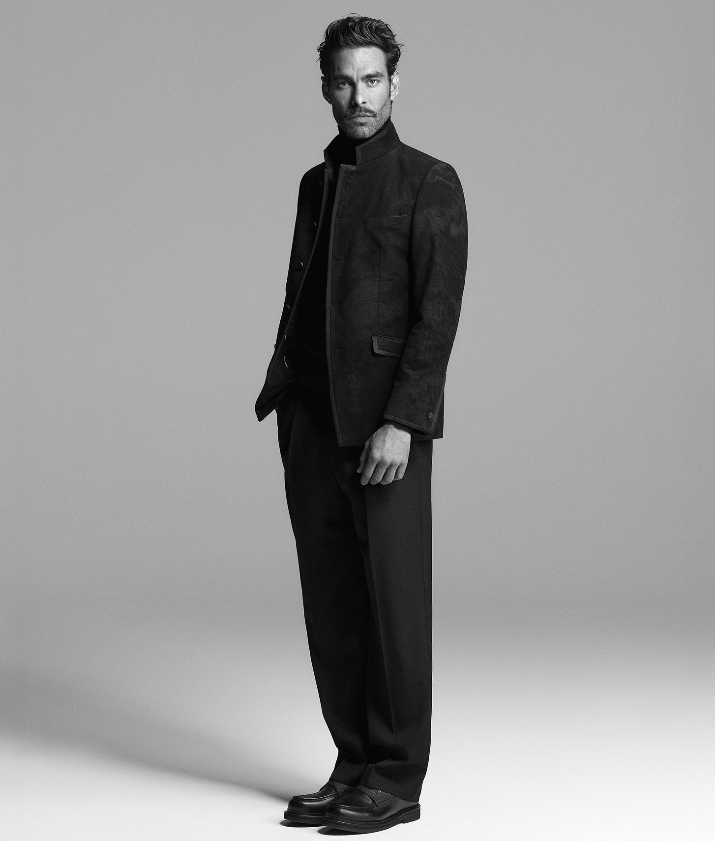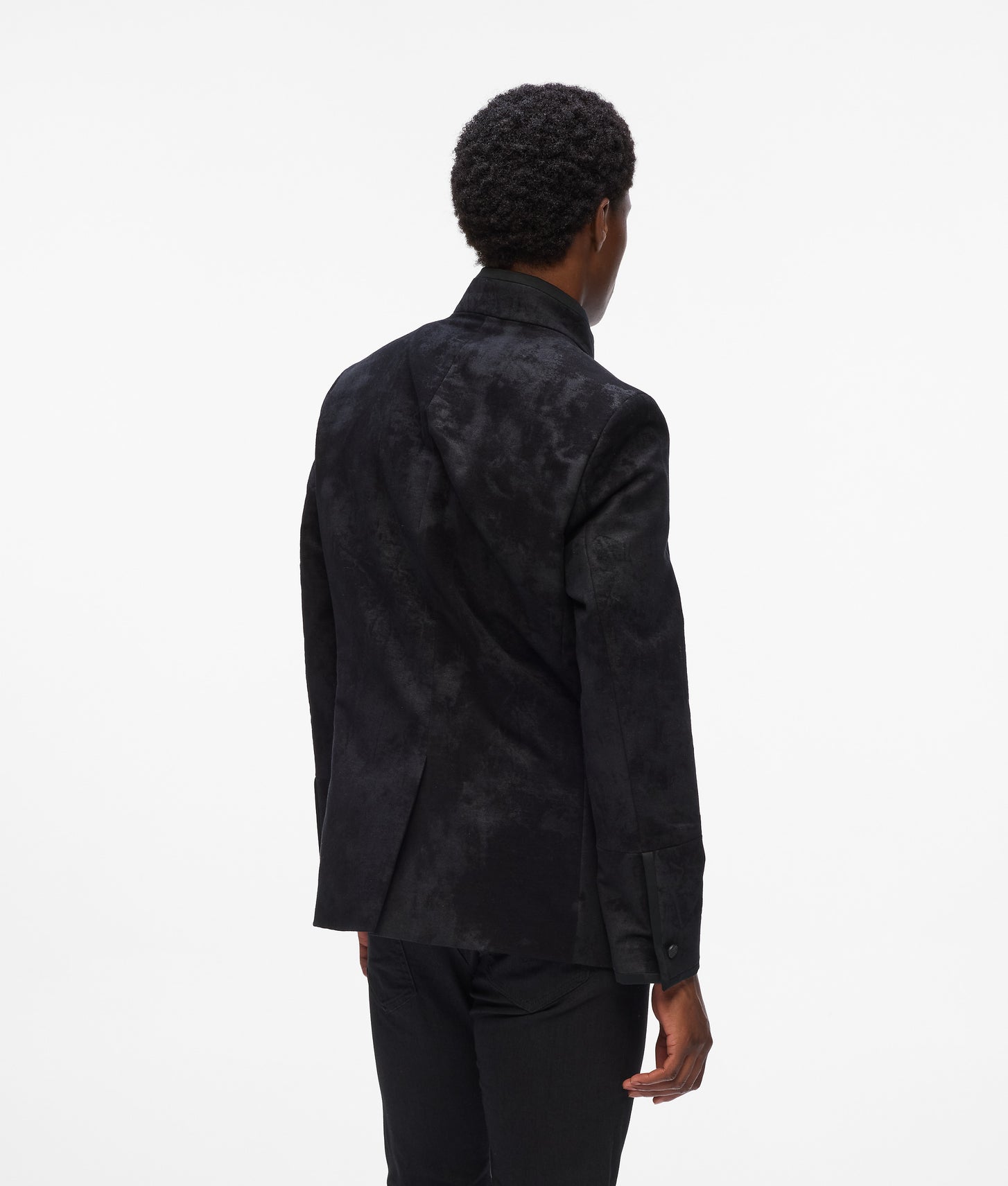 Ein Stehkragen, Satinbesatz und ein gemustertes Futter verleihen dieser hochwertigen, einreihigen Jacke ikonische Details.