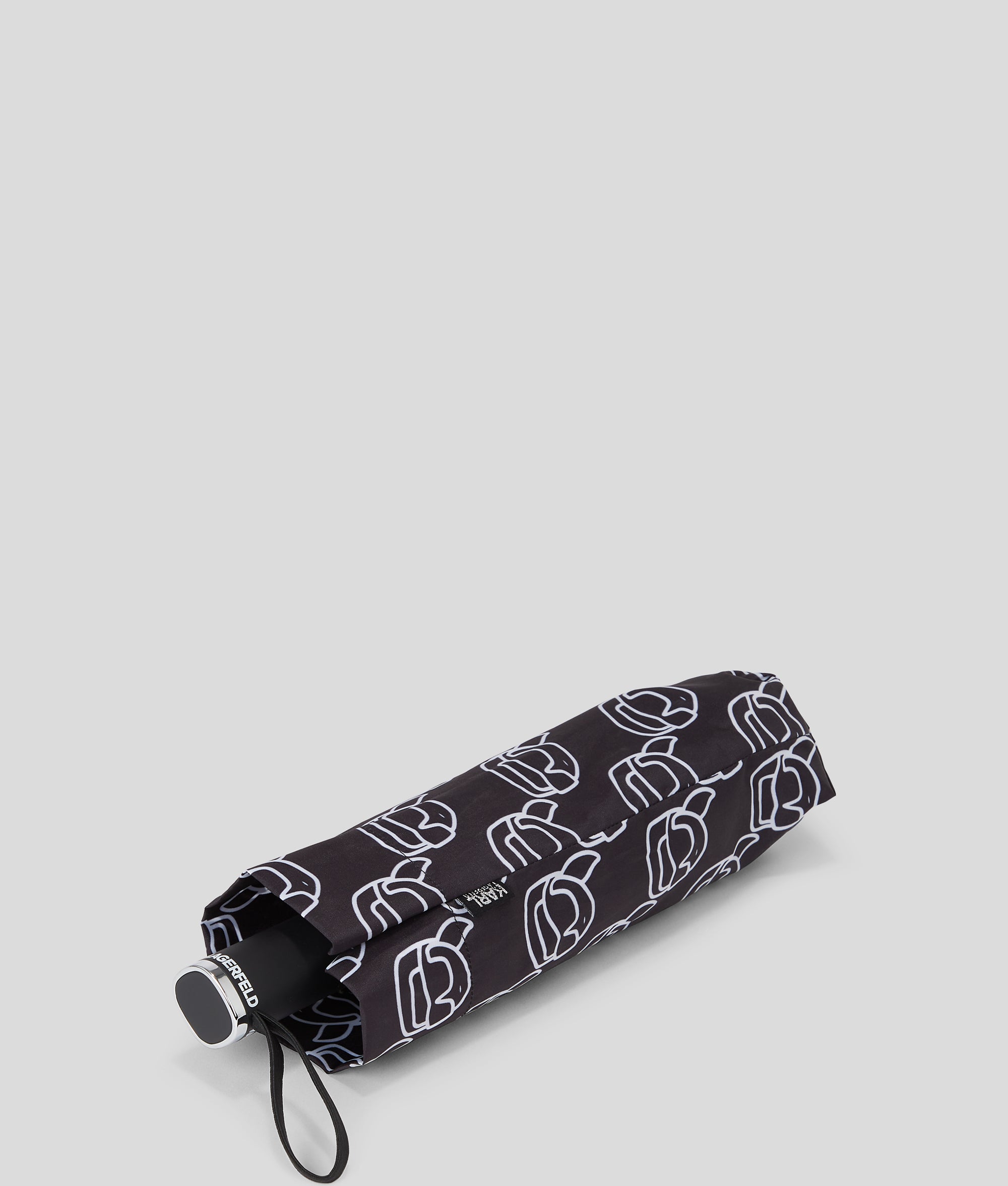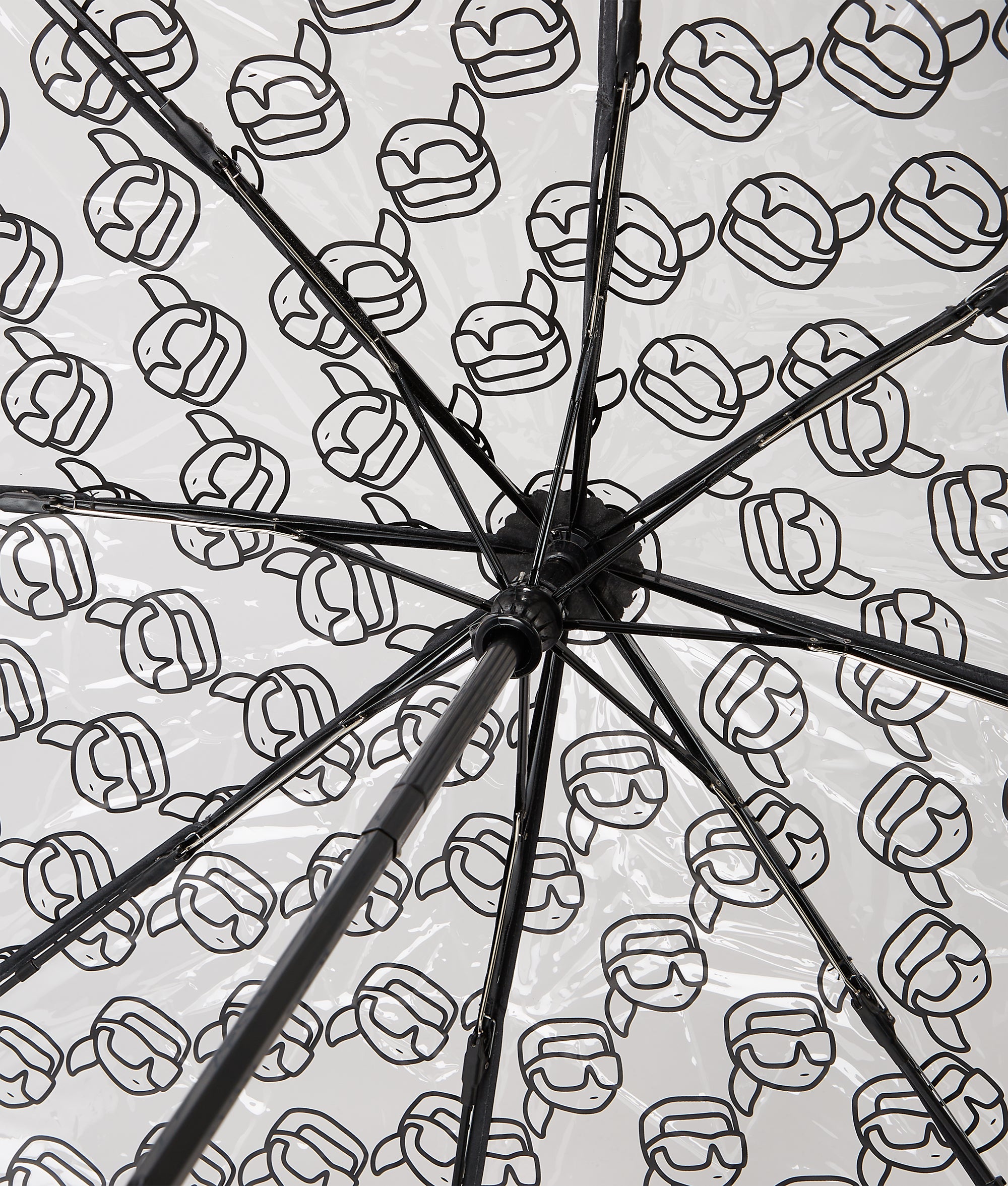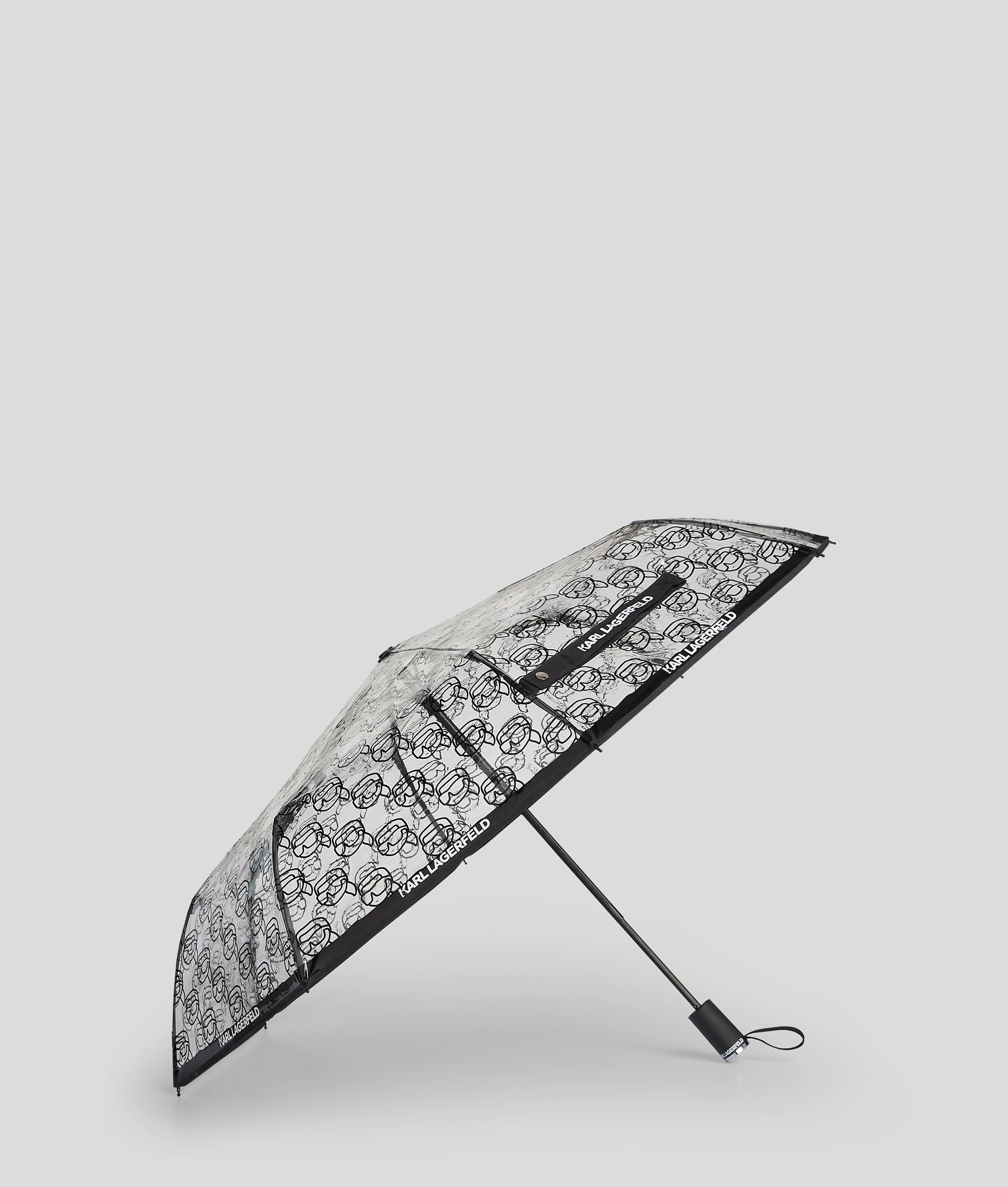 IKON bei Regen und bei Sonnenschein. Dieser kompakte Regenschirm verfügt über eine transparente Hülle mit einem verspielten, durchgehenden IKON Karl-Design.