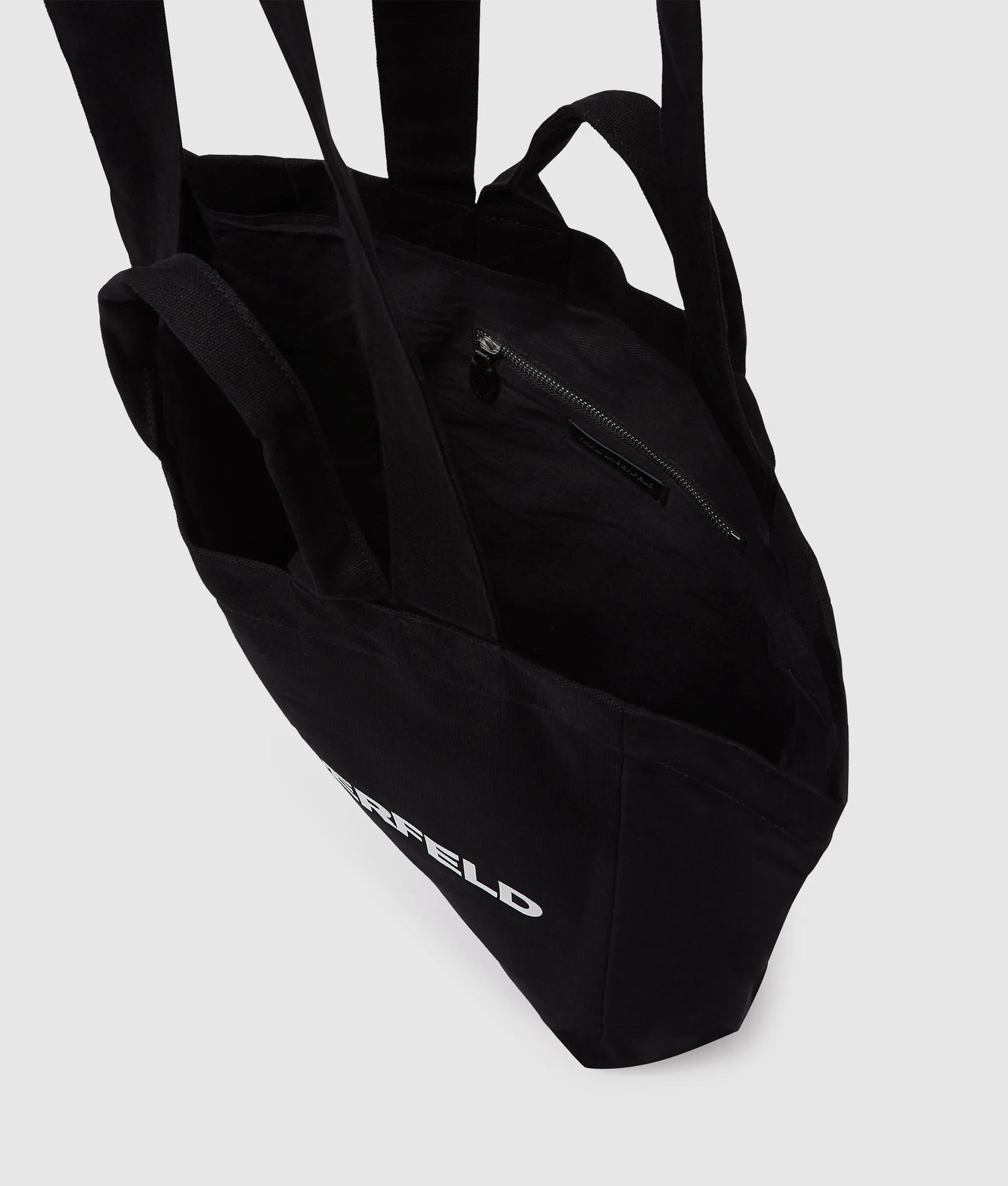 Diese gewebte Tote Bag vereint die weiche Haptik von recycelter Baumwolle mit einem markanten KARL LAGERFELD-Branding. Zwei Tragegriffe und eine Innentasche mit Reißverschluss halten das Wesentliche sicher verstaut – perfekt für Tage in der Stadt.