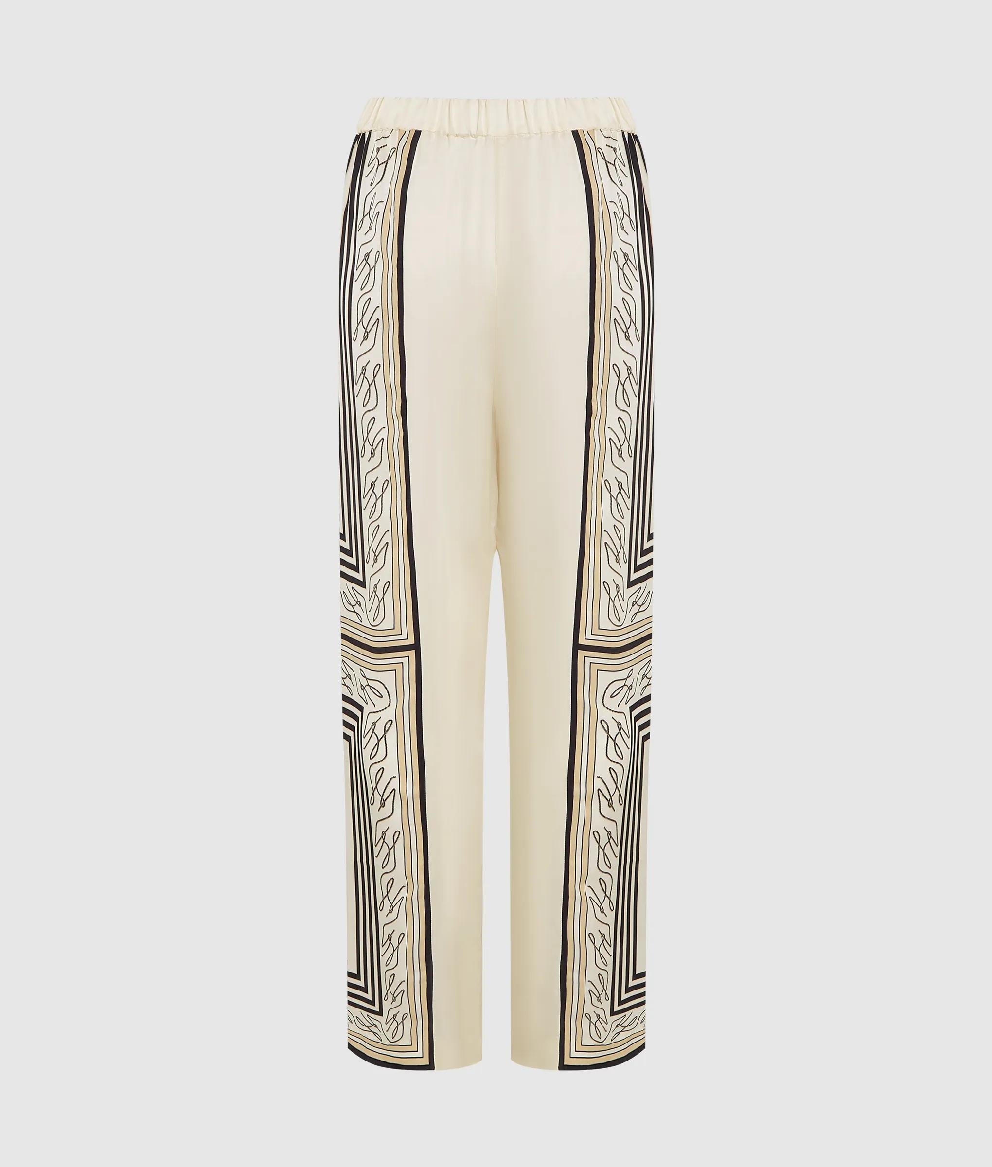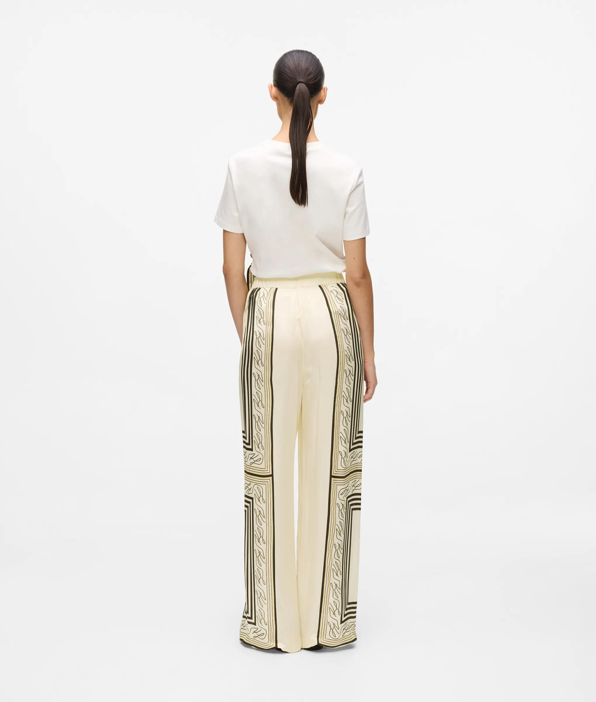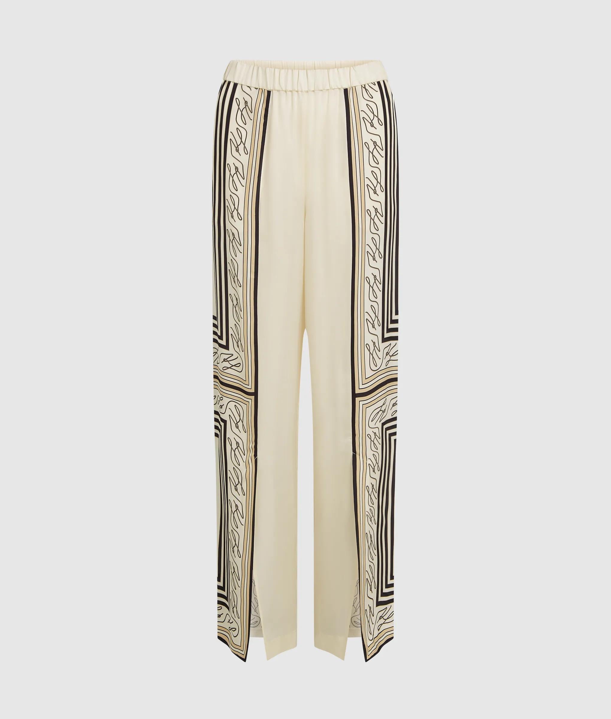 Die fließende, weite Silhouette mit Schlitzen vorne am Saum sorgt für bequeme Bewegungsfreiheit bei dieser Pyjamahose. Der elastische Bund biete Tragekomfort, während der auffällige Autograph-Schalprint die Hose zum Blickfang macht.