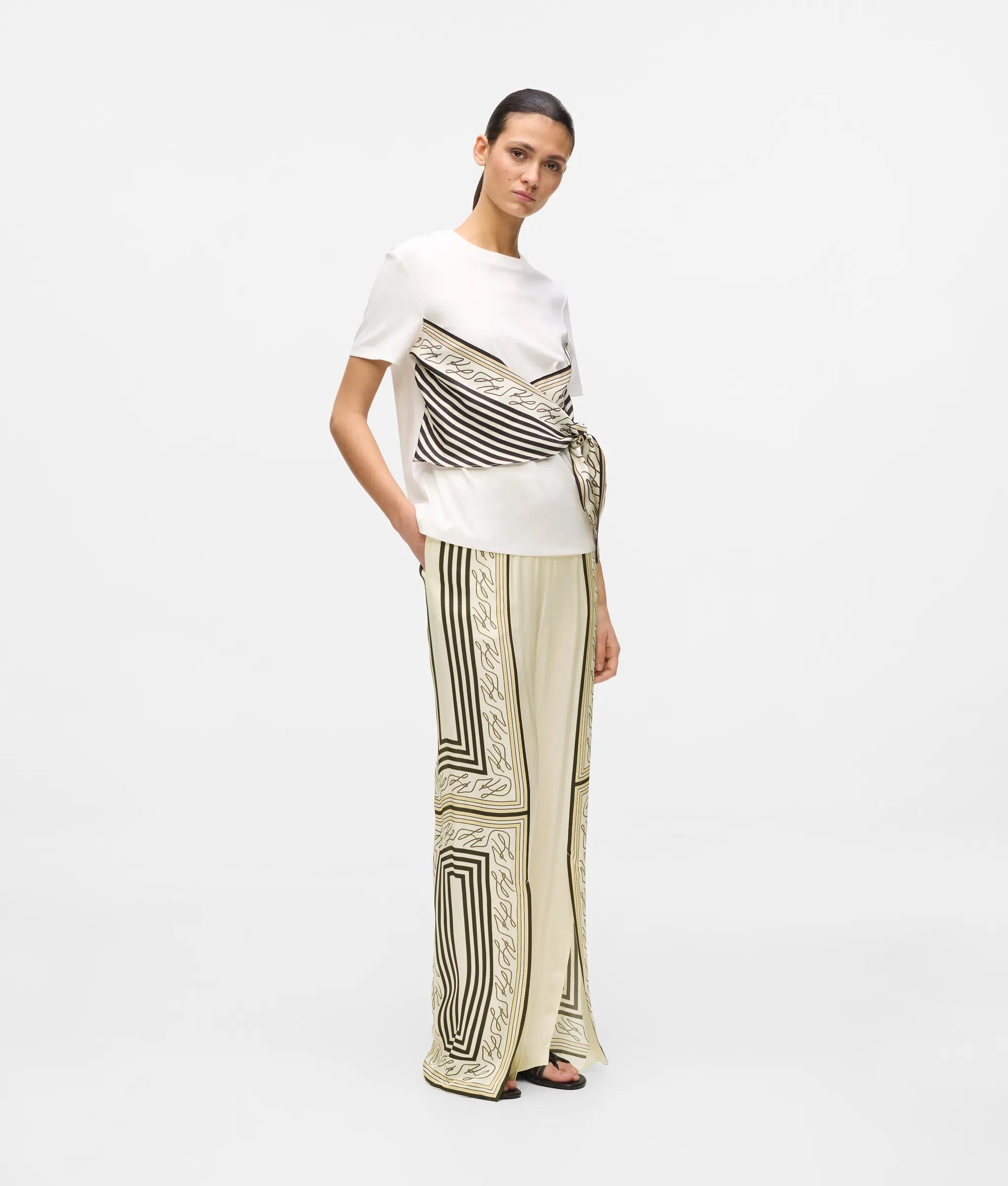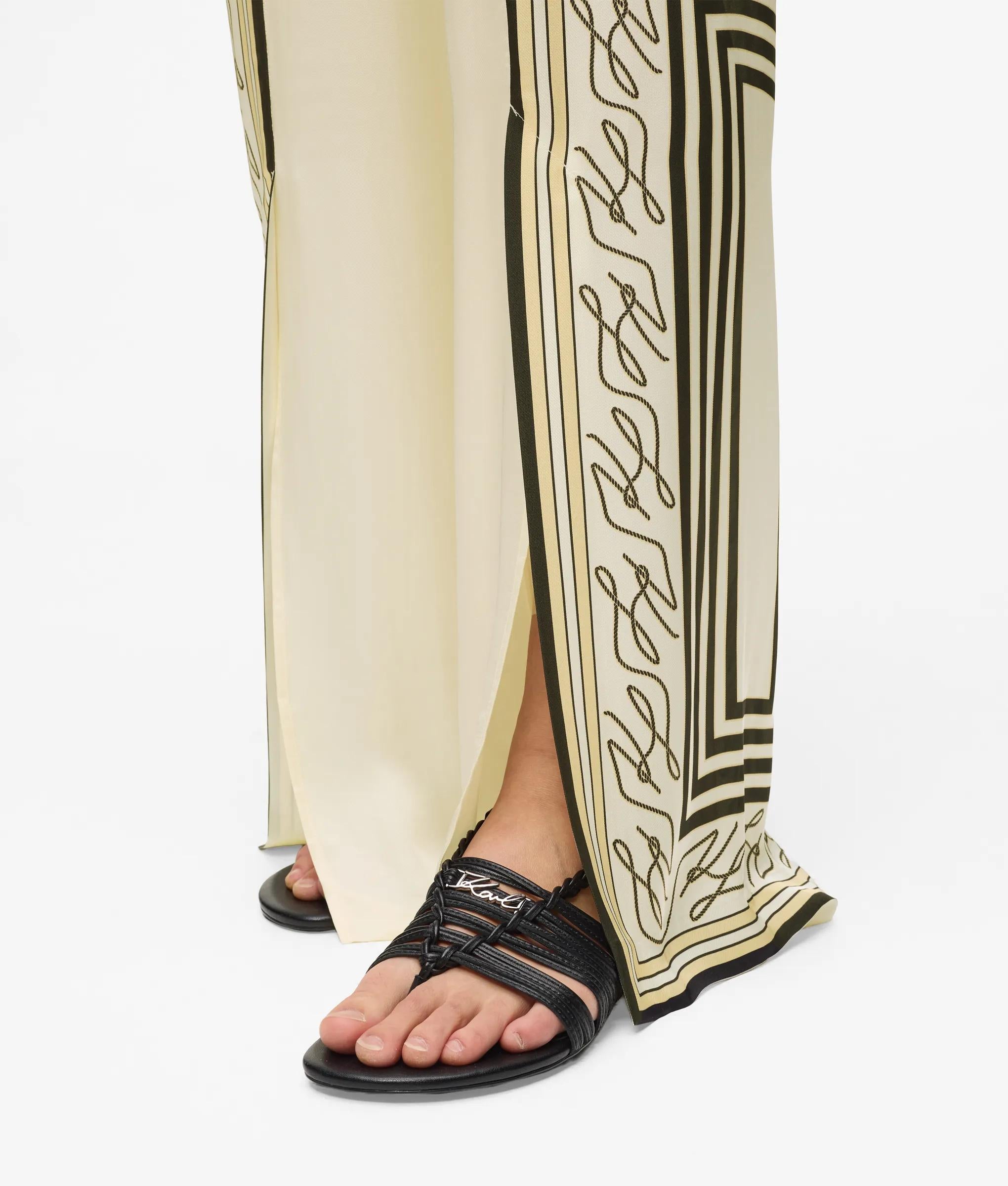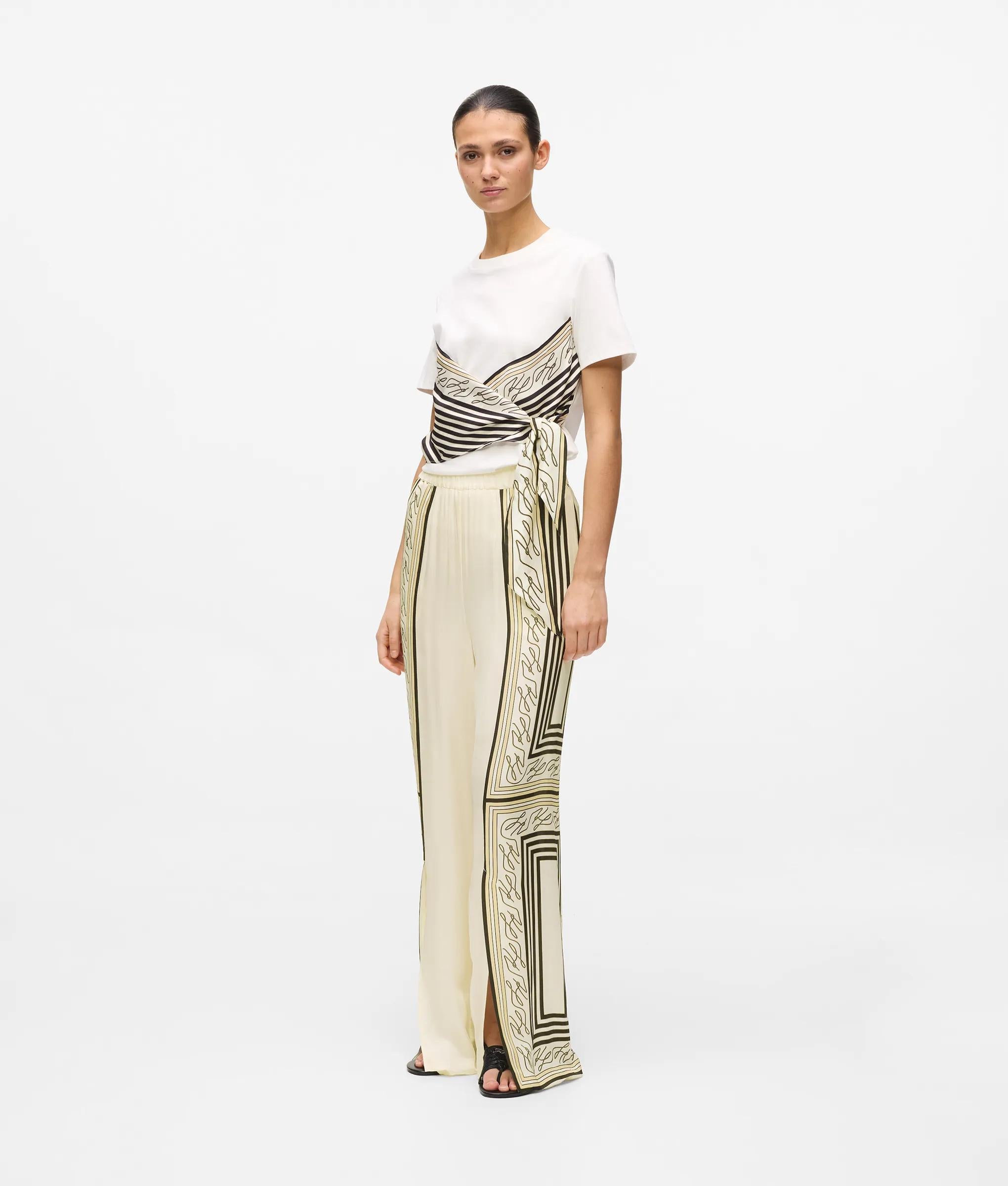 Die fließende, weite Silhouette mit Schlitzen vorne am Saum sorgt für bequeme Bewegungsfreiheit bei dieser Pyjamahose. Der elastische Bund biete Tragekomfort, während der auffällige Autograph-Schalprint die Hose zum Blickfang macht.