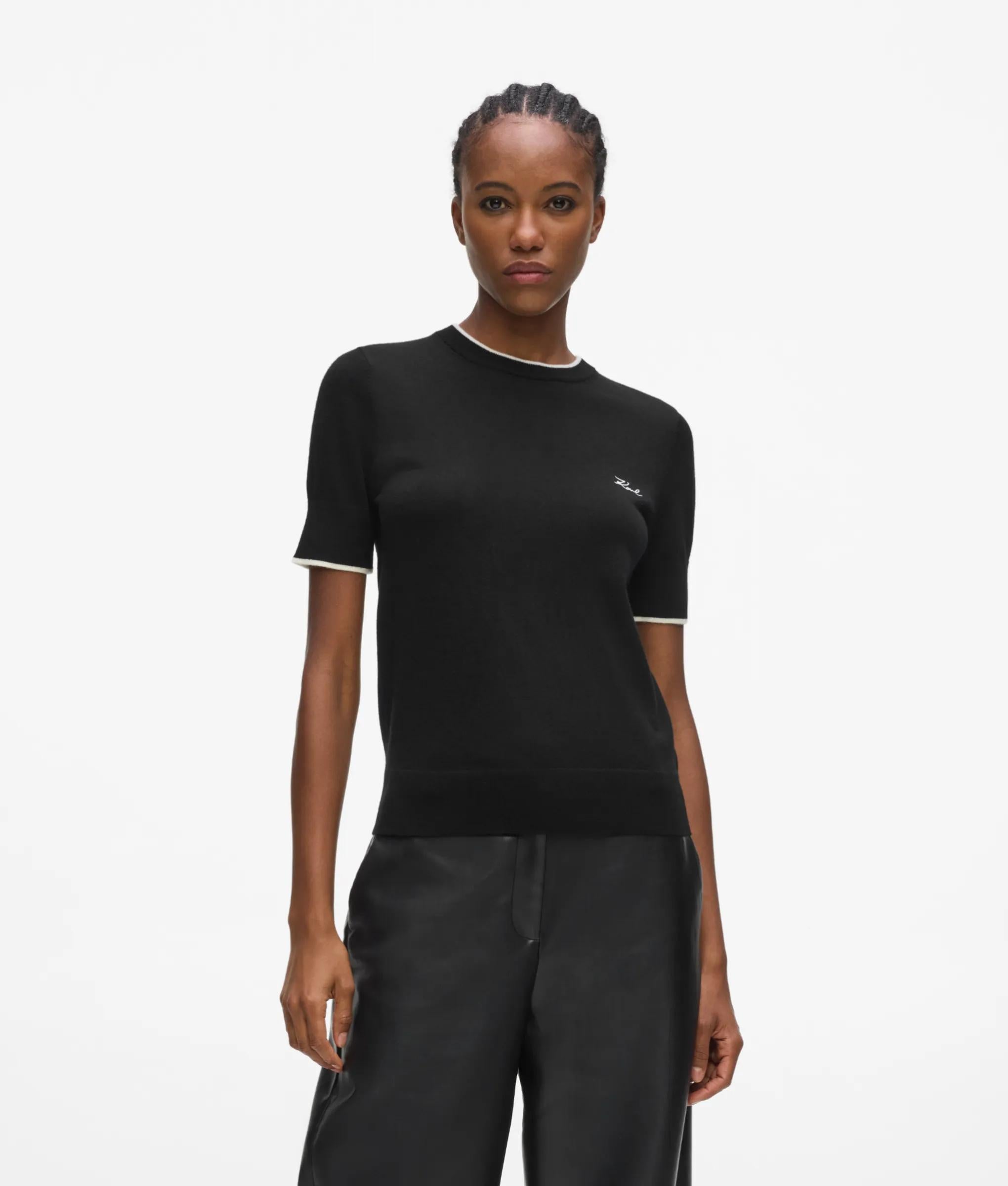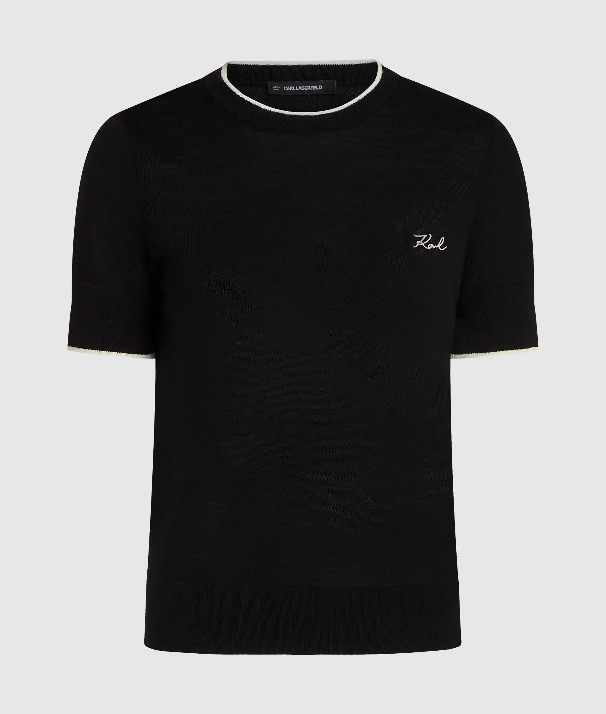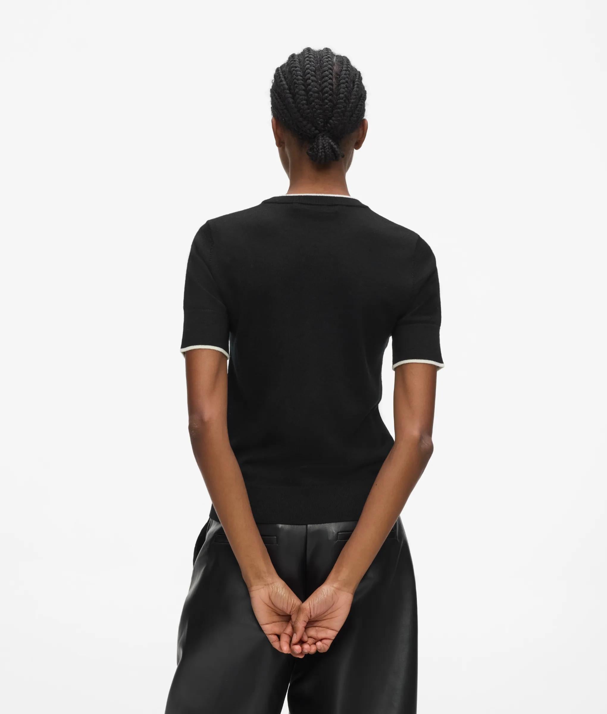 Dieses T-Shirt verleiht einem Kleiderschrank dezente Eleganz. Es ist aus luxuriös weicher Merinowolle gefertigt und mit kontrastierenden Paspeln am Halsausschnitt und an den Bündchen versehen.