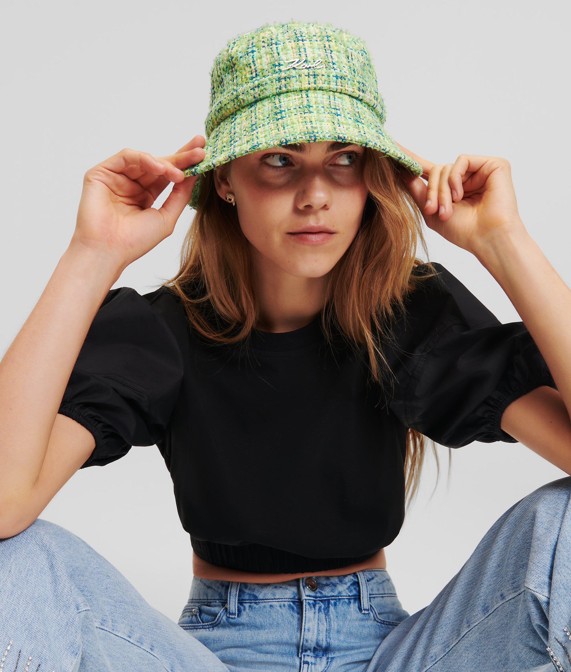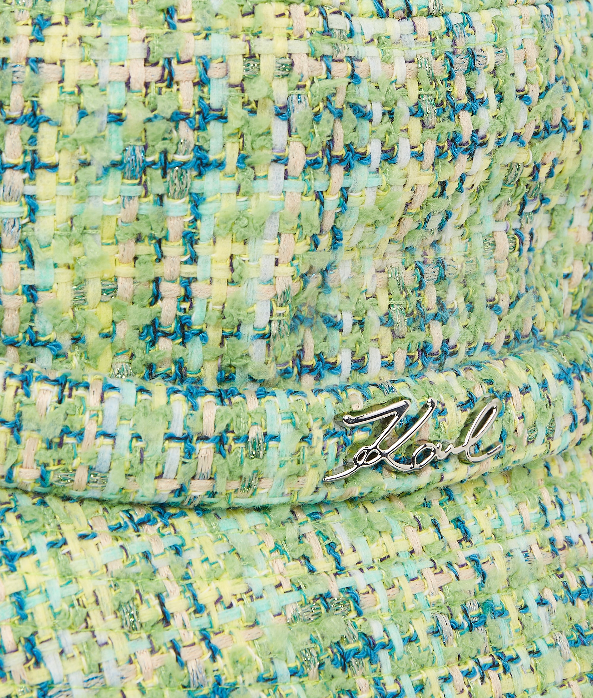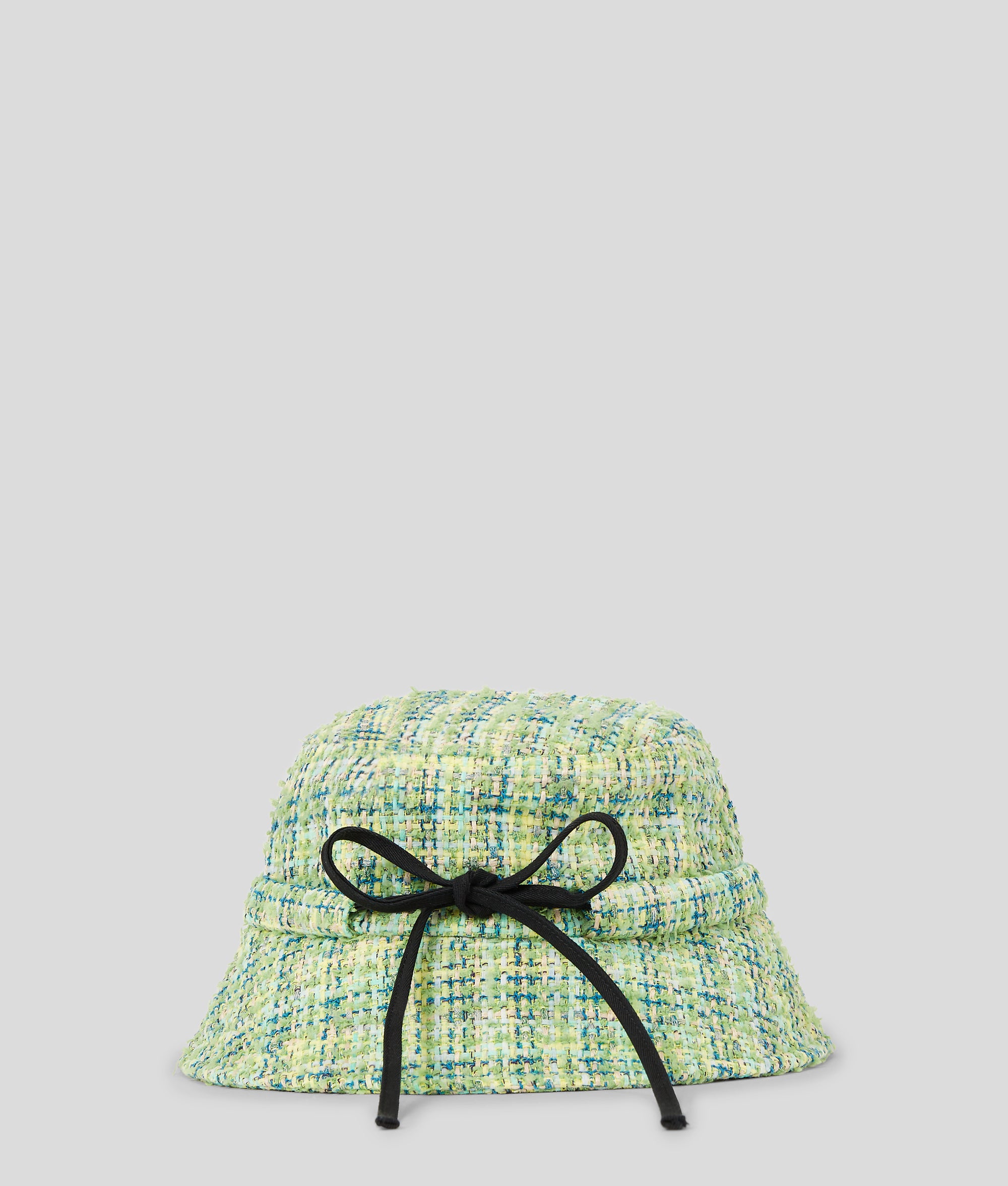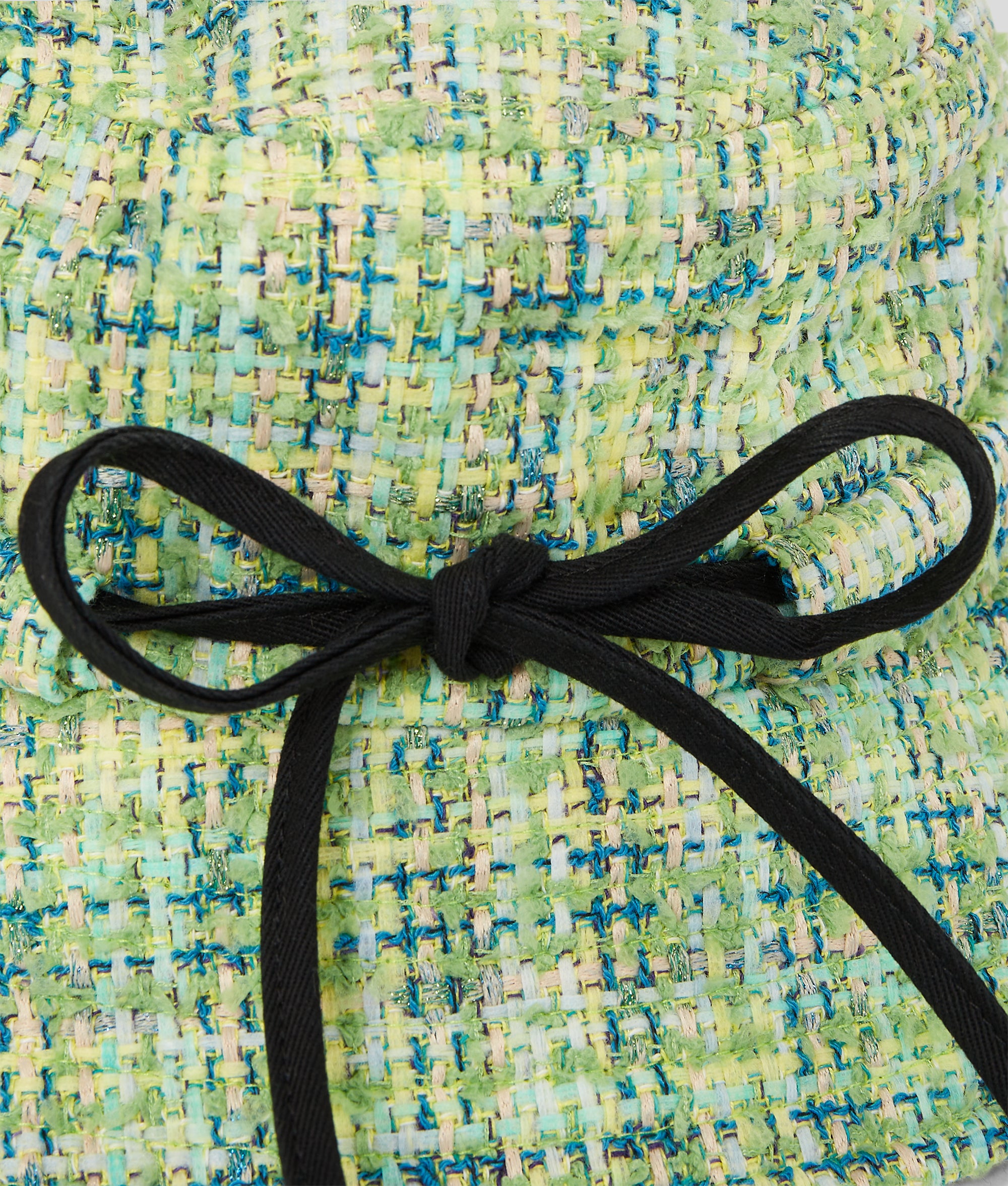 Edles mehrfarbiges Bouclé und ein zartes Schleifendetail verleihen diesem retro-coolen Bucket Hat einen Hauch von Eleganz.