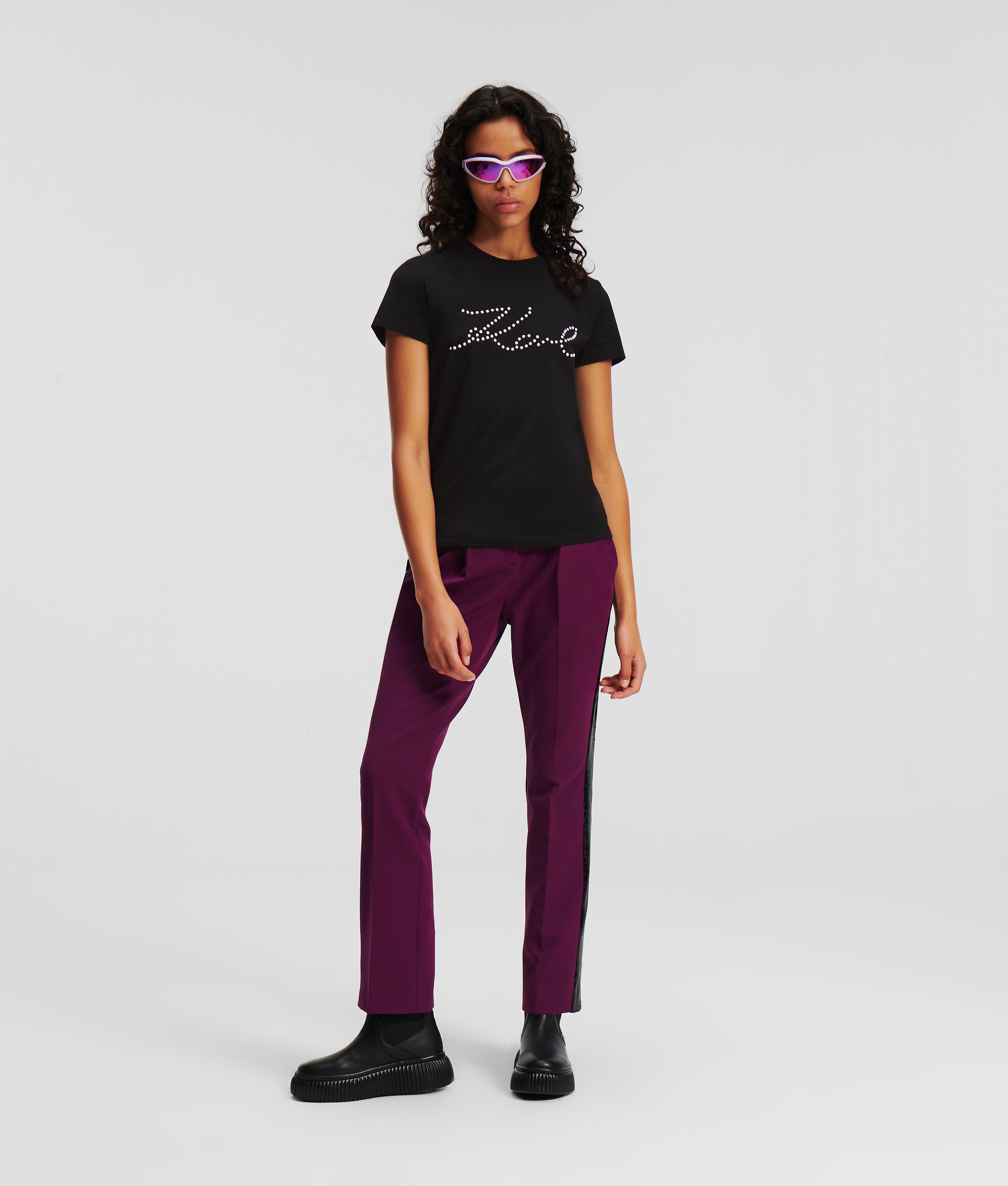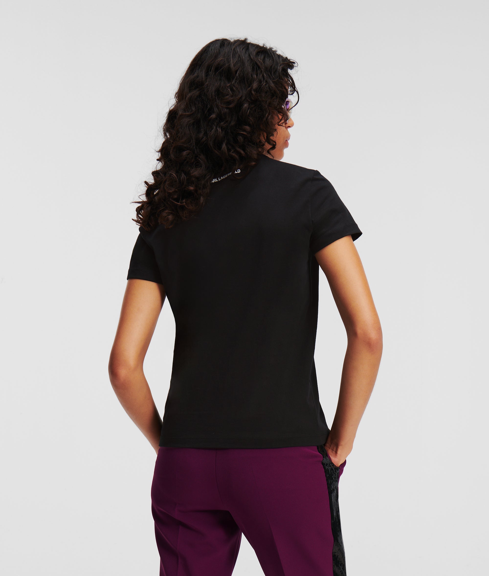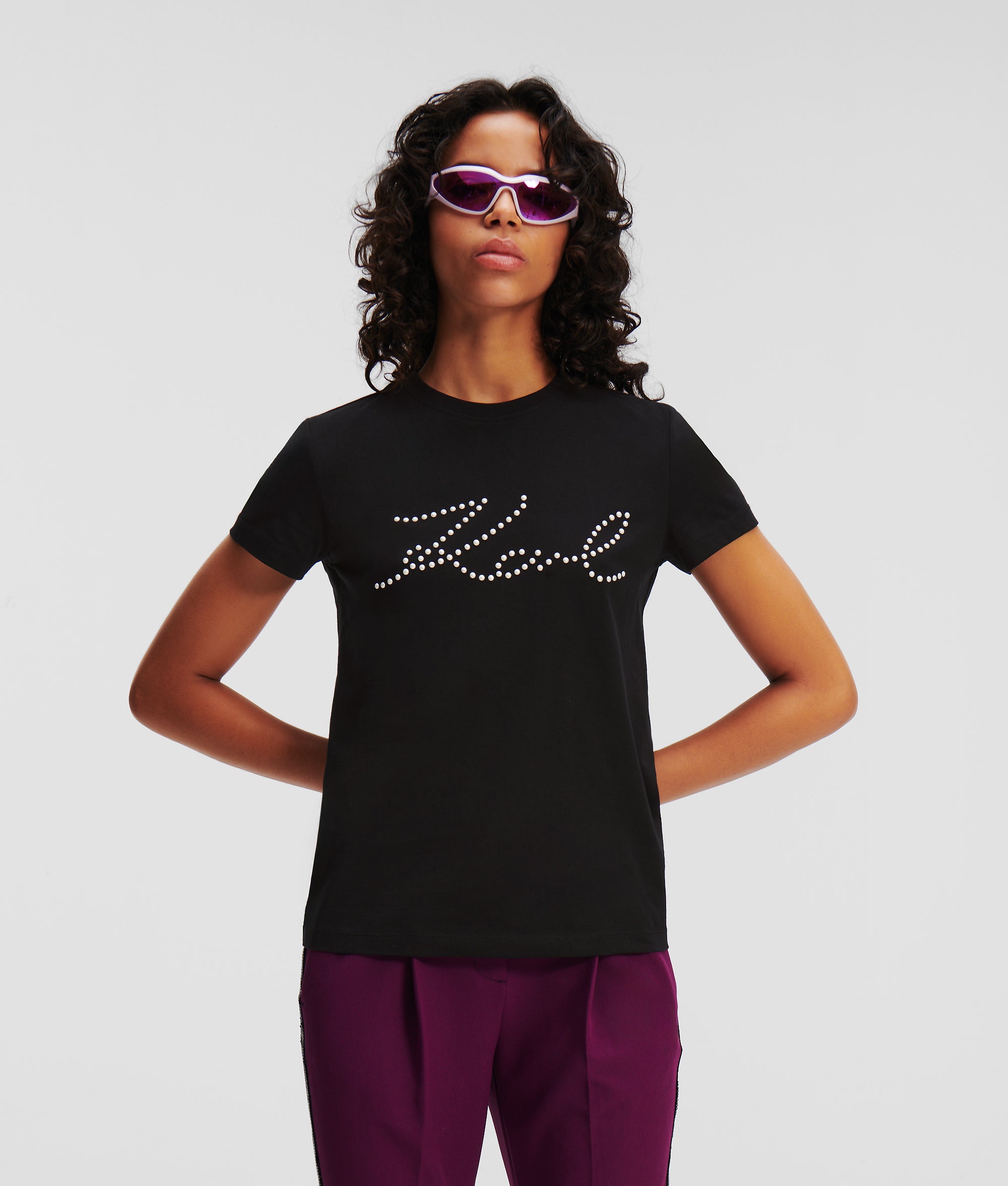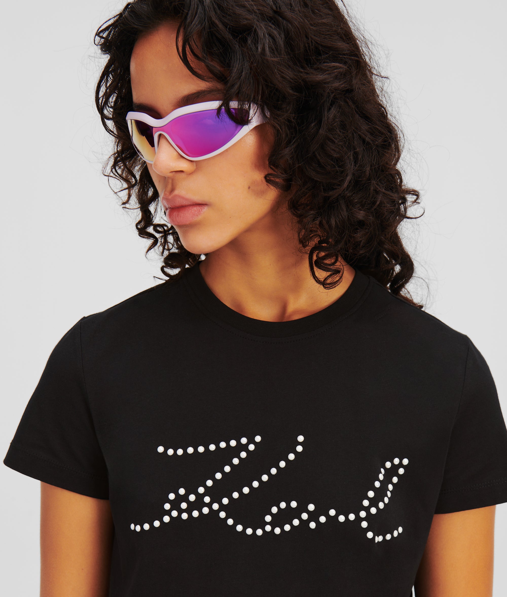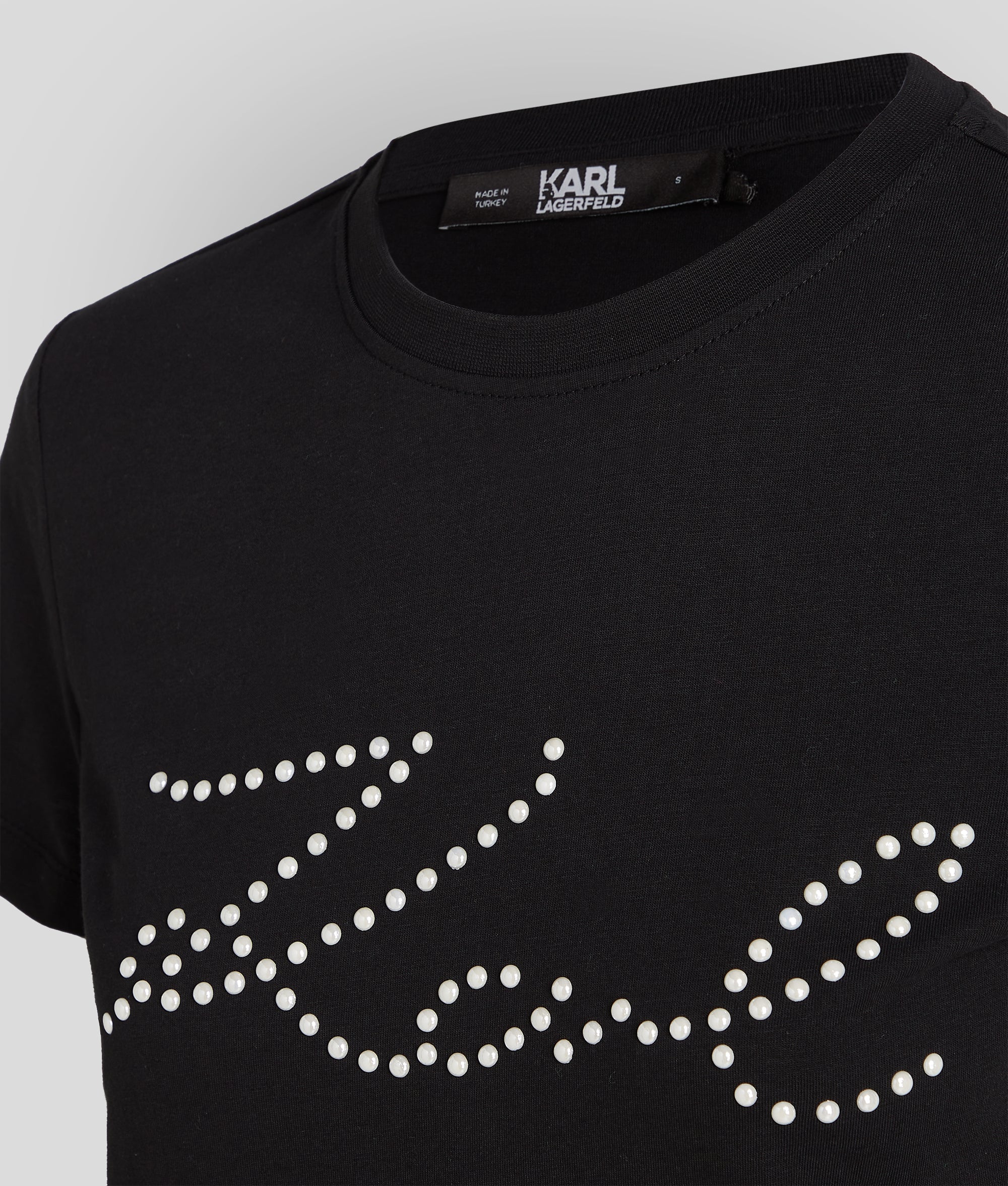 Dieses T-Shirt aus Bio-Baumwolle mit einem zeitlosen Rundhalsausschnitt wird durch eine mit Perlen verzierte KARL Signatur-Grafik auf der Brust veredelt.