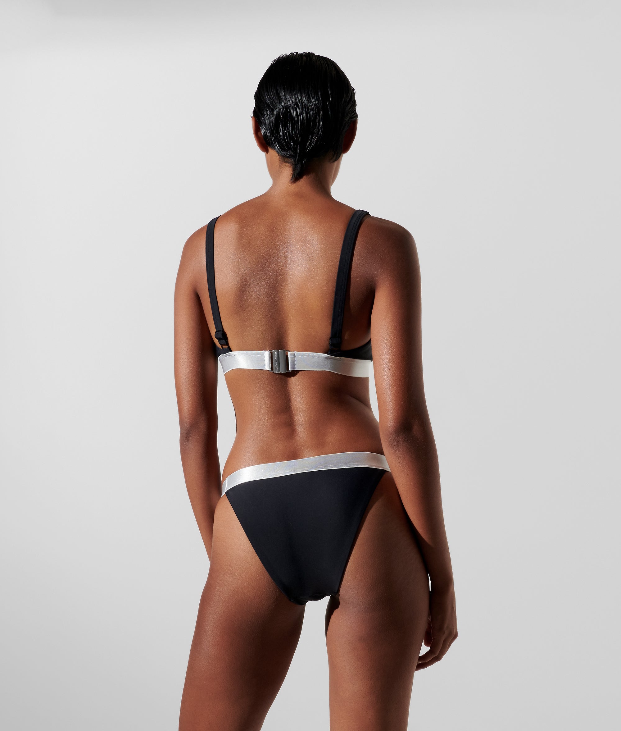 Dieses tief ausgeschnittene Triangel-Bikini-Oberteil bietet durch seine herausnehmbaren, gepolsterten Cups eine individuelle Passform. Verstellbare Schulterriemen und ein sicherer Schnallenverschluss sorgen für zusätzlichen Komfort, während das Brustband mit Logo für einen Hauch von KARL-Exklusivität sorgt.