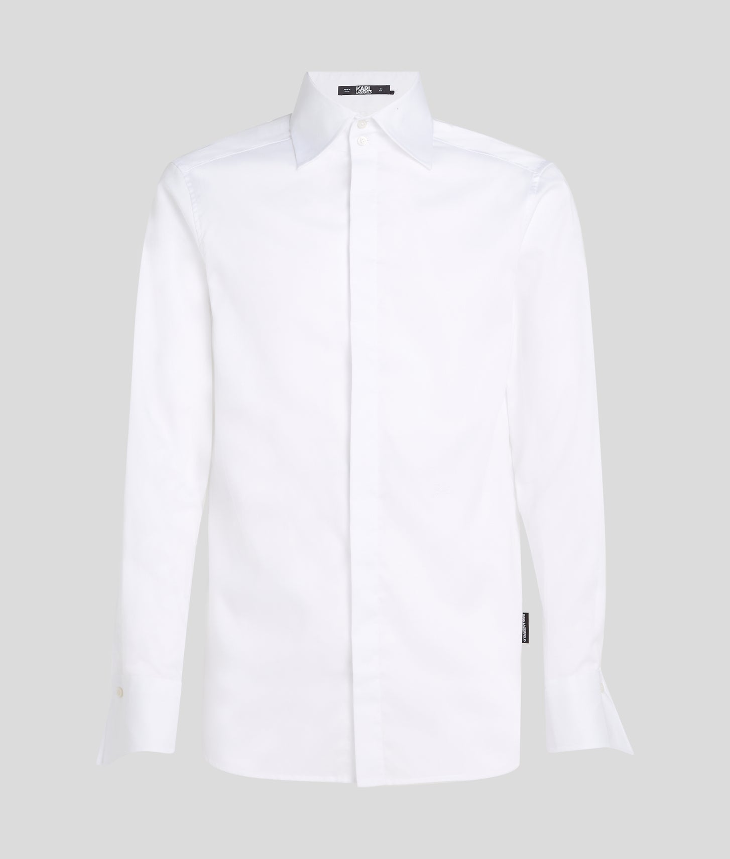 Timeless tailoring meets statement detailing in the quintessential KARL LAGERFELD shirt, featuring a hidden button placket, statement high-stand collar, and exaggerated sleeve cuffs. An indispensable wardrobe classic, masterfully tailored from organic cotton poplin.