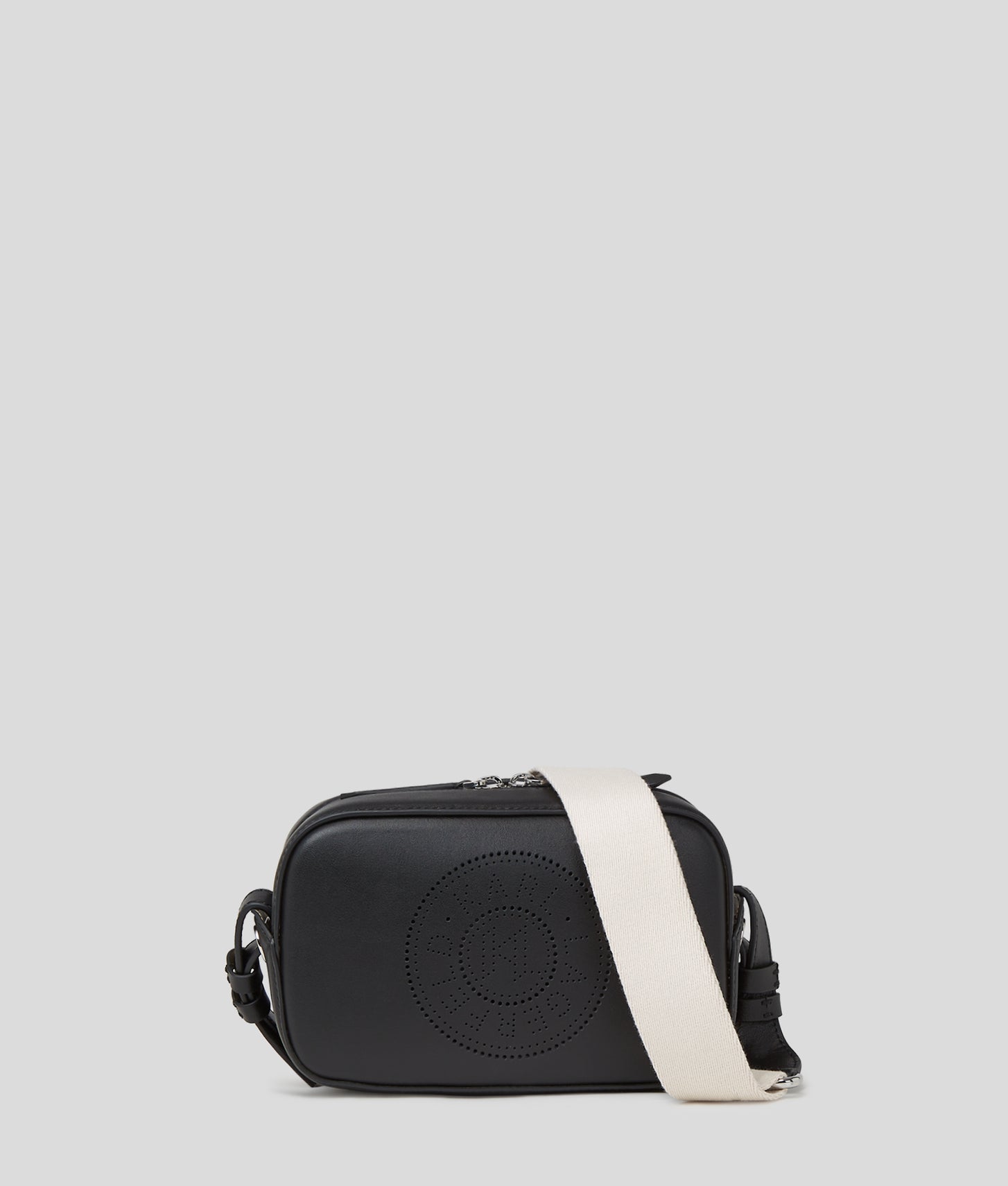 Made from supple leather, the K/Circle crossbody bag boasts a sleek camera silhouette, zip-around closure, and a branded webbing strap. The front features distinctive perforated KARL Circle artwork.