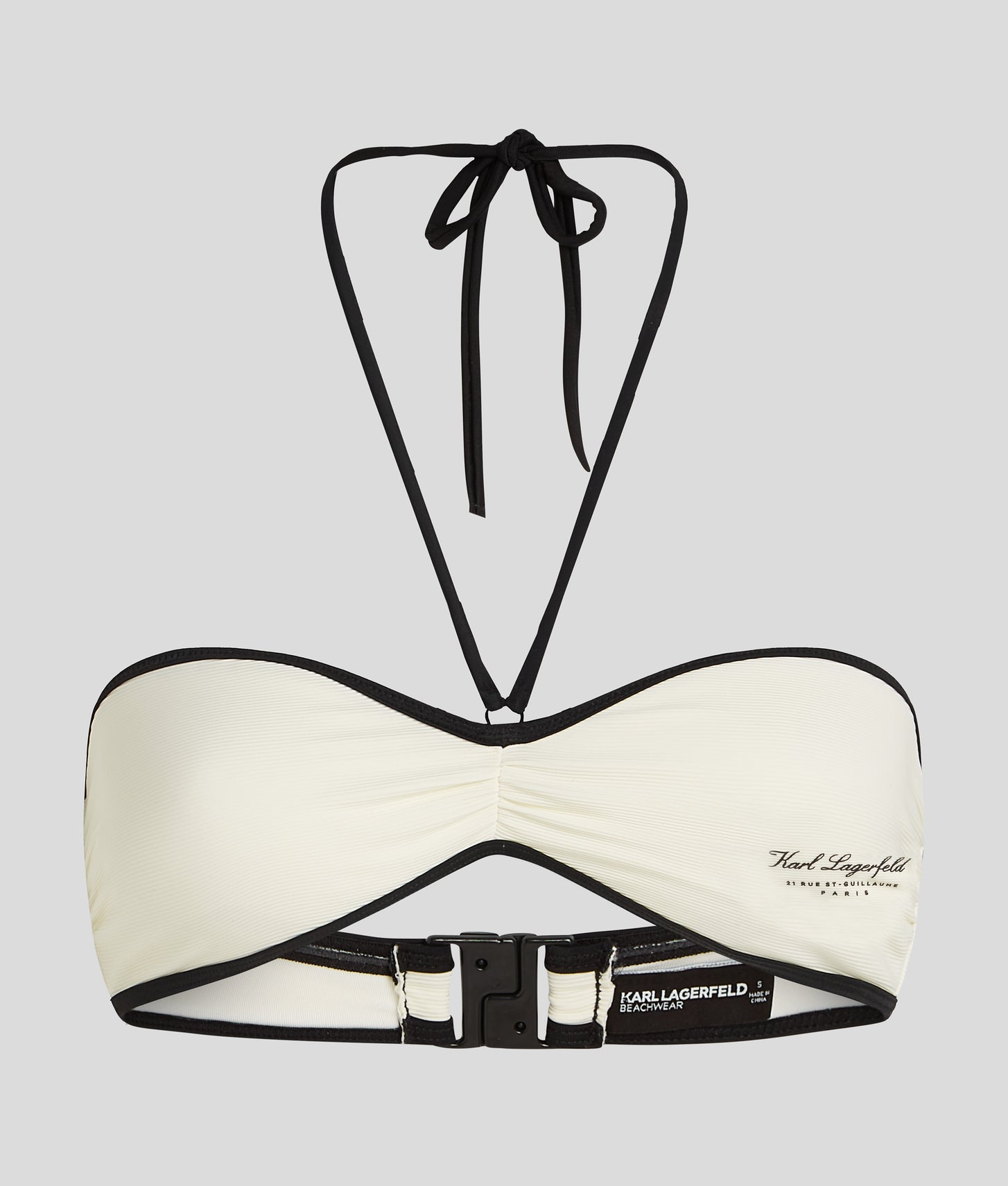 Exude poolside elegance in this chic bandeau bikini top. The halter neck detail and clasp closure provide a secure fit, while the beautiful rib fabrication, statement binding and iconic Hotel KARL embellishment add a touch of sophistication. Pair with the matching bikini bottoms for an effortless look.