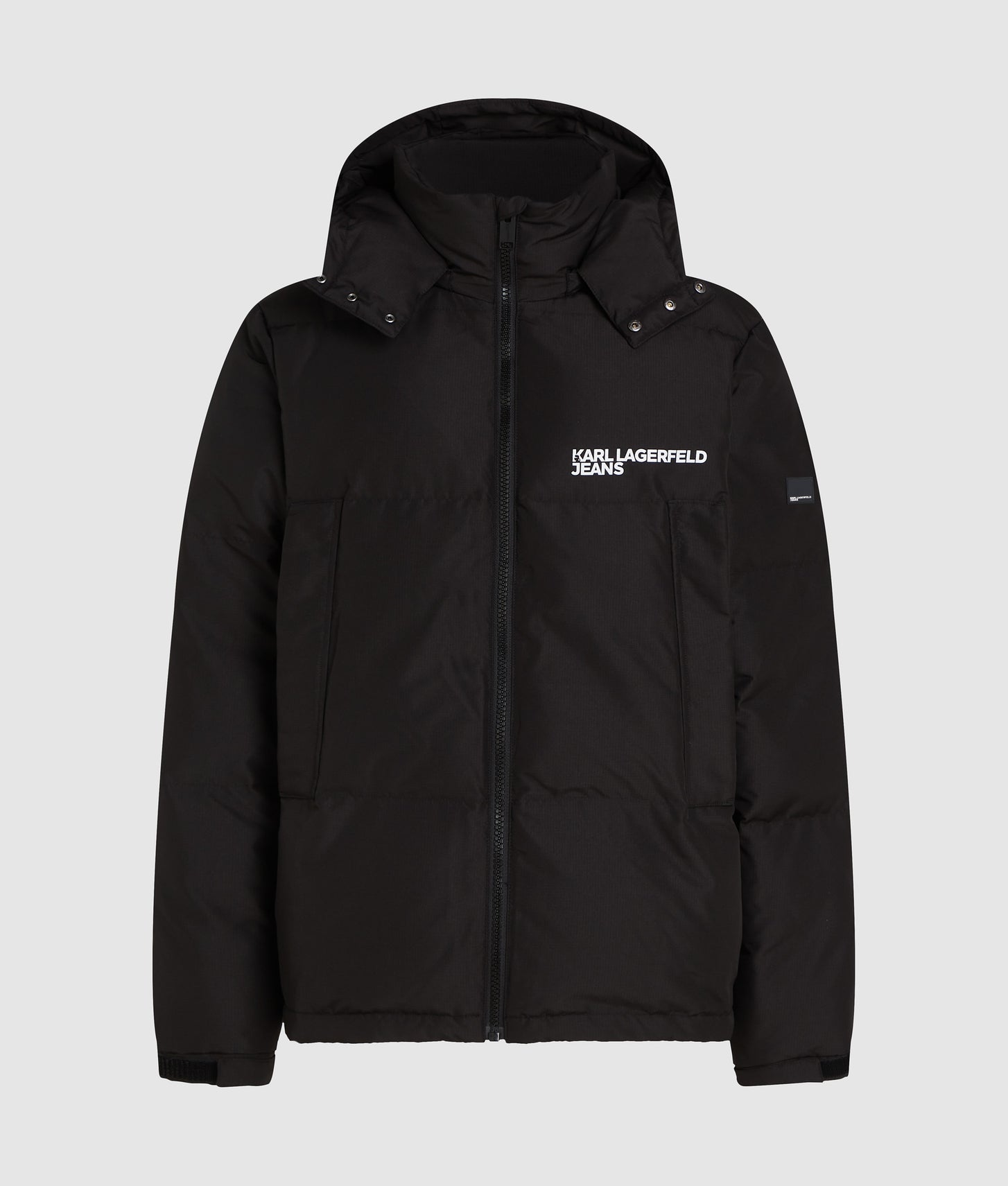 Embrace a street-style aesthetic with this puffer jacket, featuring a zip front closure that leads to a high funnel neck and a detachable hood for versatile styling. Practical zipped side pockets add functionality, while the bold KARL LAGERFELD JEANS logo makes a striking statement.
