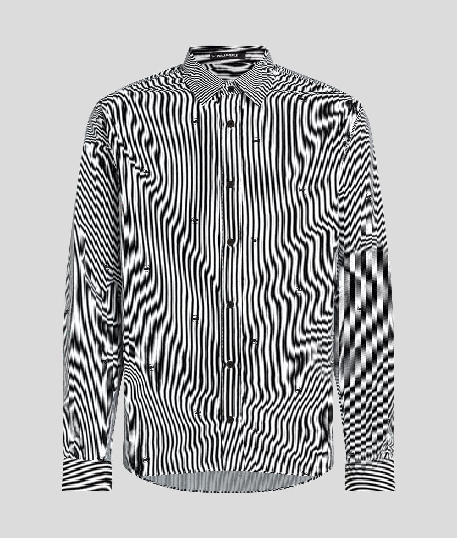 Make a statement with the Ikon Striped Shirt. Black smoke buttons add bold contrast to the classic striped design while an all-over Ikon design offers a playful twist to a wardrobe staple. Team yours with sleek denim for everyday style or pair it with tailored pants for a contemporary take on tailoring.