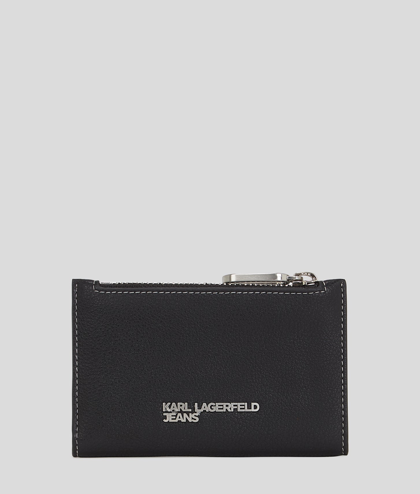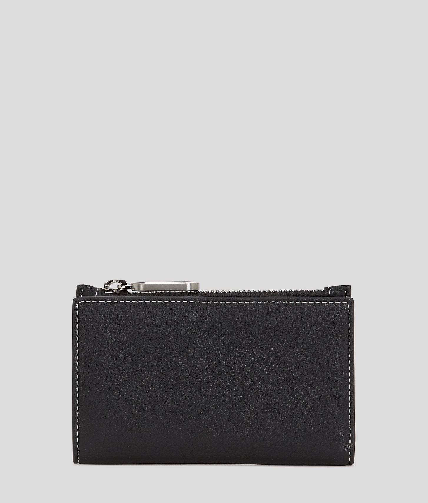 Discover a pocket-friendly bifold wallet that effortlessly combines functionality and style. Featuring a secure press stud closure, it offers a zipped compartment and multiple card slots for seamless organization. The striking metal KARL LAGERFELD JEANS logo adds a bold touch, while contrast stitching elevates its design.