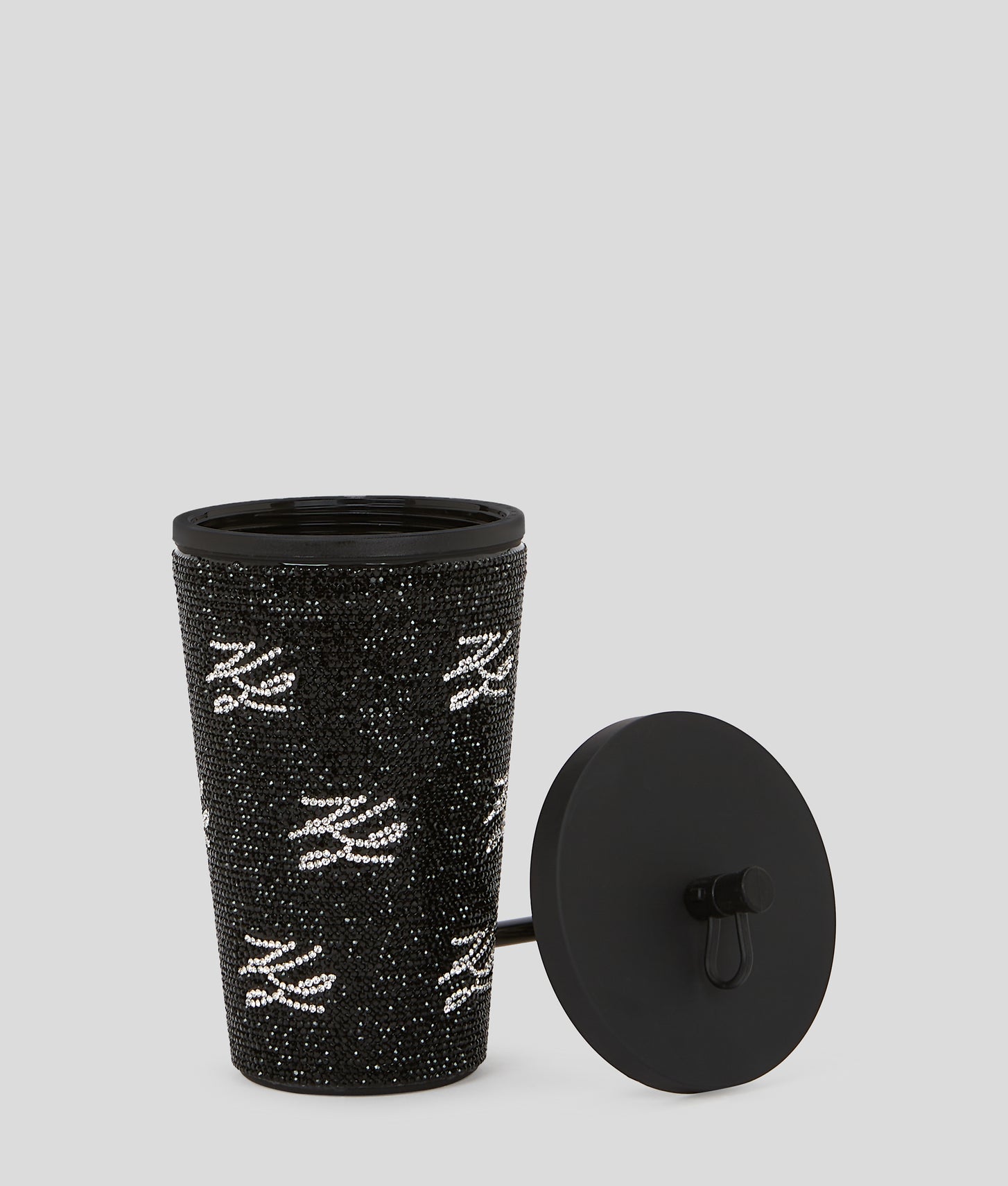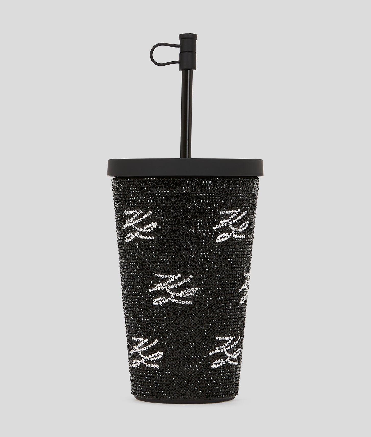 Add a touch of glamour to your daily routine with this stylish to-go cup, adorned with a striking all-over KARL Autograph logo design and sparkling rhinestones. Featuring a removable lid and straw cap, it combines practicality with a chic flair, perfect for on-the-go hydration.