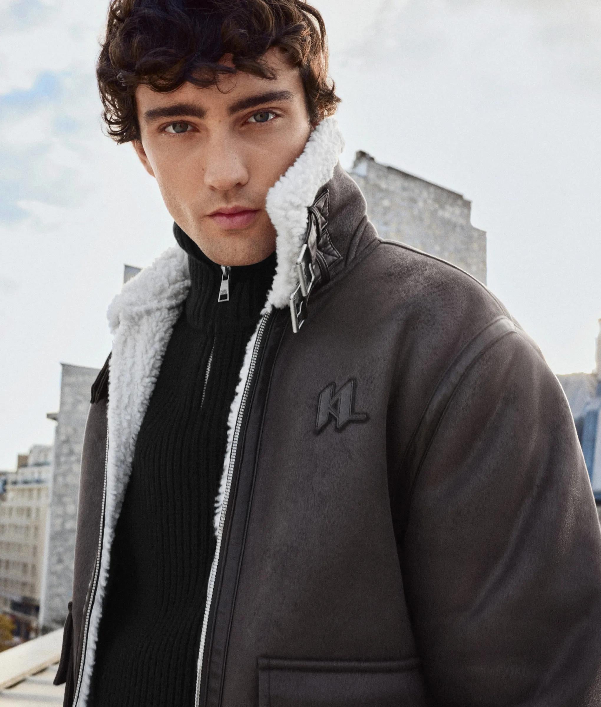 This timeless faux suede jacket combines urban edge with cozy warmth, featuring a faux shearling lining and aviator collar. The KL Monogram adds a signature touch of style.