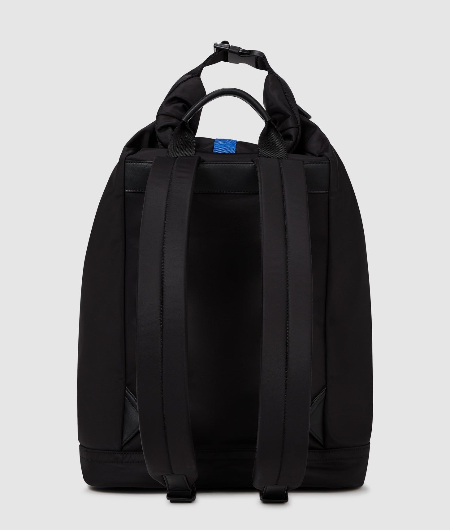 A roomy backpack reimagined with utilitarian accents, making this bag a statement piece. Featuring a zip closure that can be brought together with a buckle, and a bold webbing strap detail with loops and a carabiner clip for easy attachment.