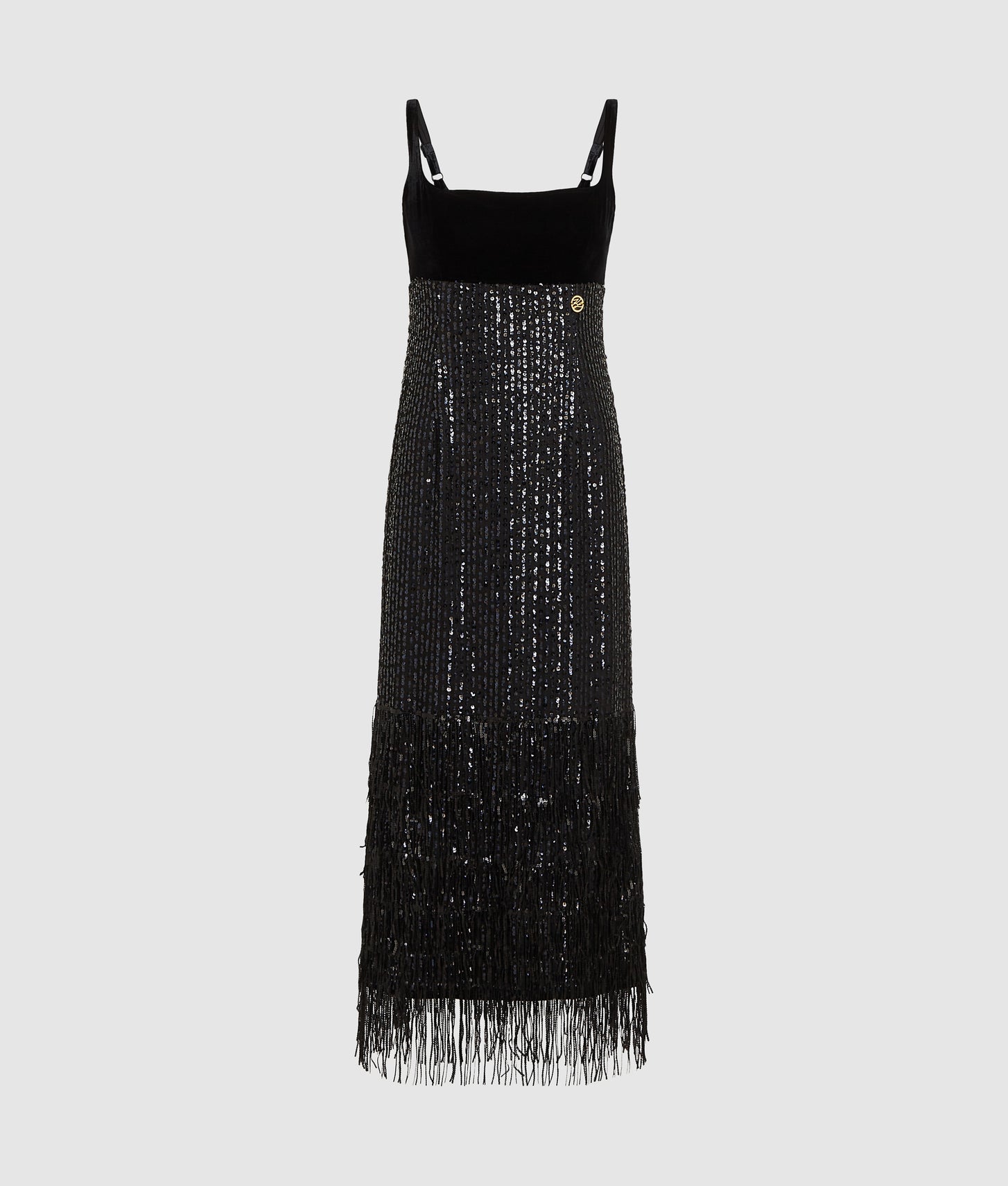 Turn heads this party season in this striking midi dress, featuring a velvet bodice with a sequinned skirt and cascades of fringing. Adjustable straps offer a personalized fit and stretch fabric brings comfort to the sleek silhouette.