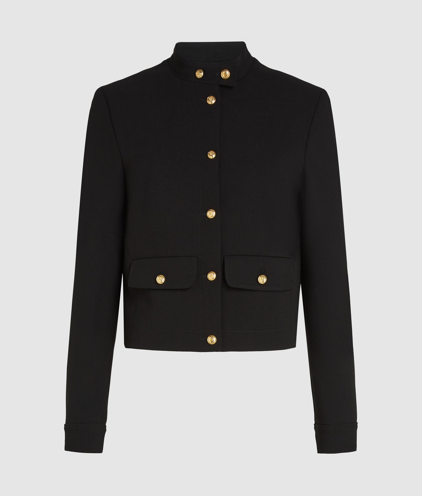 With its boxy shape, high stand collar, and gleaming gold buttons, this blouson jacket redefines casual sophistication. Style yours with the matching button-detail skirt for an undeniably chic pairing.