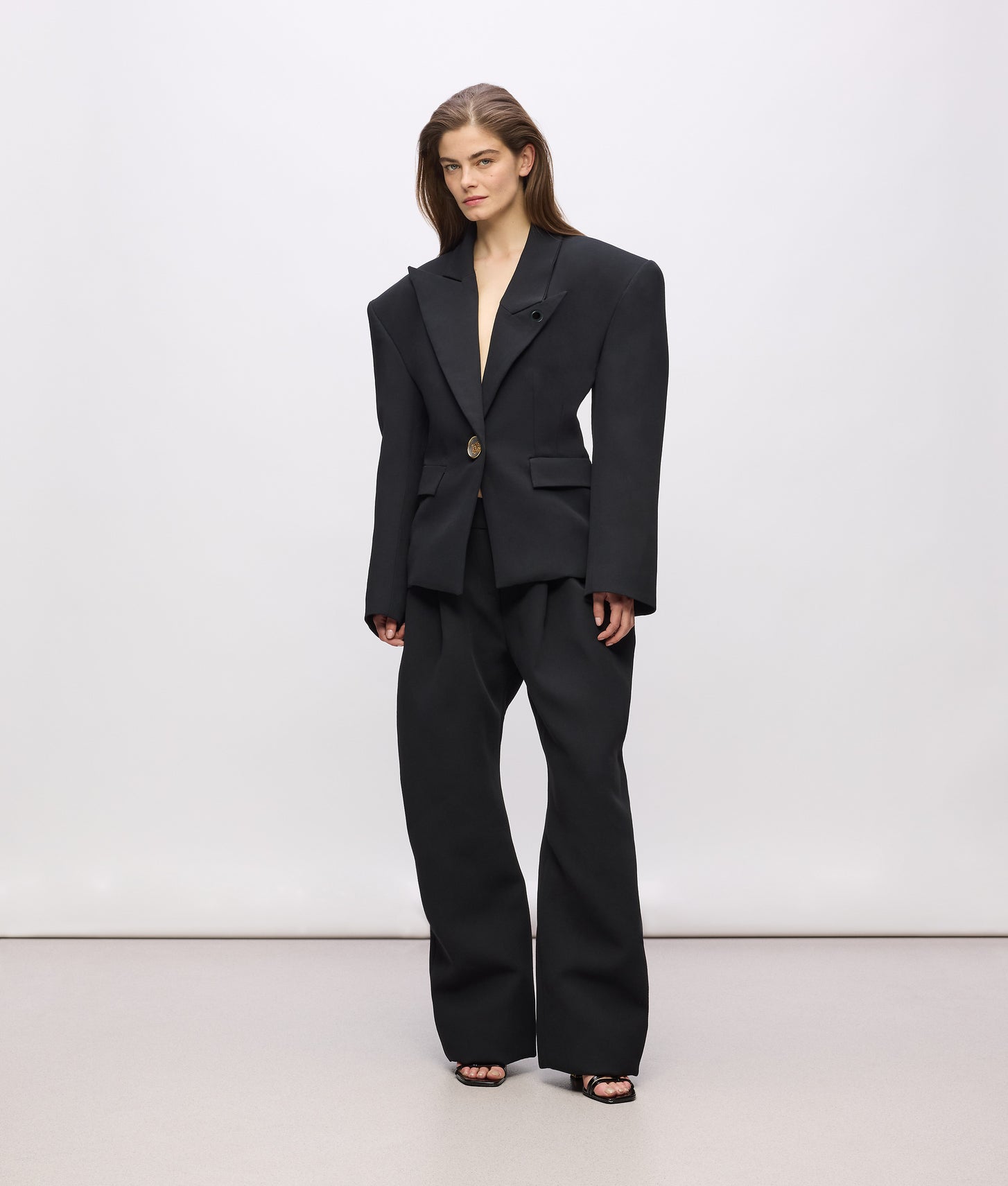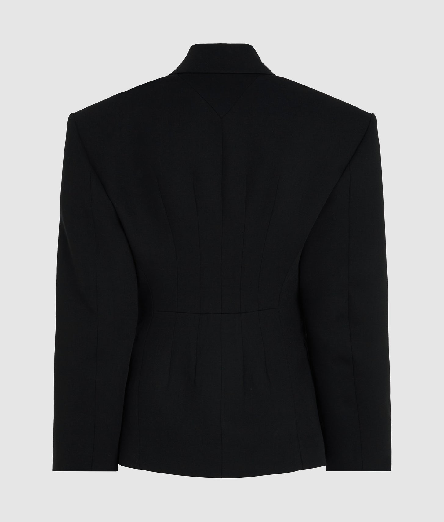 Architecture meets attitude. Sculptural, oversized shoulders and an ultra-cinched waist define this statement blazer, reflecting Karl Lagerfeld’s mastery of silhouette. Finished with an archive-inspired branded button, it’s drama, built stitch by stitch.