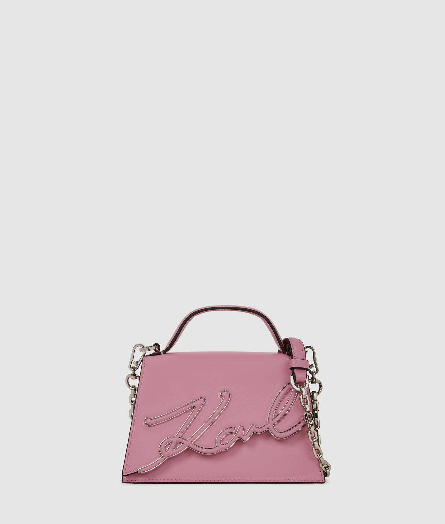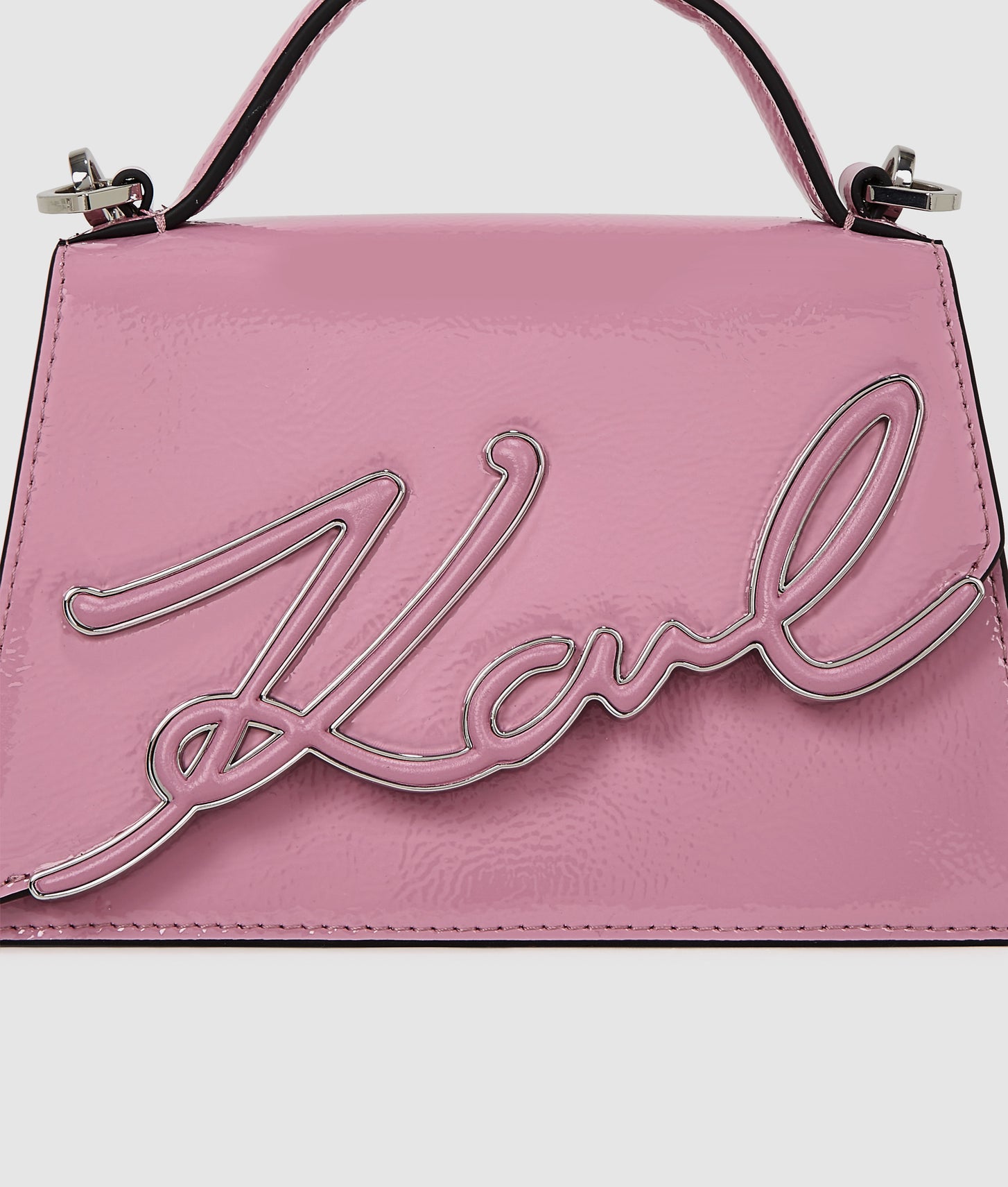 Elegant Karl Signature hardware adorns the closure of this sleek crossbody bag. Crafted in statement glossy leather, the statement accessory features a top handle and a detachable strap with chain detailing, adding a rock-chic edge.
