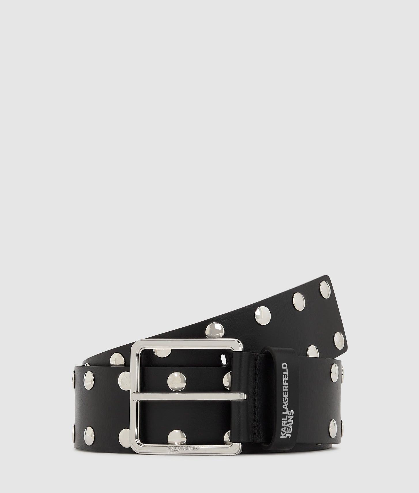 Rock-chic studs elevate this versatile leather belt, making it a striking addition to any outfit. An adjustable square buckle offers a personalized fit, while the piece is completed by a KARL LAGERFELD JEANS logo at the loop.