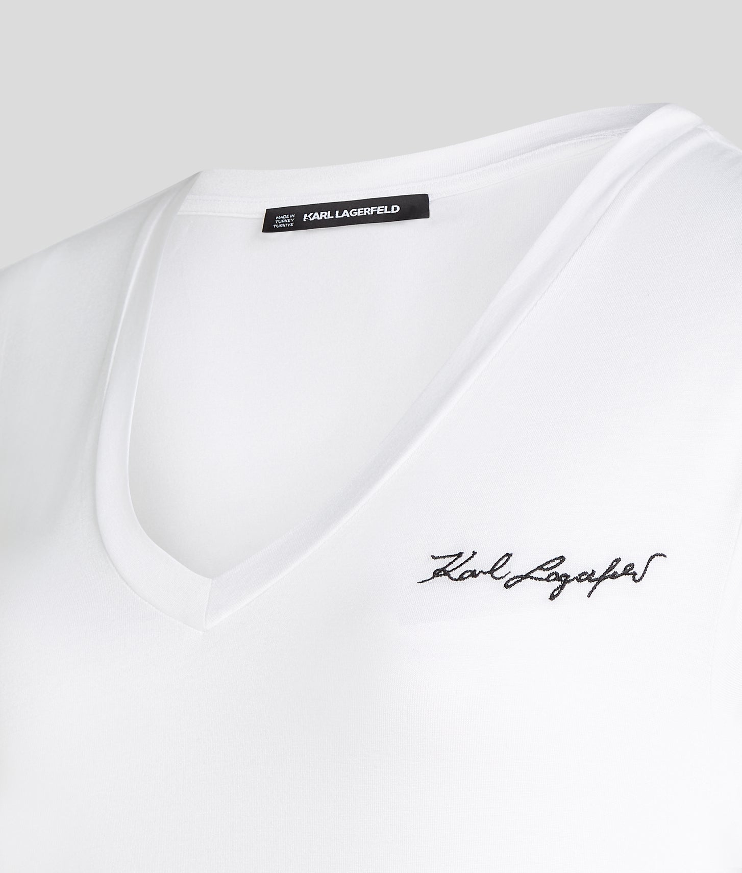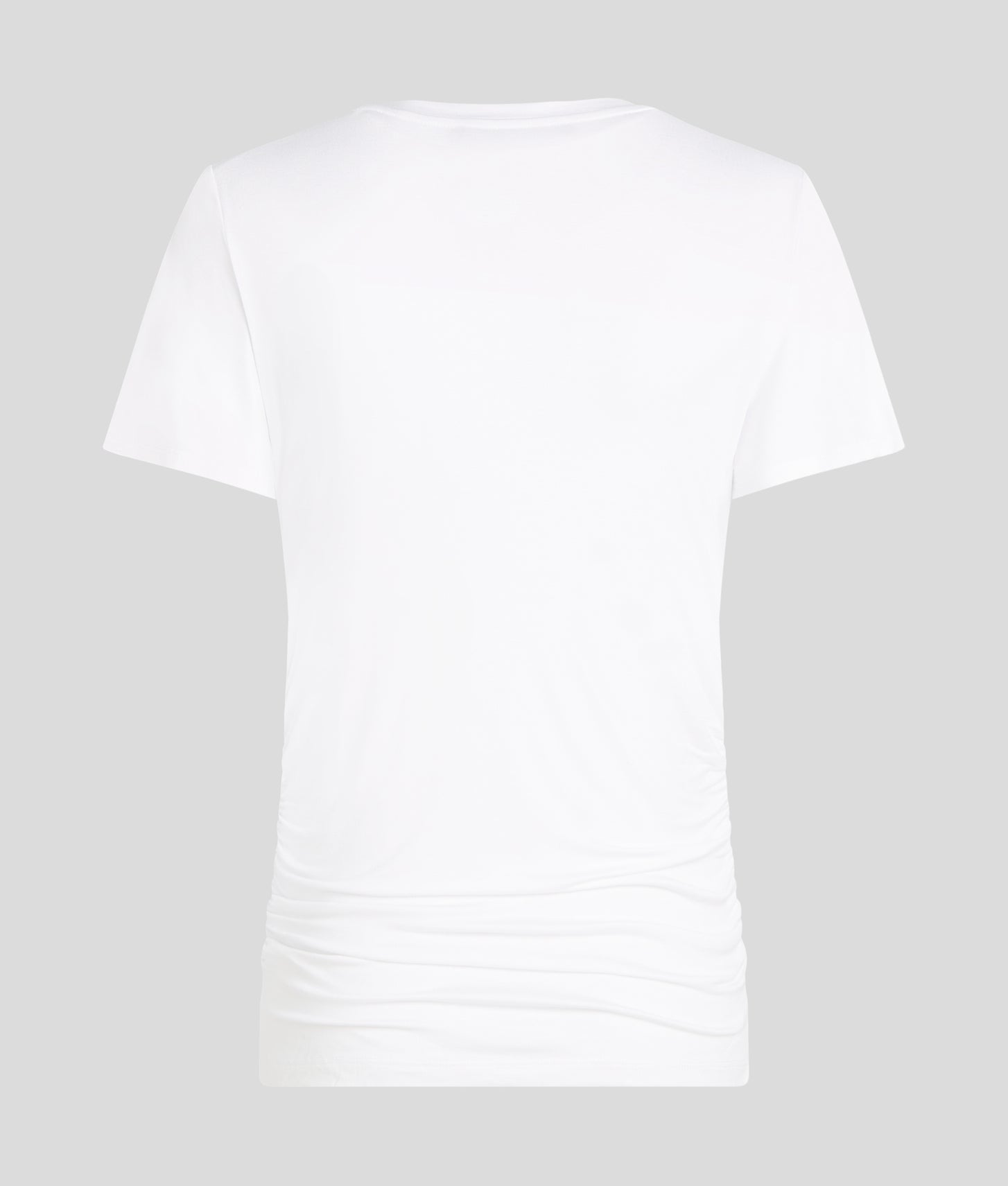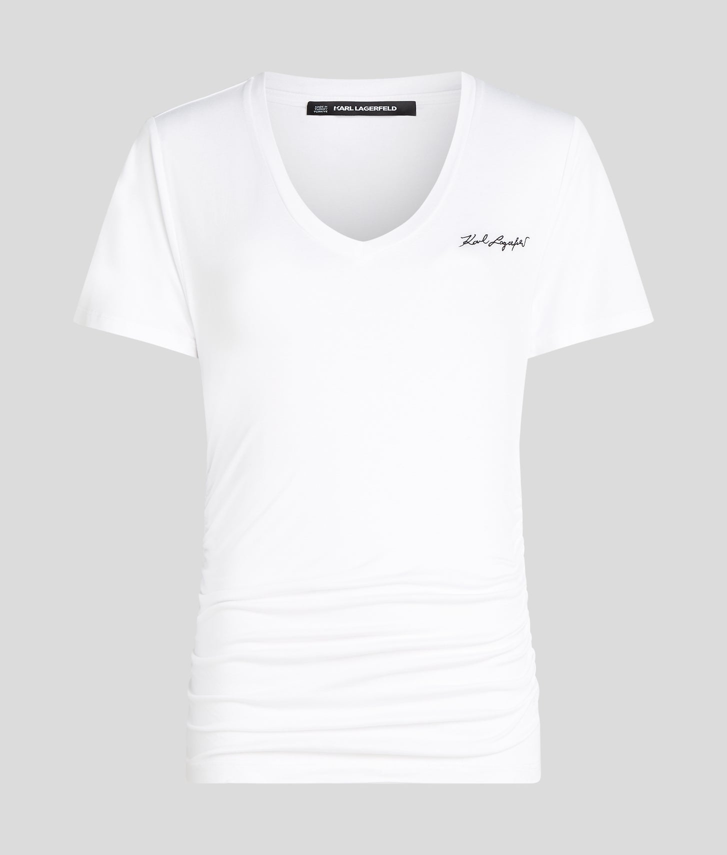 A refined take on casual wear, this V-neck T-shirt features an elegant neckline and flowing short sleeves. Ruching at the waist adds a flattering touch, while the embroidered KARL Signature artwork elevates its appeal.
