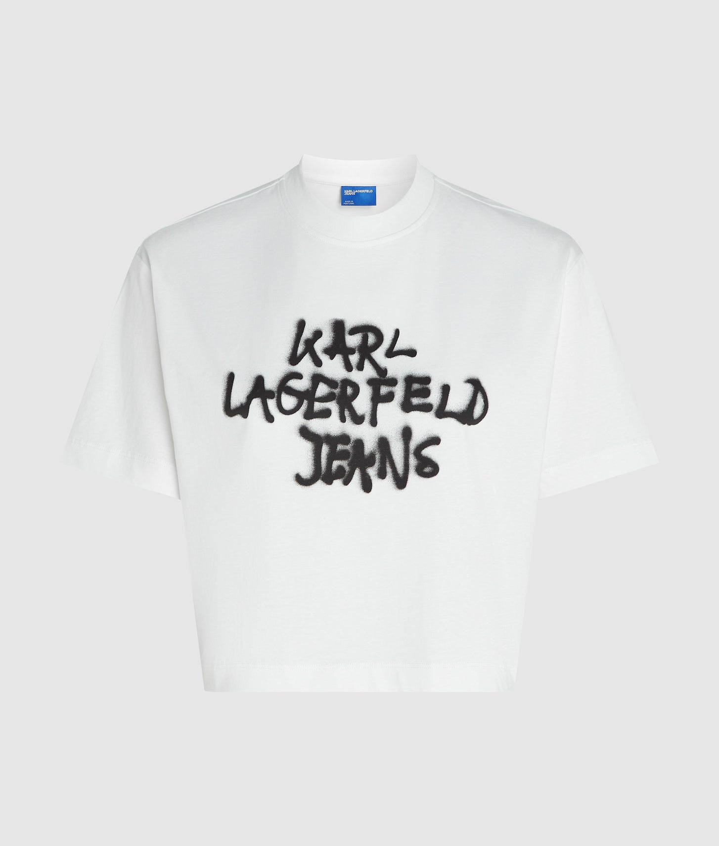 A classic T-shirt with street-ready energy. Cut cropped with a crew neck and short sleeves, this easy silhouette is instantly elevated by bold graffiti-style KARL LAGERFELD JEANS artwork across the chest.