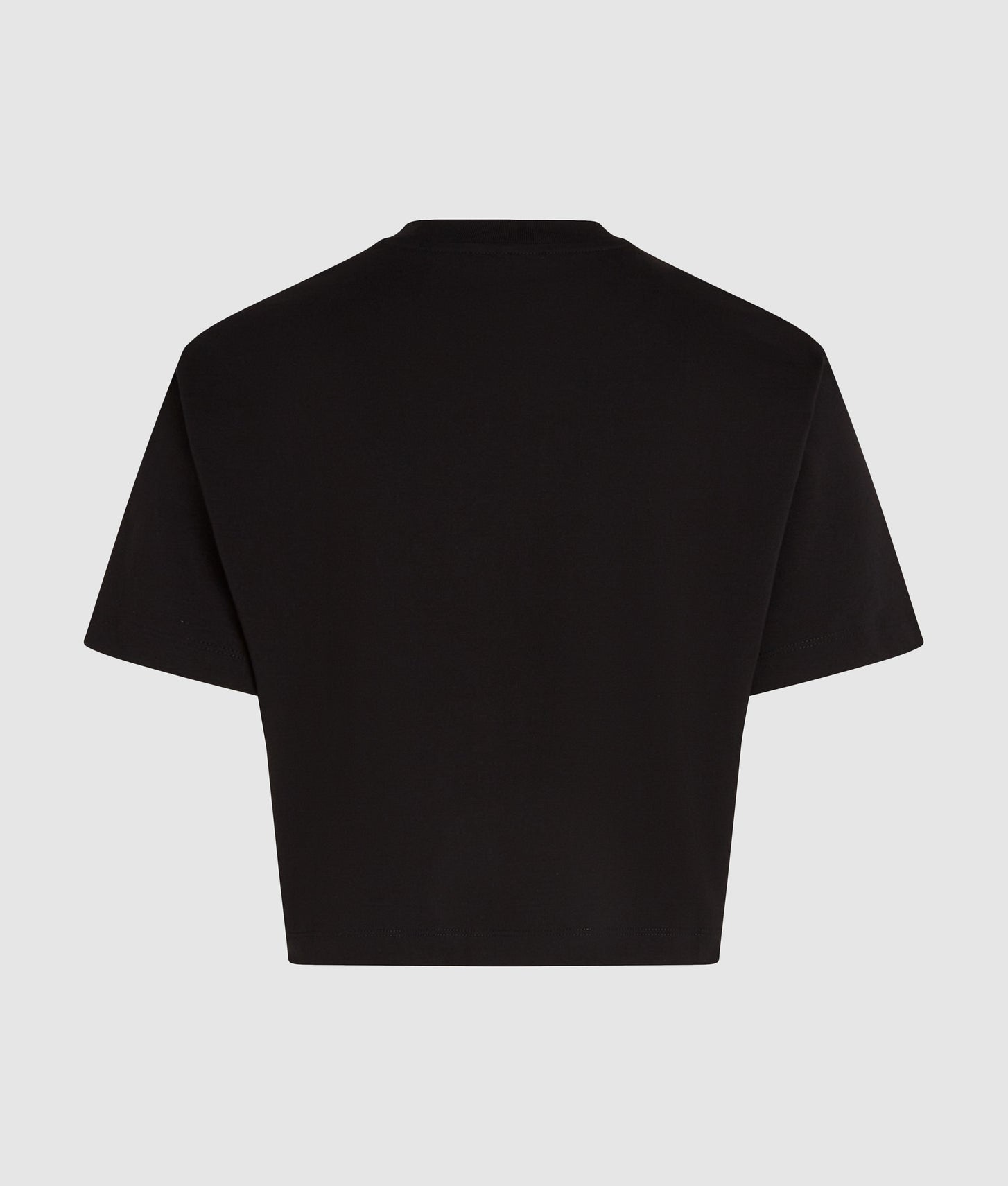 A classic T-shirt with street-ready energy. Cut cropped with a crew neck and short sleeves, this easy silhouette is instantly elevated by bold graffiti-style KARL LAGERFELD JEANS artwork across the chest.