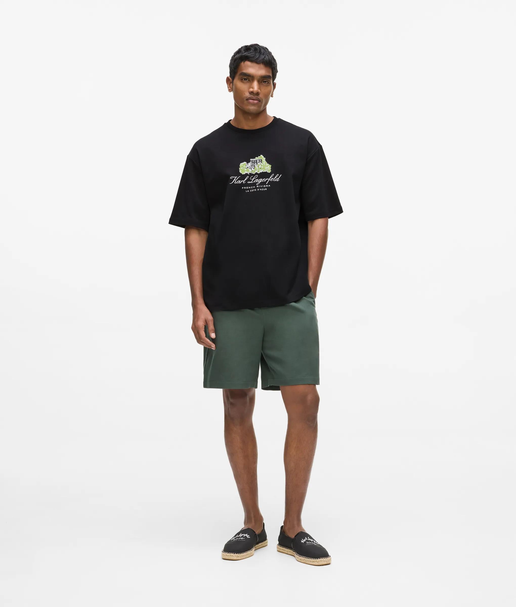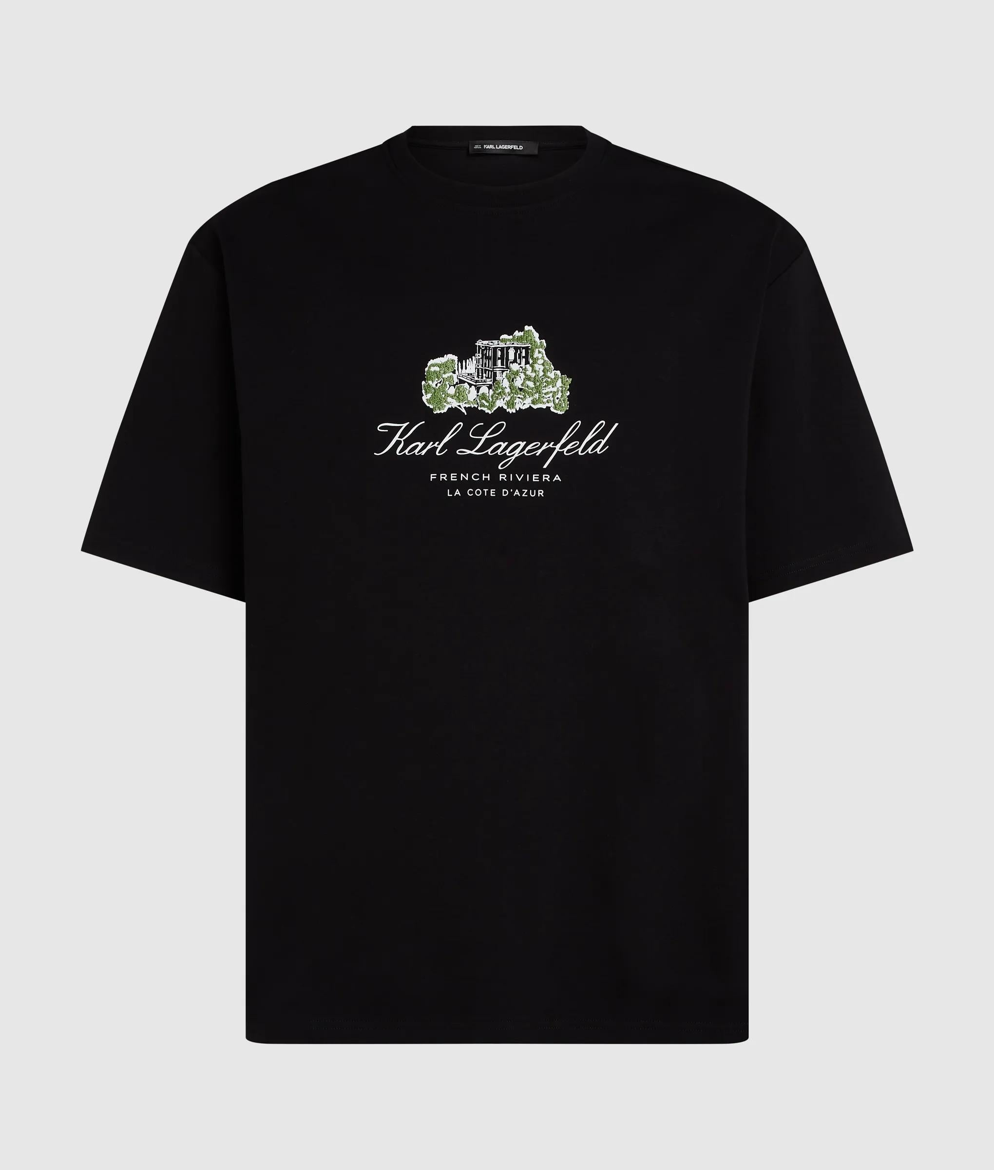 A relaxed T-shirt shaped in breezy organic cotton offers a soft touch against the skin. The classic crew neck frames artwork inspired by the Villa La Vigie, inviting a subtle nod to Riviera charm.