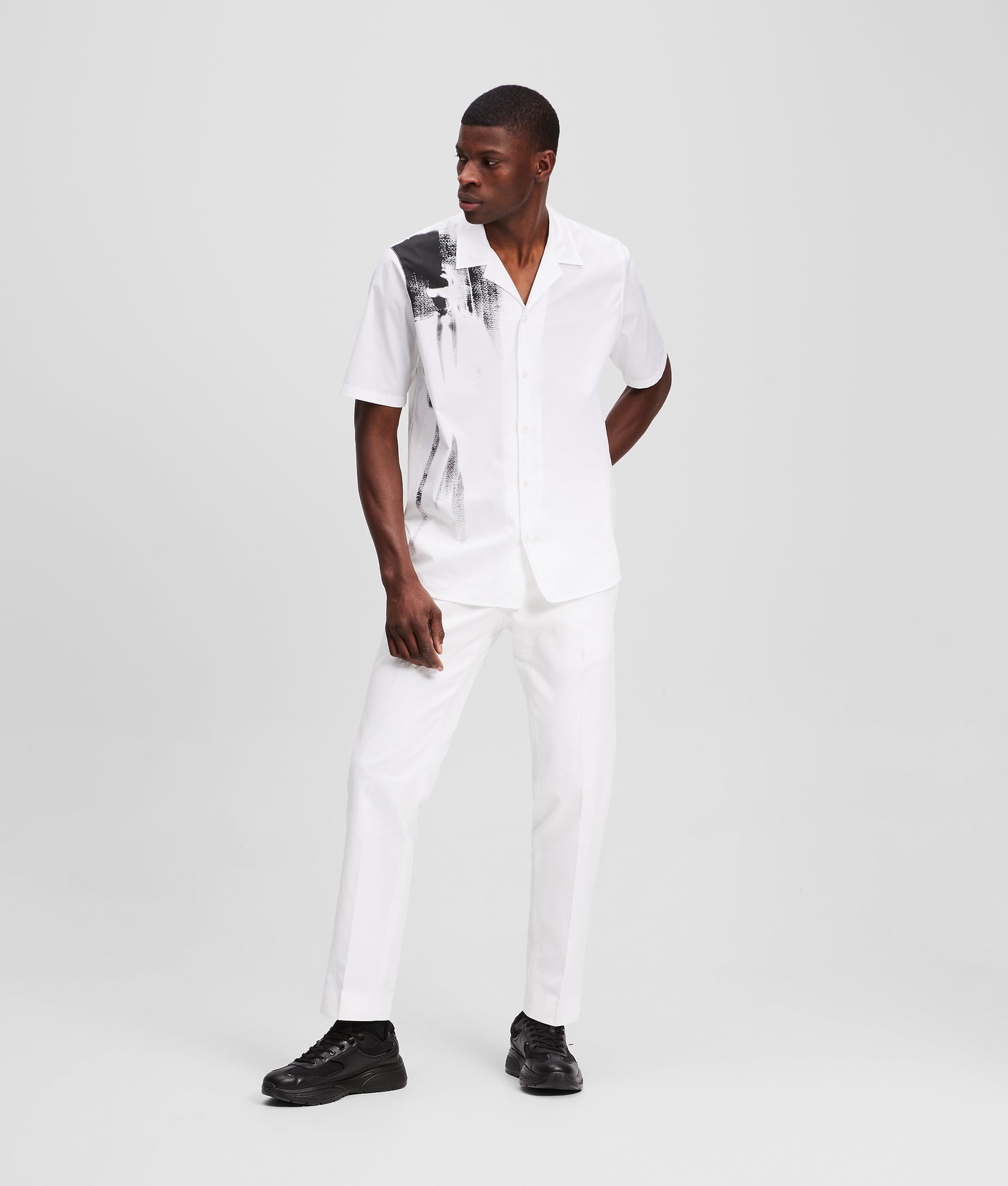 A striking addition to any wardrobe, this shirt features a unique silhouette print, complemented by the iconic KARL LAGERFELD logo. With its relaxed pajama collar, accompanied by short sleeves and contemporary buttons, the piece offers a modern twist on classic style.