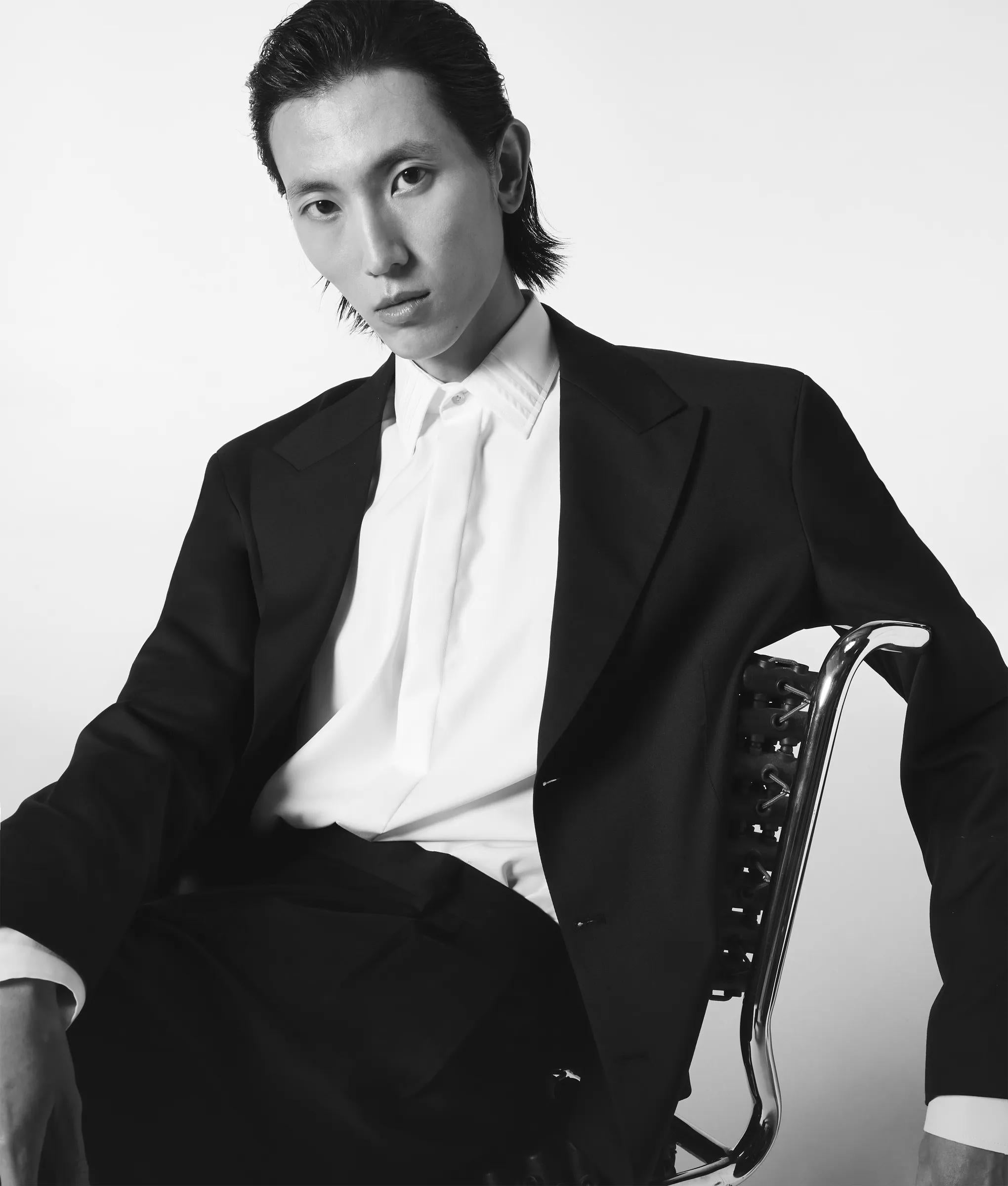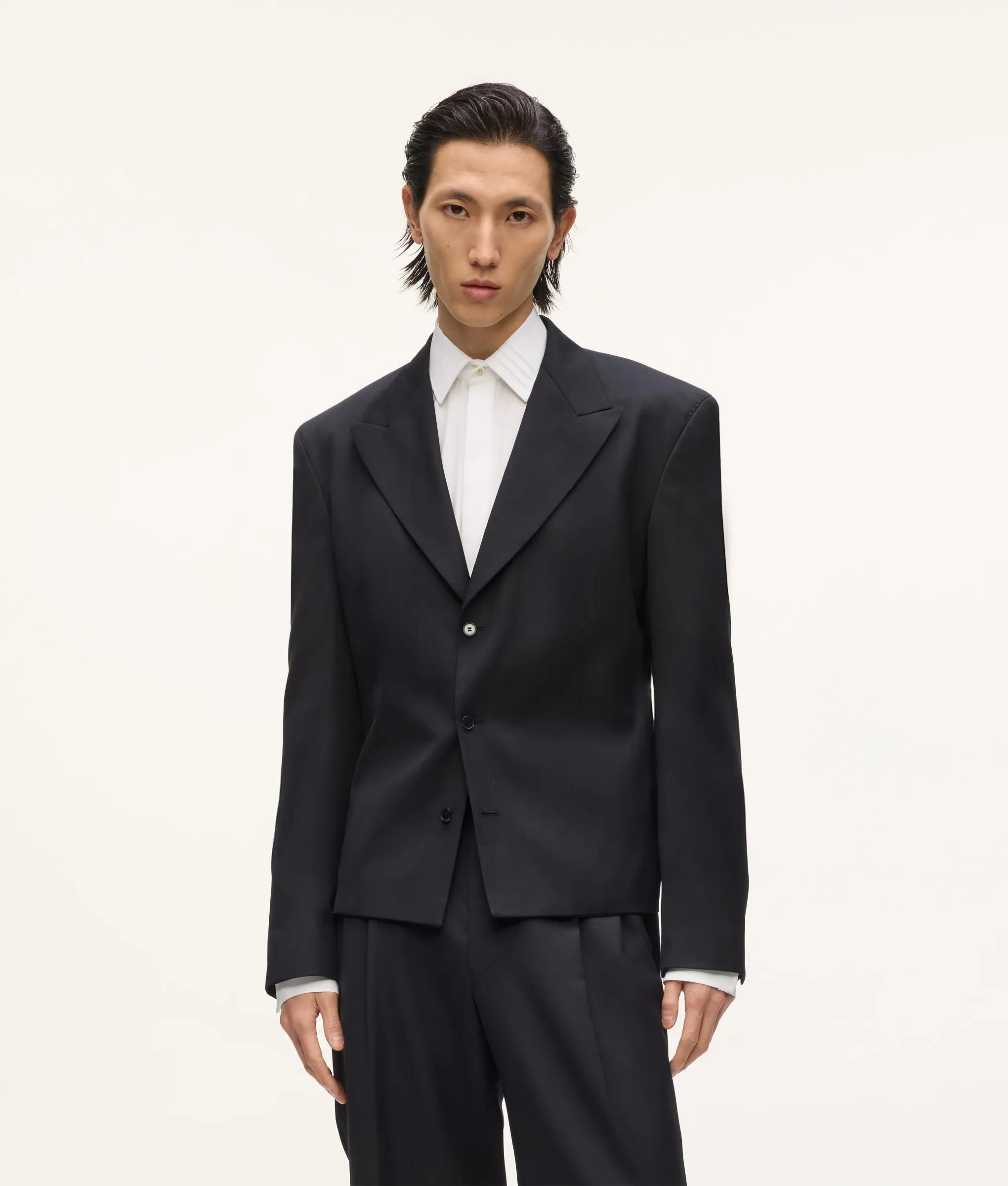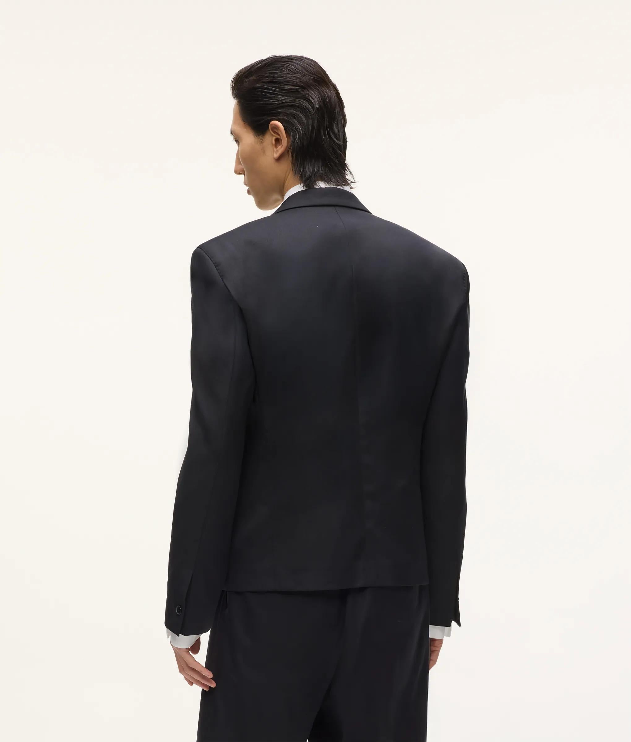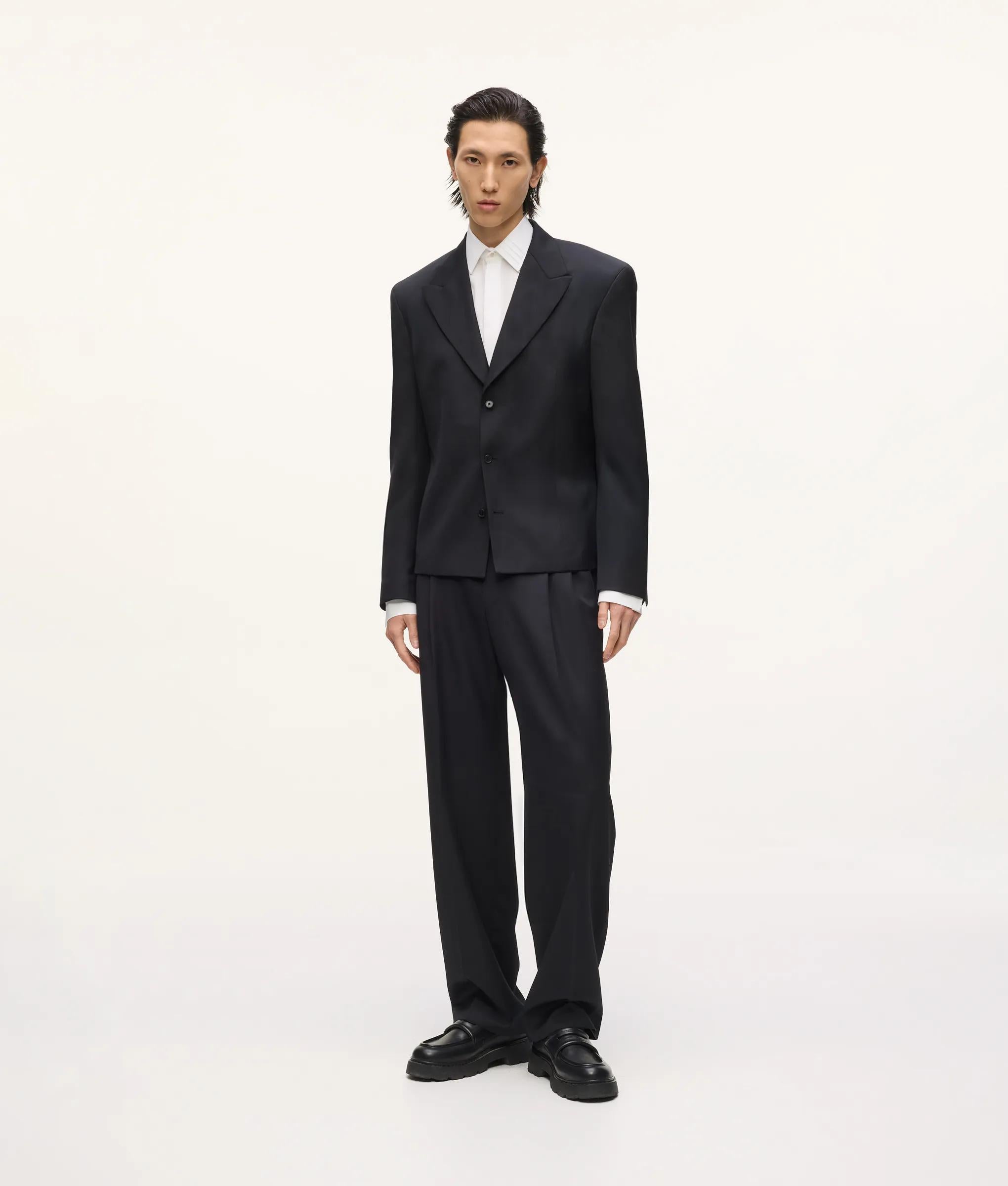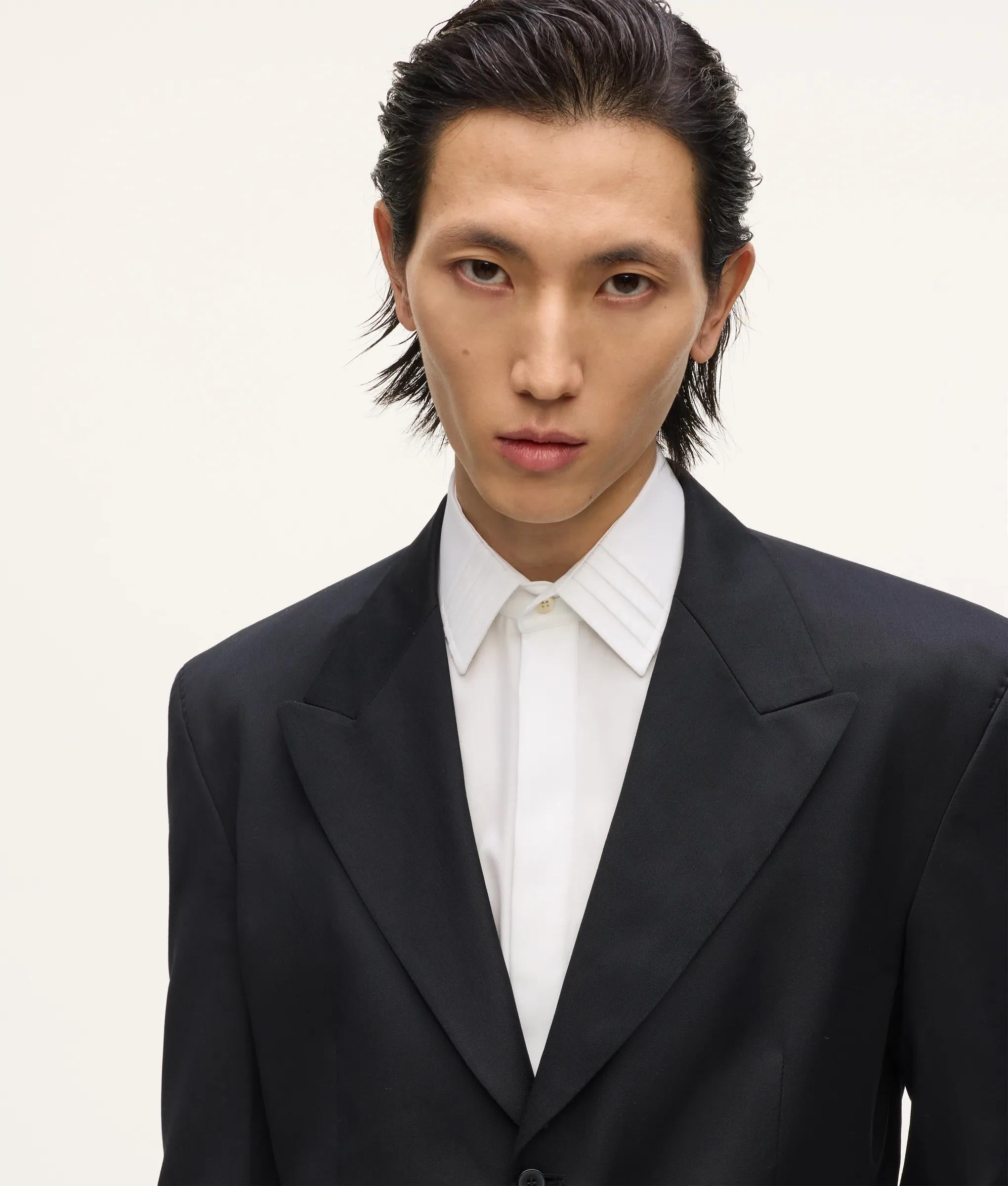 Confident tailoring defines this double-breasted blazer with strong shoulders, peak lapels and a subtly elongated hem that sharpens the whole silhouette. Wear it as the full suit, or throw it over relaxed denim and a fine knit for instant elegance.