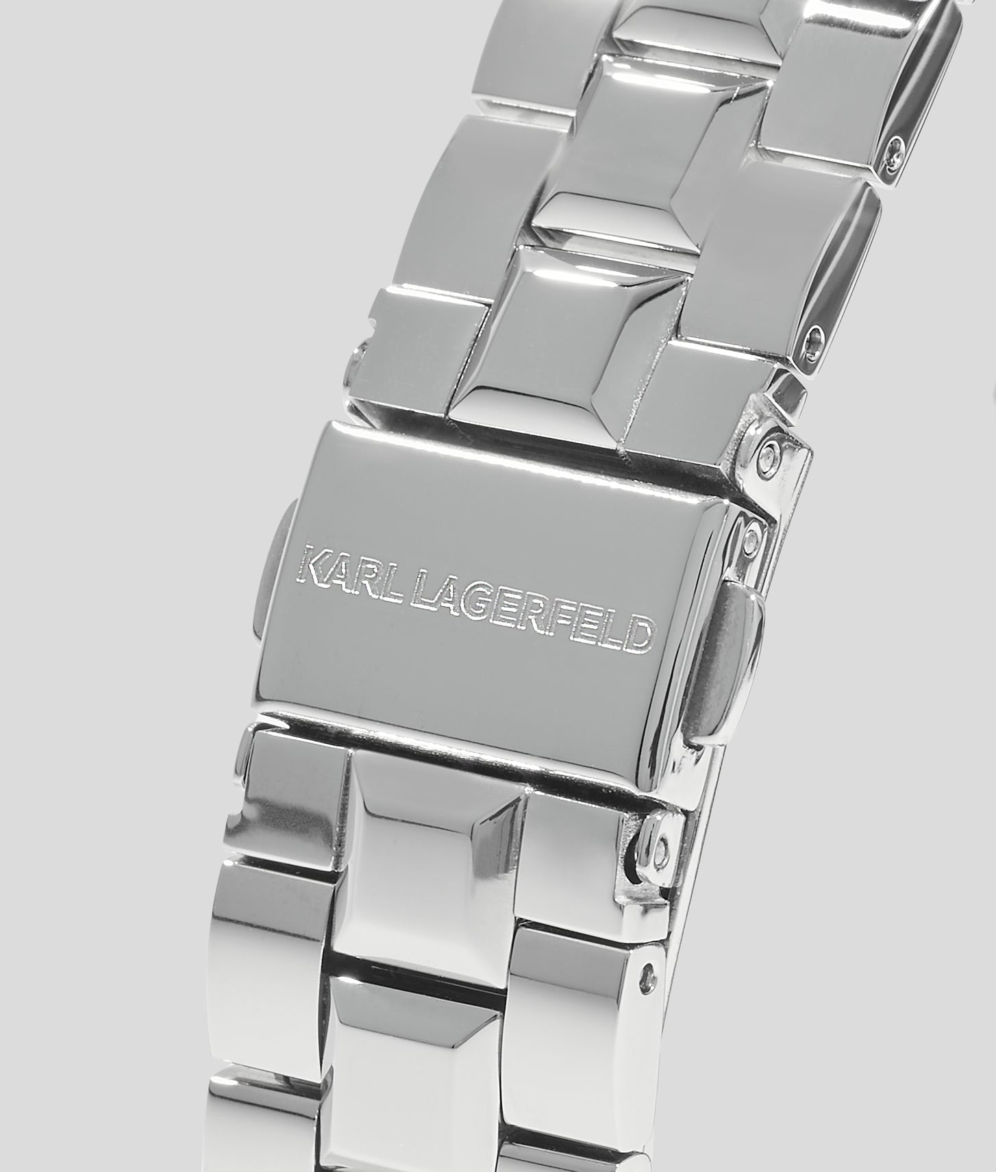 For statement accessorizing, this watch features a bold stainless steel bracelet and an intricately embellished bezel with black and white crystals. This piece combines technical functionality with elevated details.
