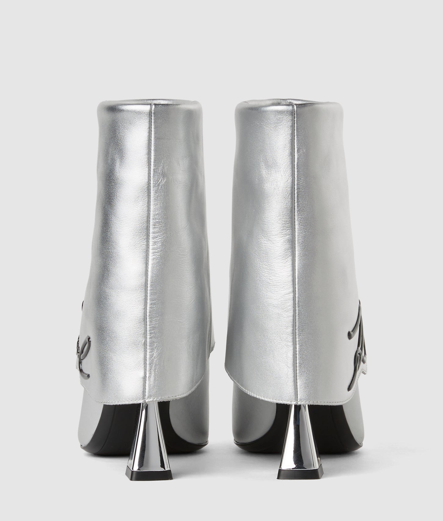 These statement mid-calf boots feature a contemporary fold-down silhouette showcasing the iconic Karl Signature. The slip-on design ensures effortless wear, while the flared heel and pointed toe add a touch of attitude.