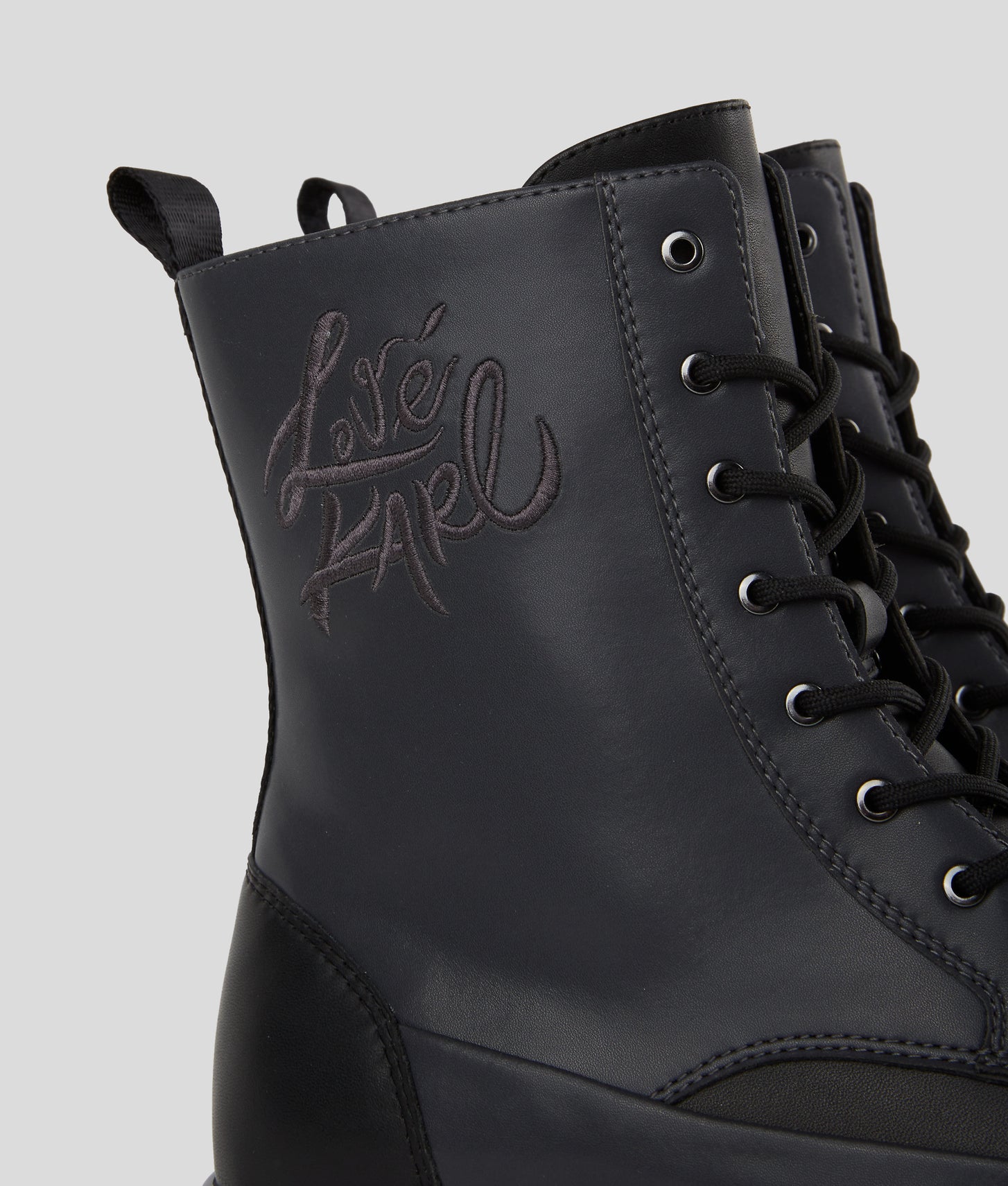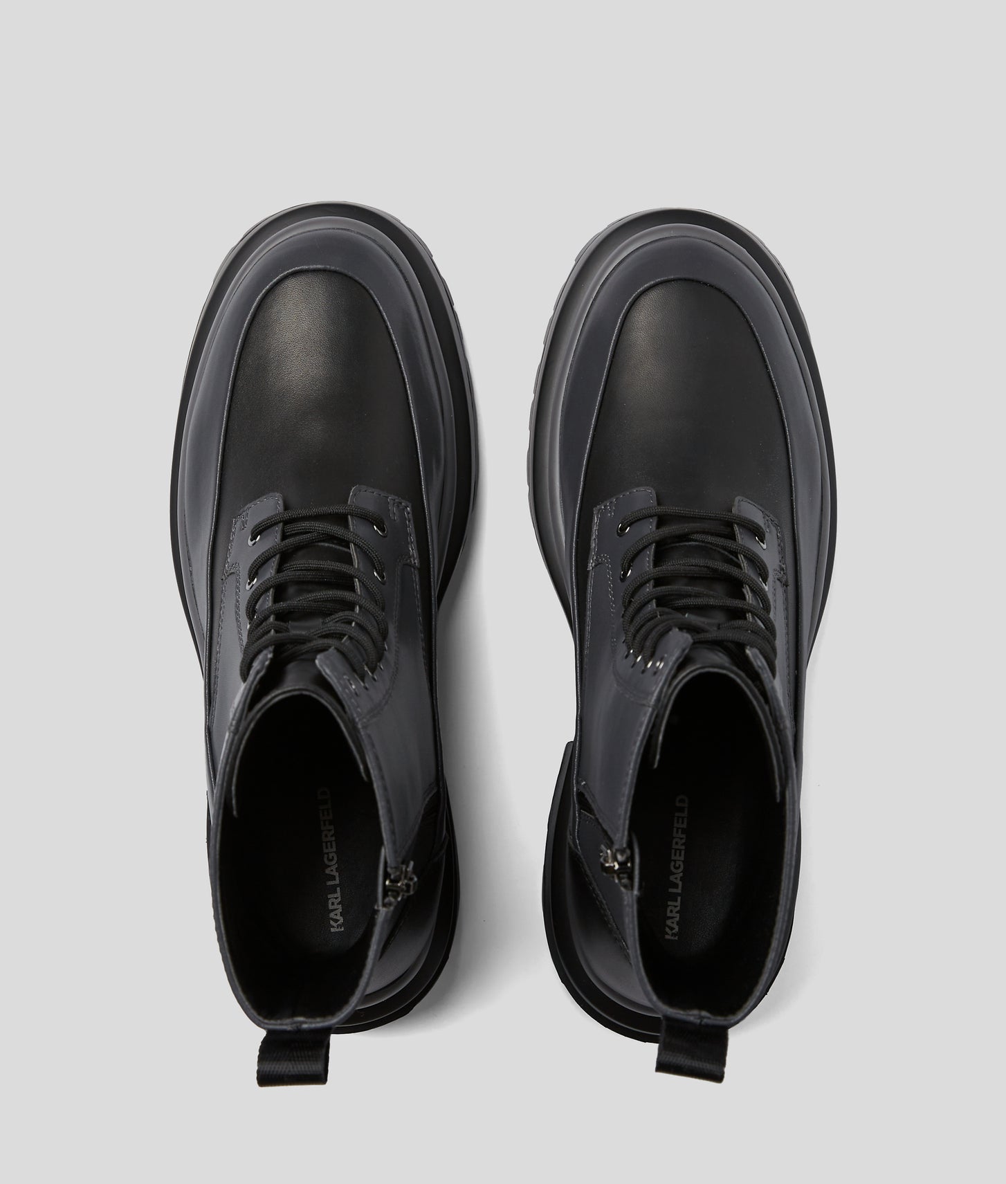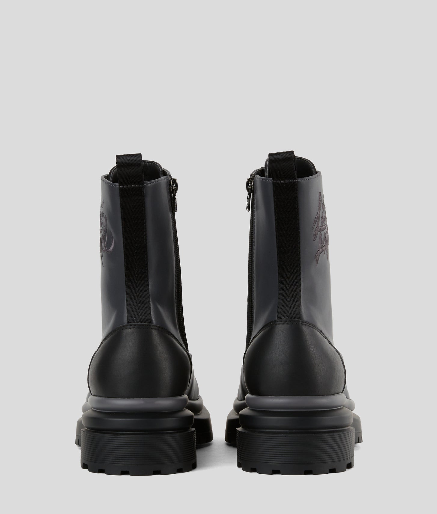 Step into bold style with these edgy boots from the exclusive KARL LAGERFELD JEANS x Atelier Reservé collection. Featuring a distinctive lace-up design with an easy-access inner zip and limited-edition logo detailing, these boots are a unique and fearless fashion statement.