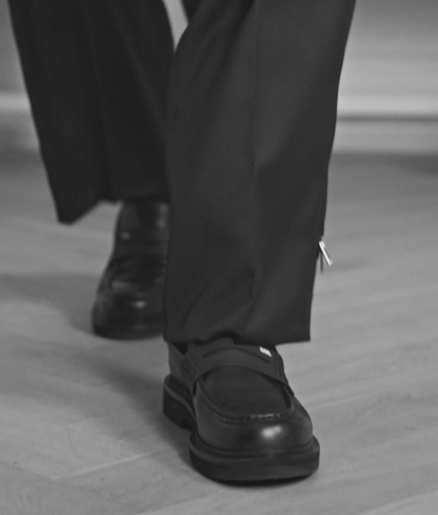 Elevate your footwear with these timeless loafers featuring a sophisticated, polished leather finish. A classic saddle detail with subtle branding is crafted from rubber, adding a contemporary urban edge.