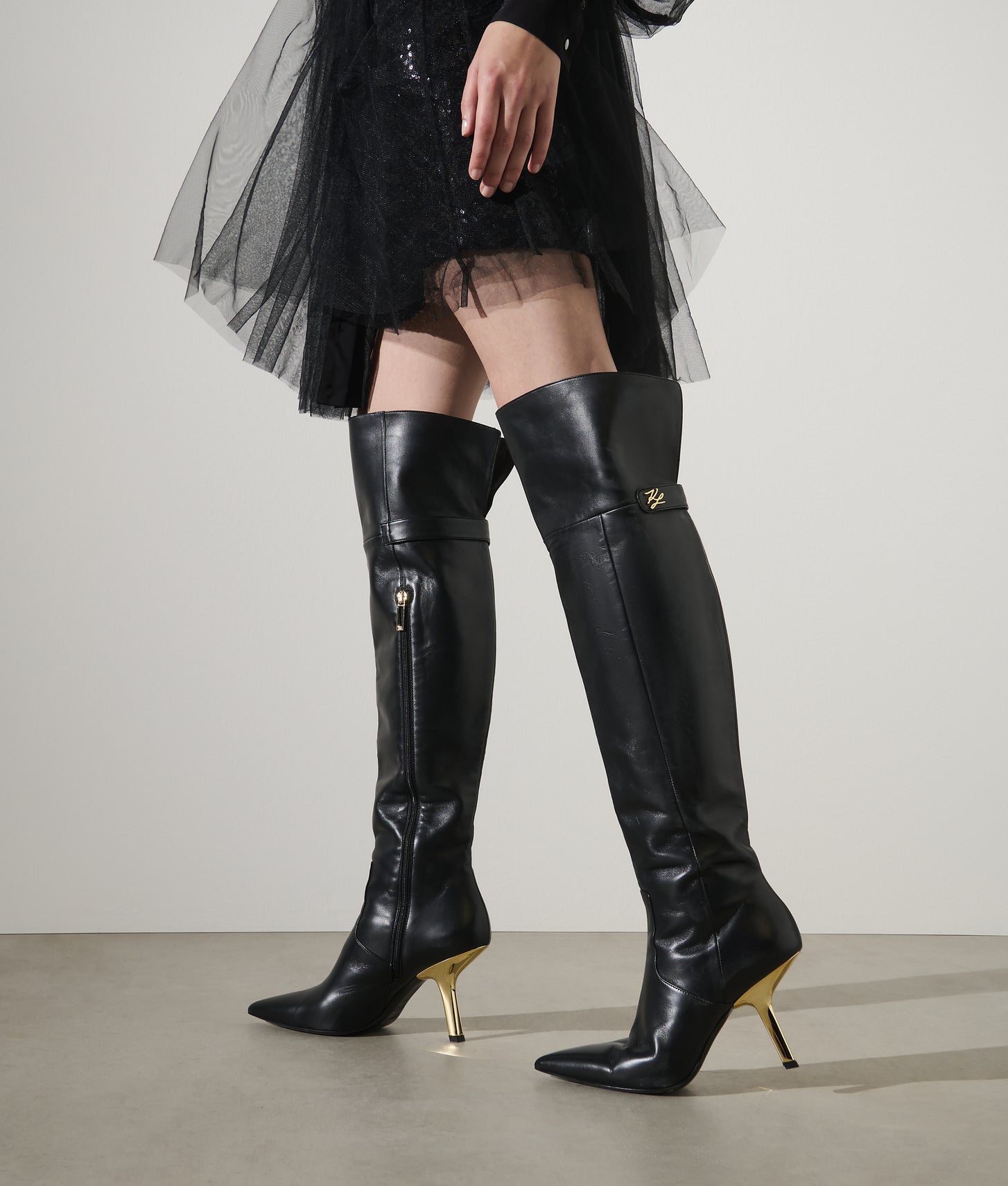 These over-the-knee boots are an empowering fashion statement. Beautifully crafted from premium leather, these boots feature a sharp pointed toe and a striking geometric metallic heel. Whether styled with sleek dresses or formal tailoring, these boots complete any look with strength and sophistication.
