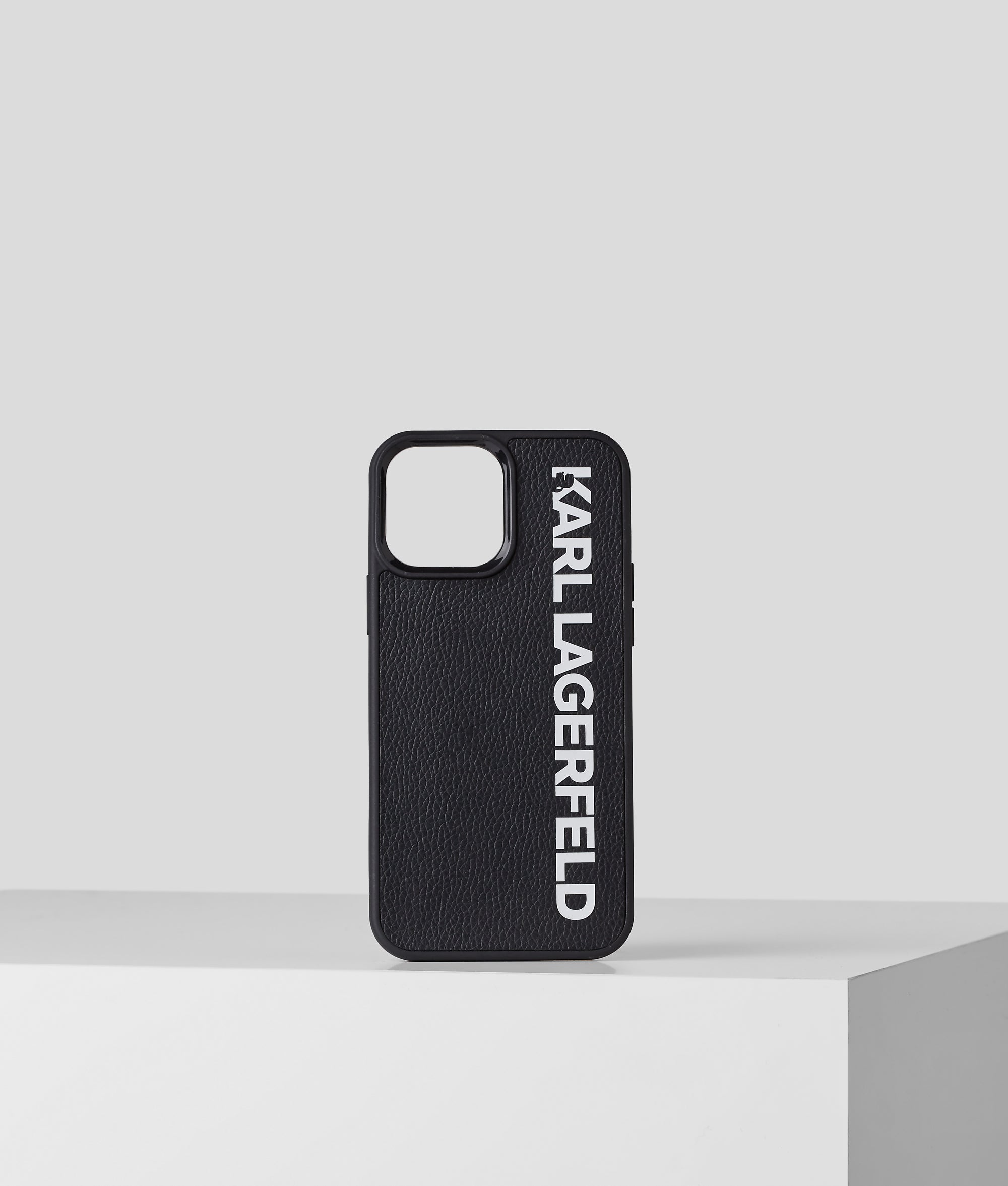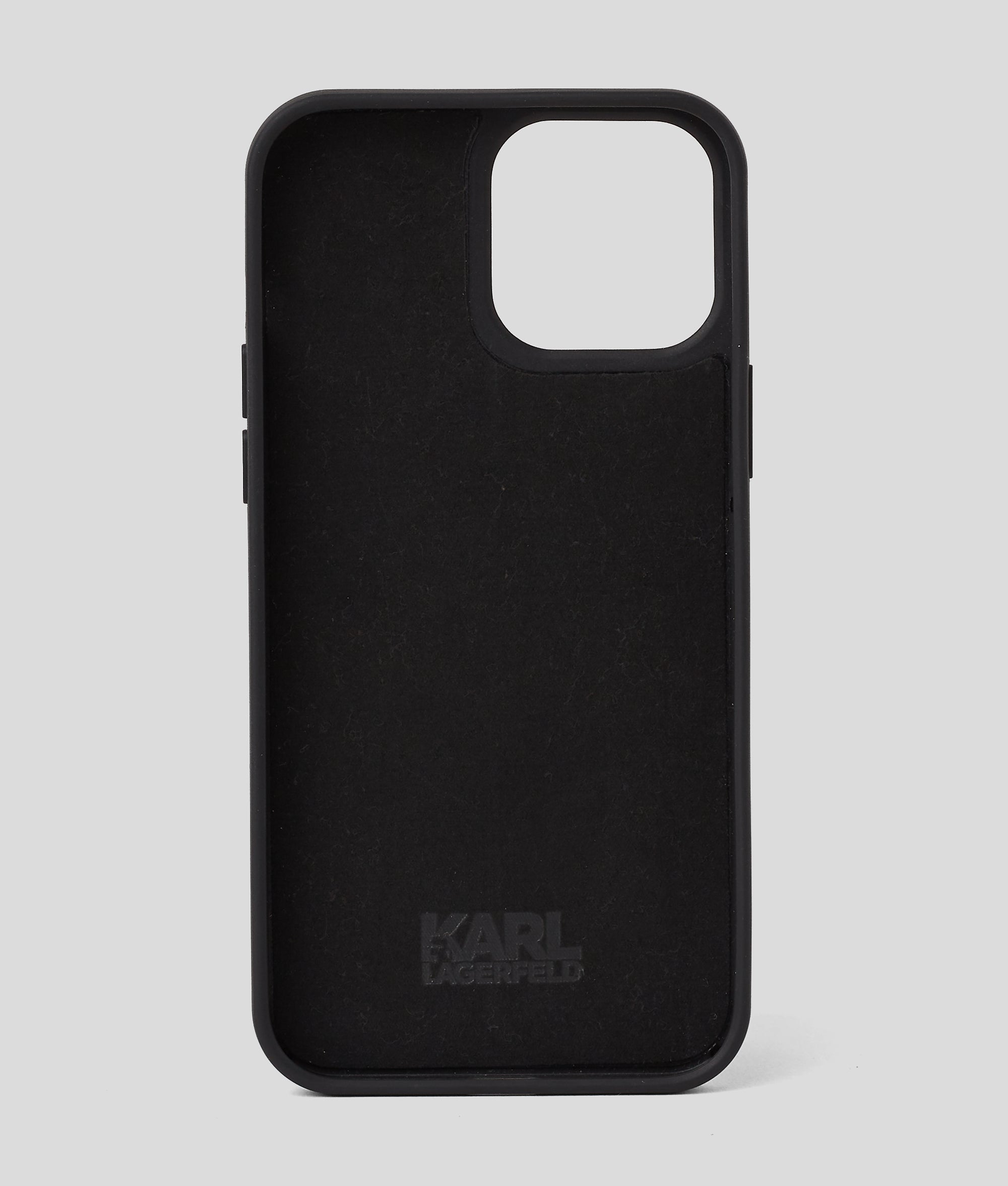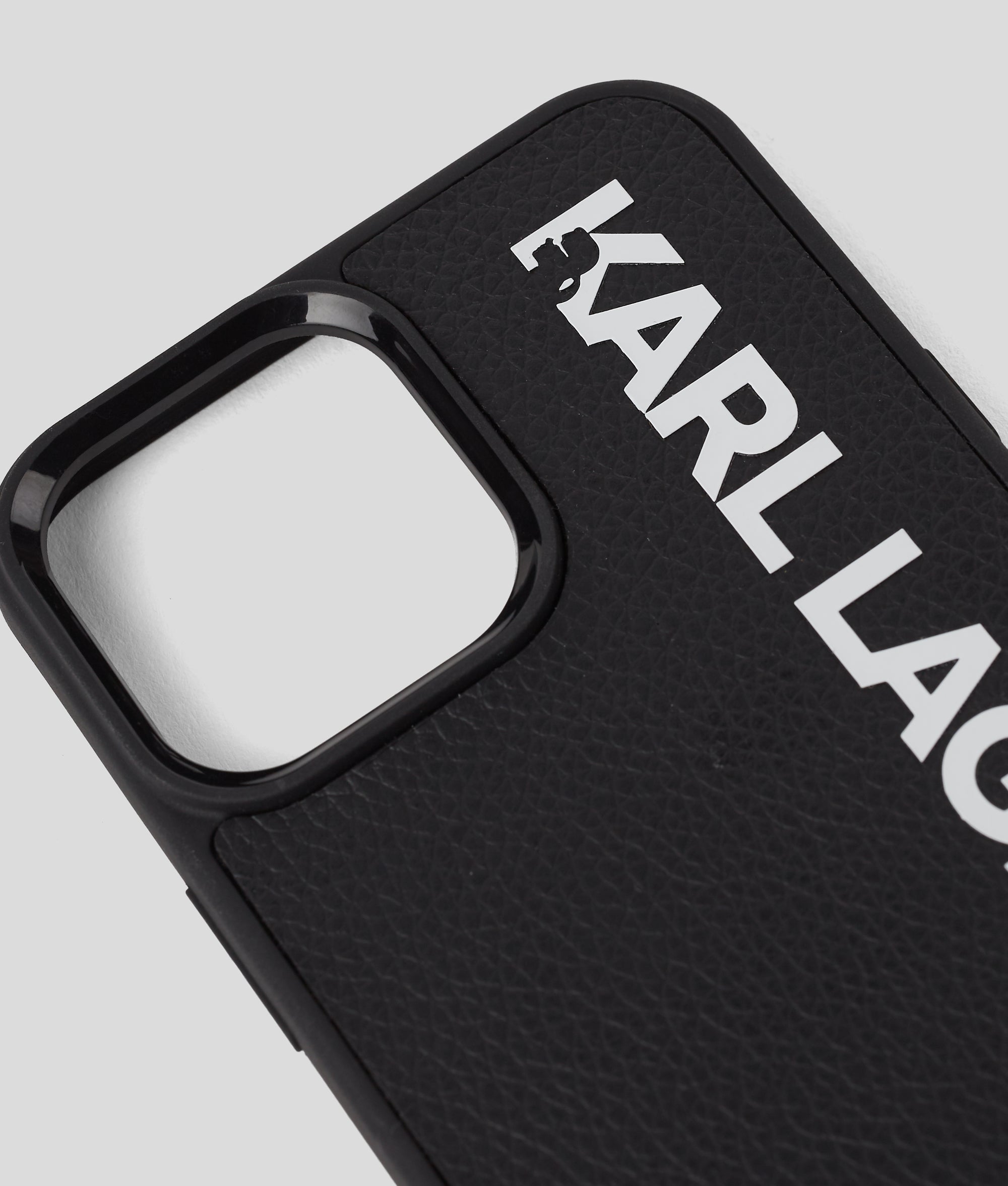 A sleek and functional tech accessory essential. This premium iPhone case is made from textured technial leather and proudly showcases the statement KARL logo.