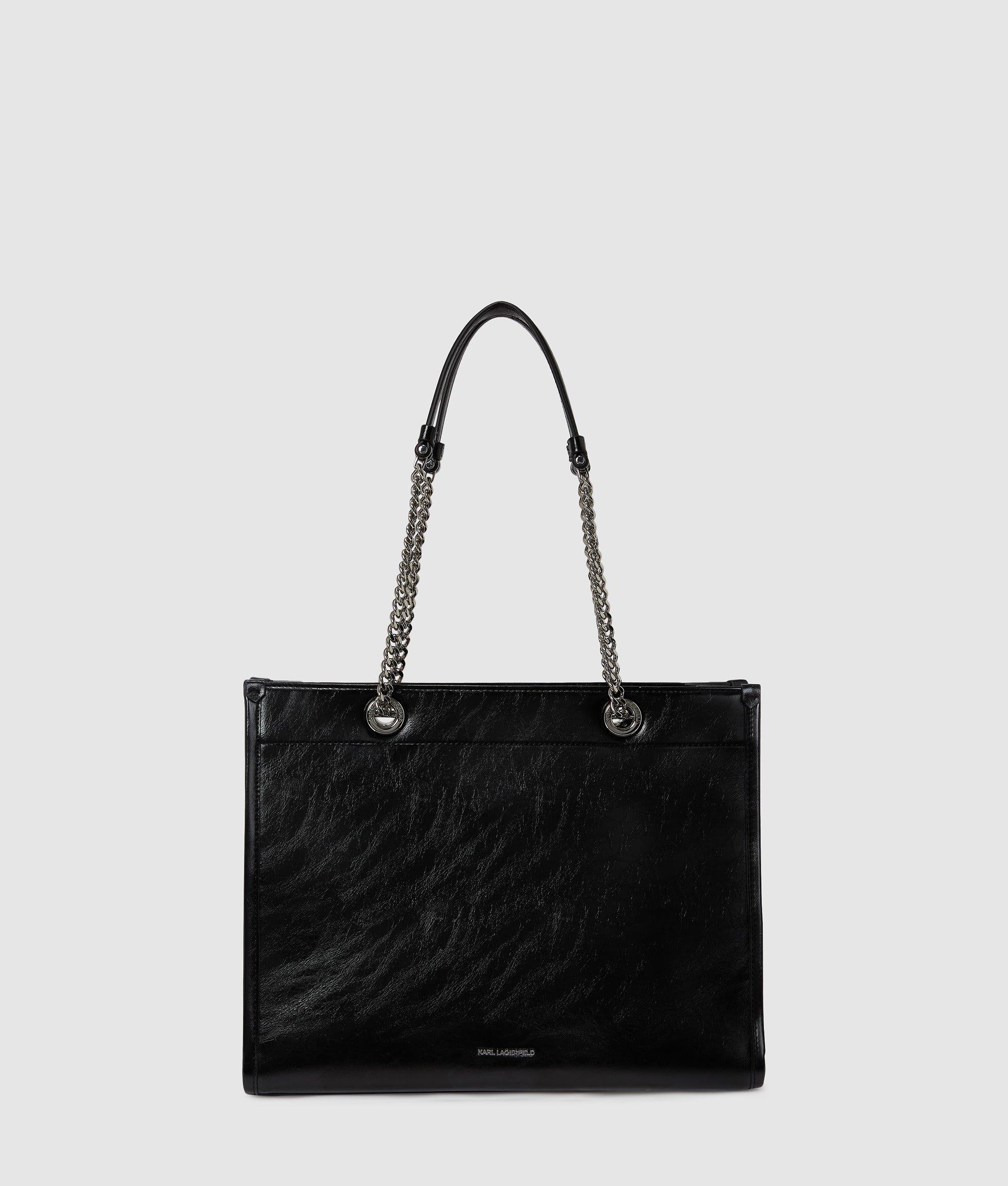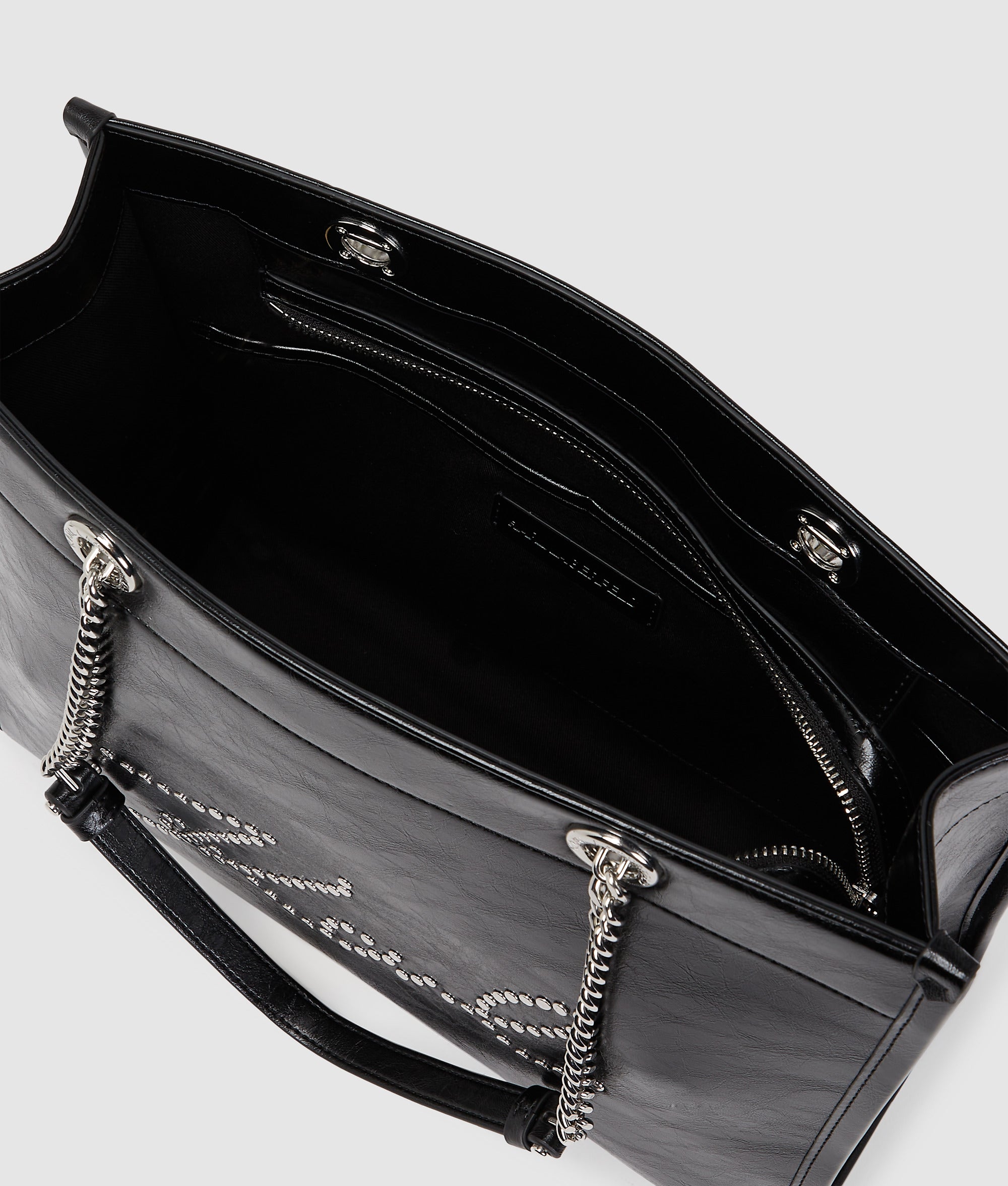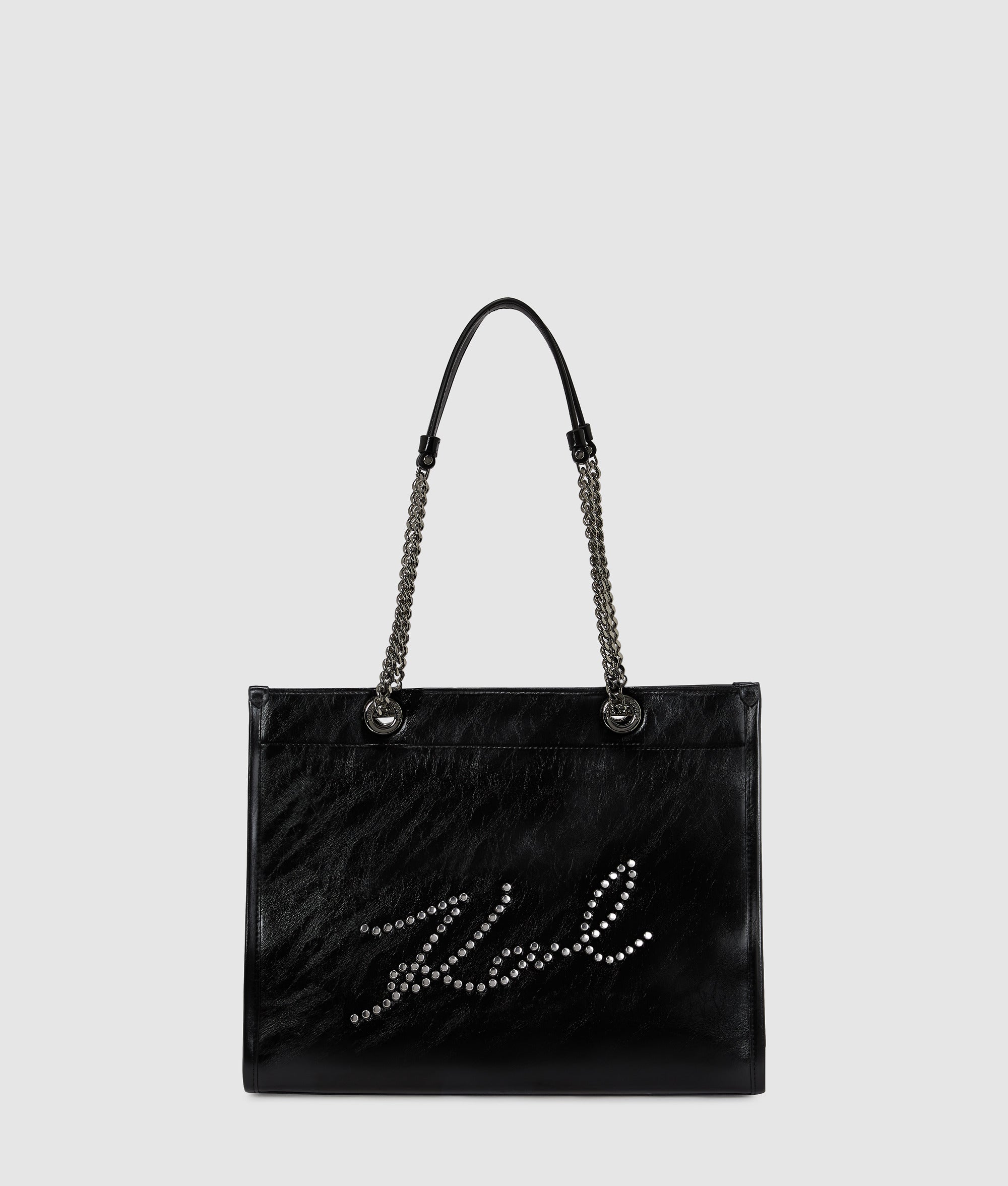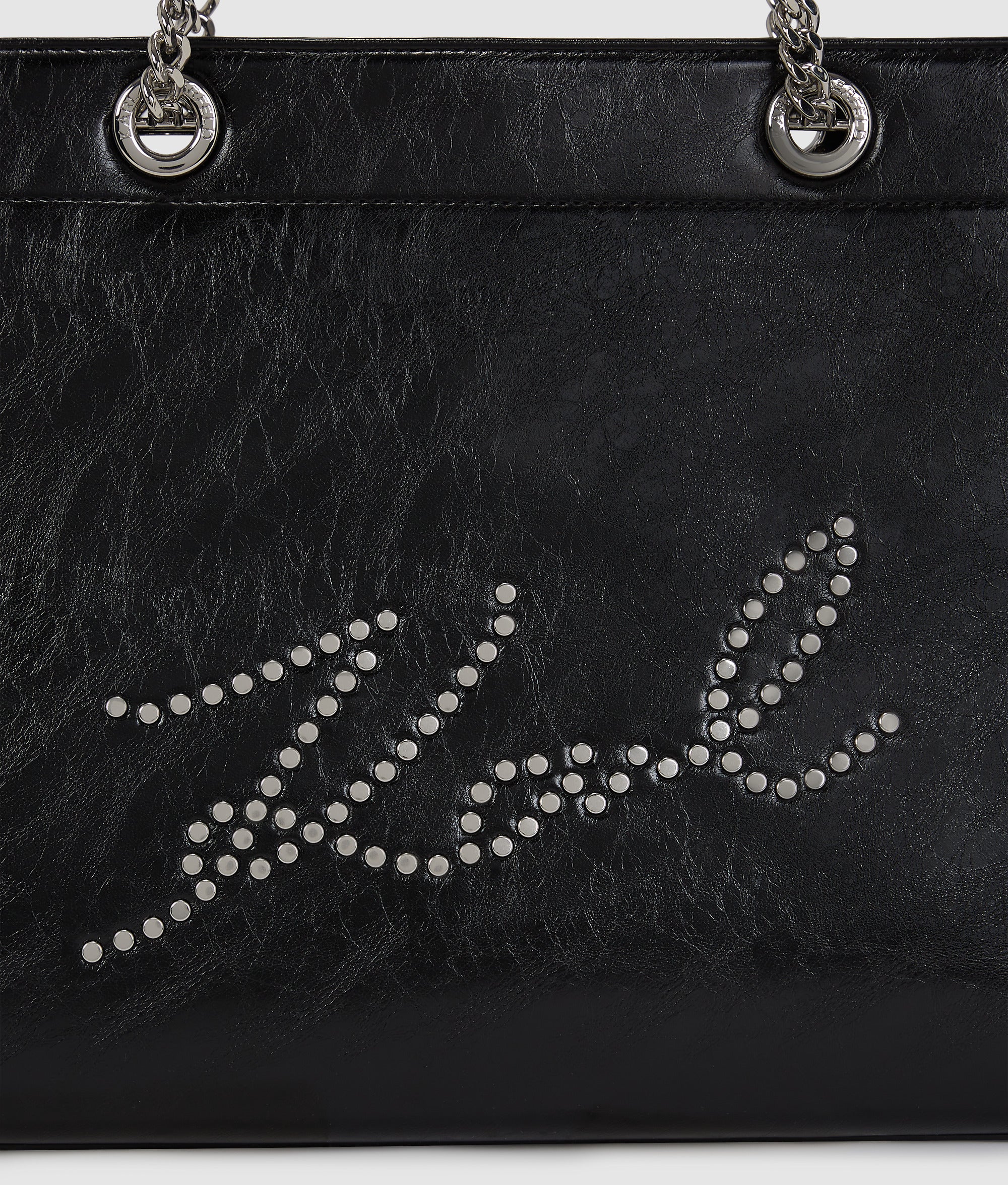 This standout tote bag showcases a contemporary square silhouette crafted from a shiny, textured technical leather. Edgy chain detailing adorns the twin top handles, while the statement studded Karl Signature logo boldly stands out at the front, making a striking impression.