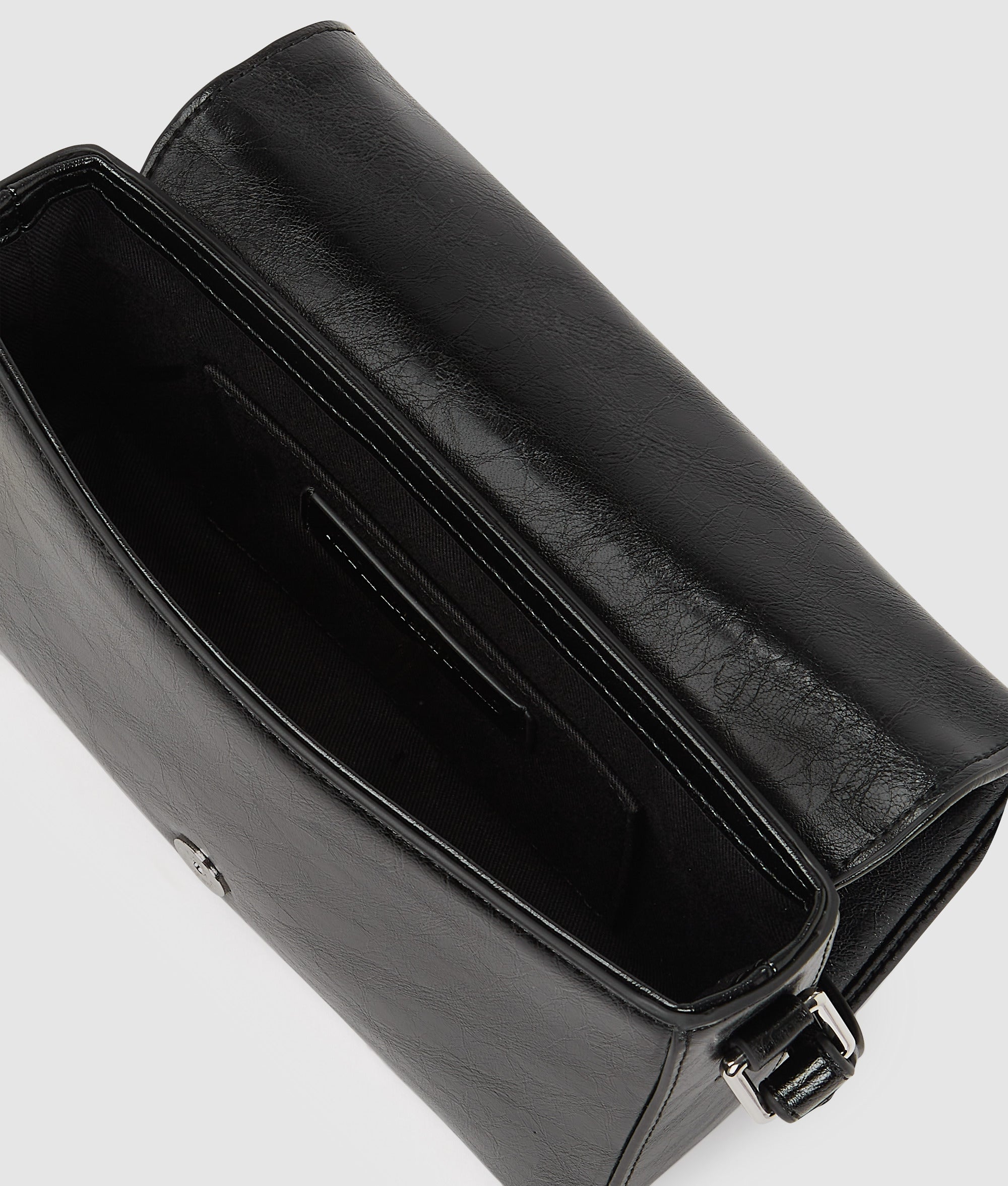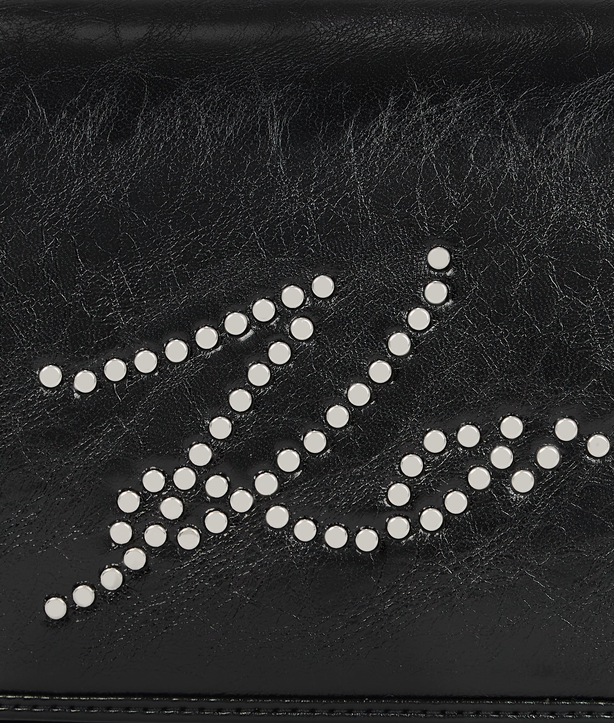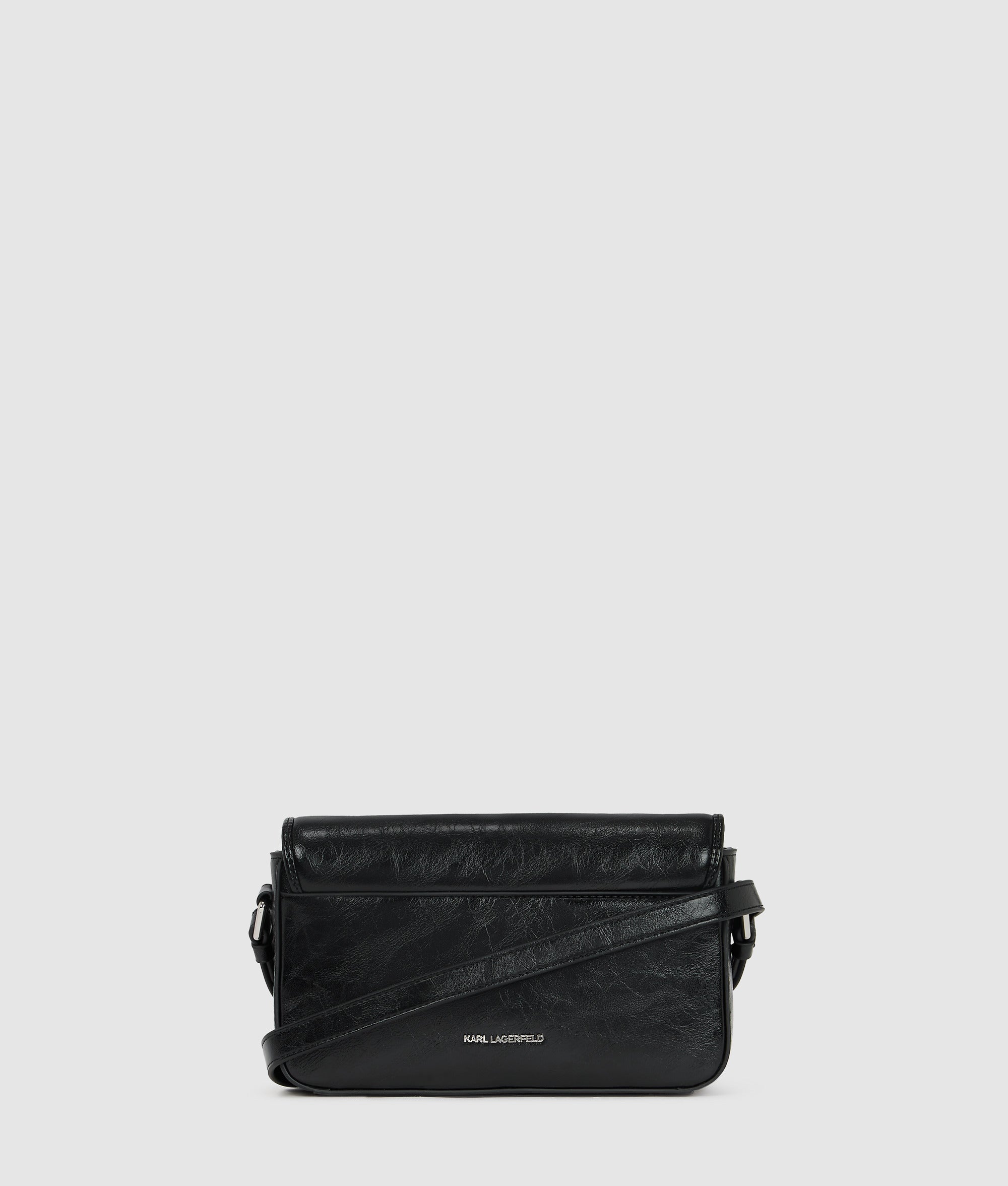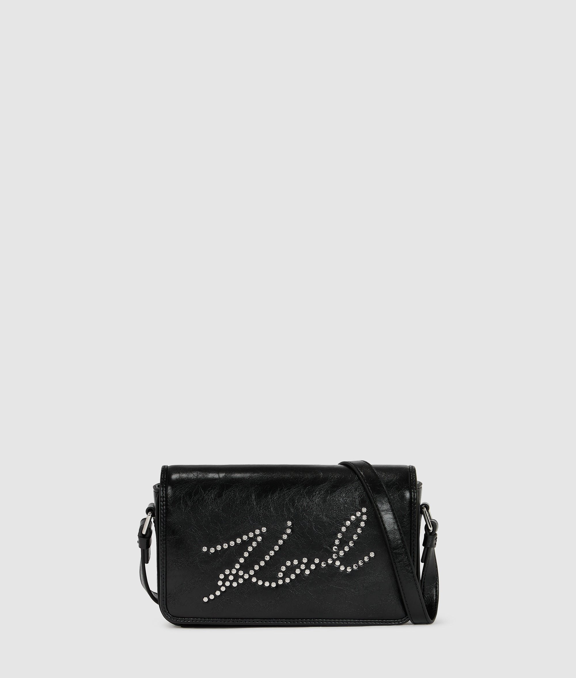 A standout piece, this edgy crossbody bag is crafted from a specially-textured technical leather, offering a unique crinkled feel. Its magnetic flap closure ensures easy yet secure access, while the adjustable strap offers versatile wear. A bold studded Karl Signature logo completes the striking look.