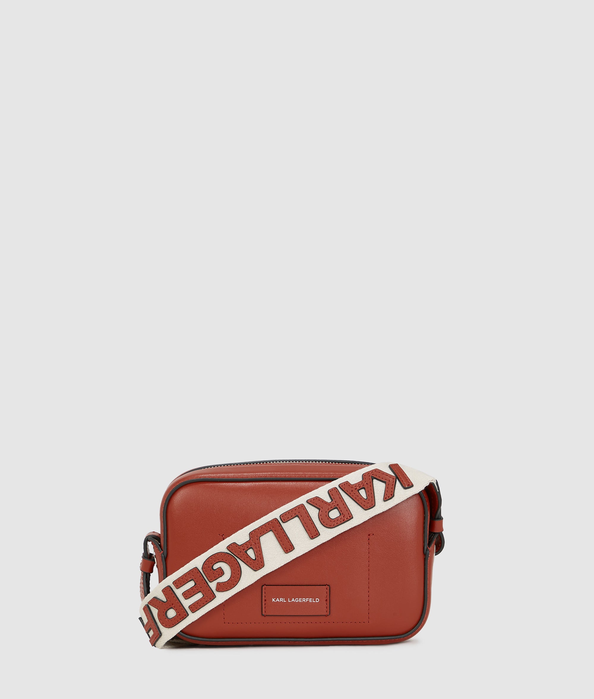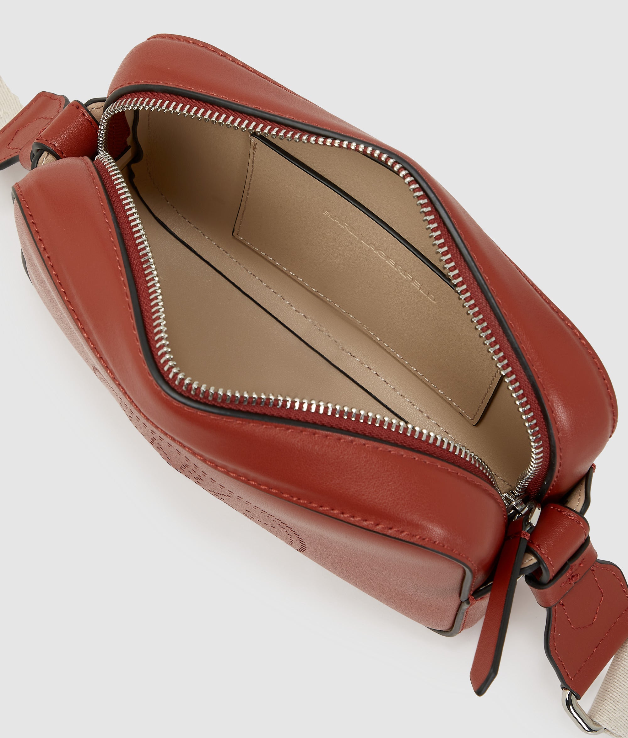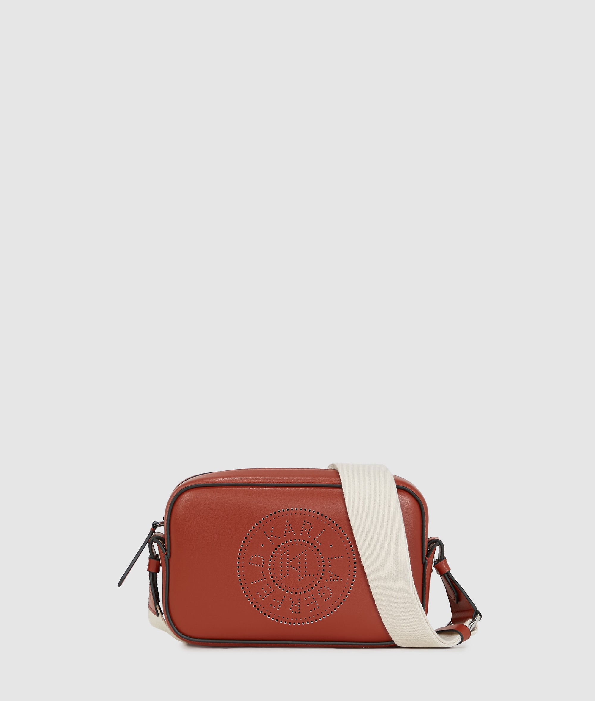 Made from supple leather, the K/Circle crossbody bag boasts a sleek camera silhouette, zip-around closure, and a branded webbing strap. The front features distinctive perforated KARL Circle artwork.