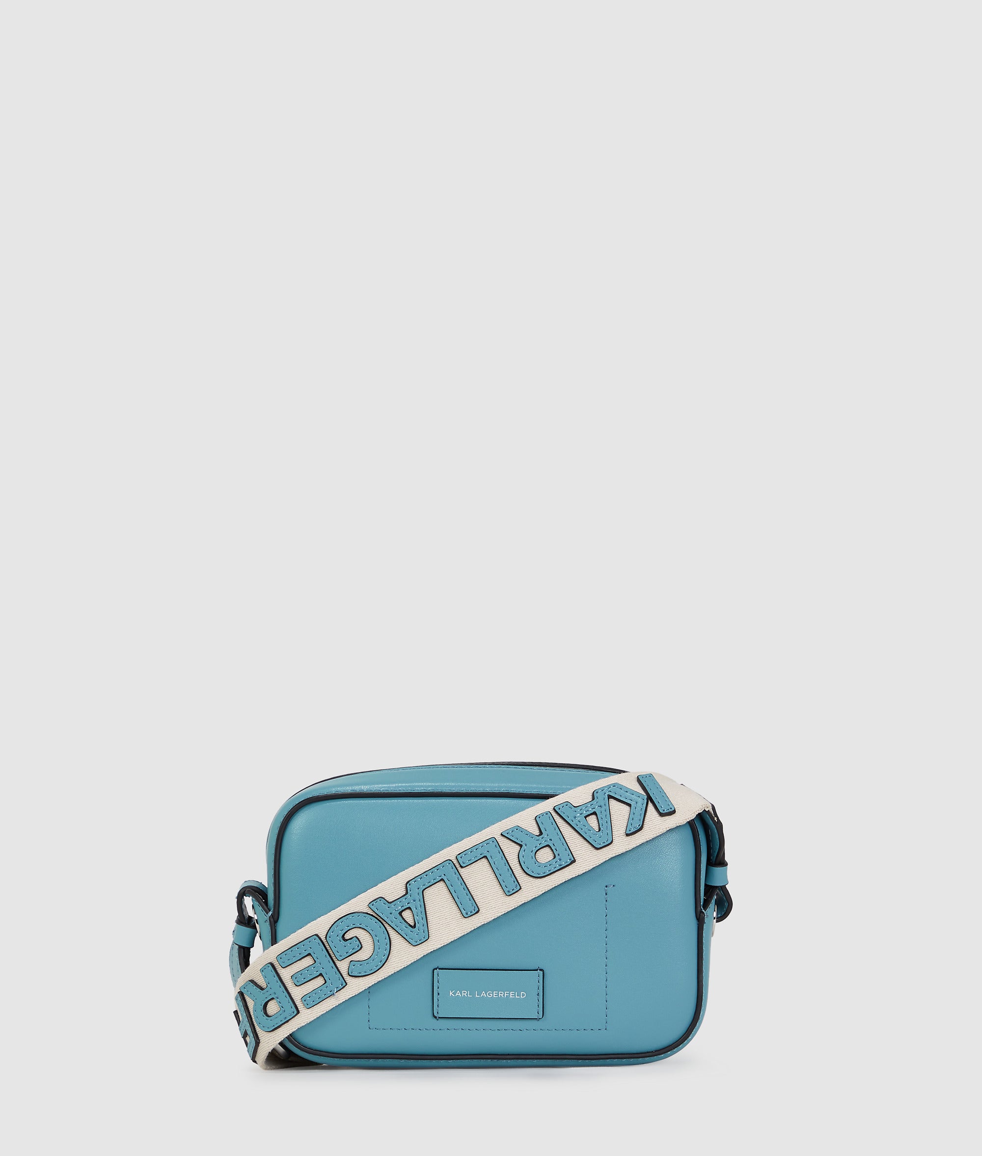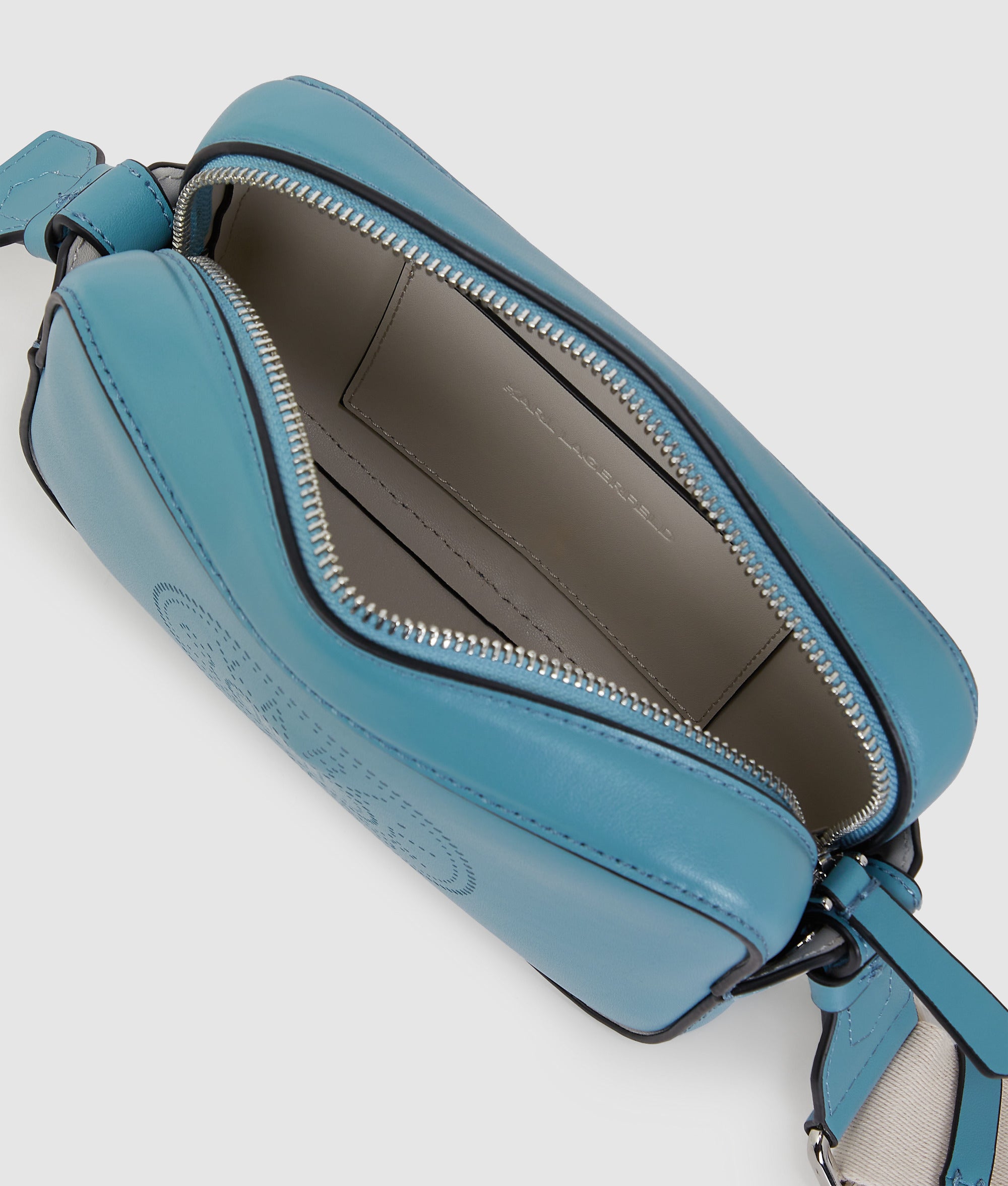 Made from supple leather, the K/Circle crossbody bag boasts a sleek camera silhouette, zip-around closure, and a branded webbing strap. The front features distinctive perforated KARL Circle artwork.