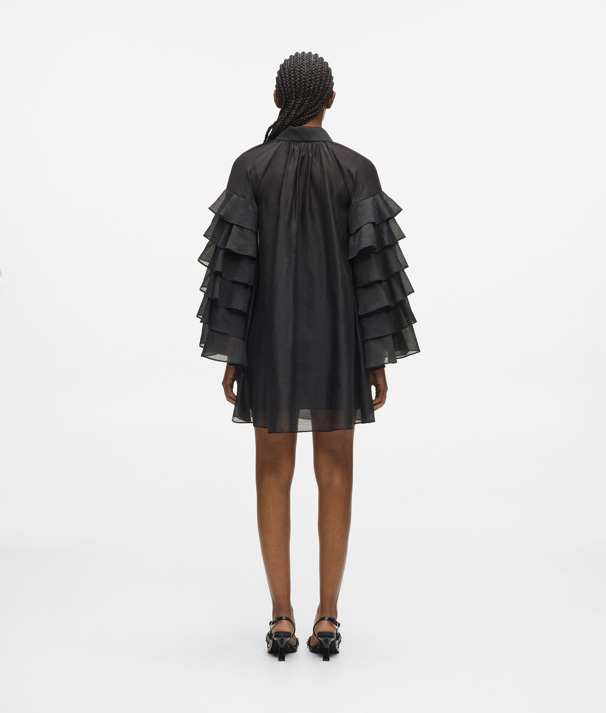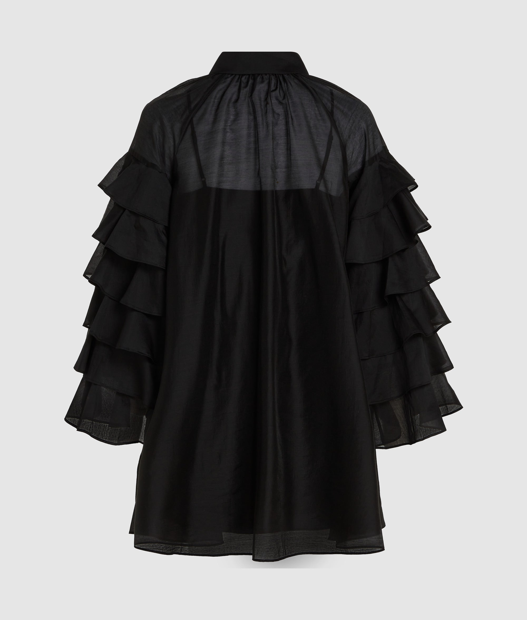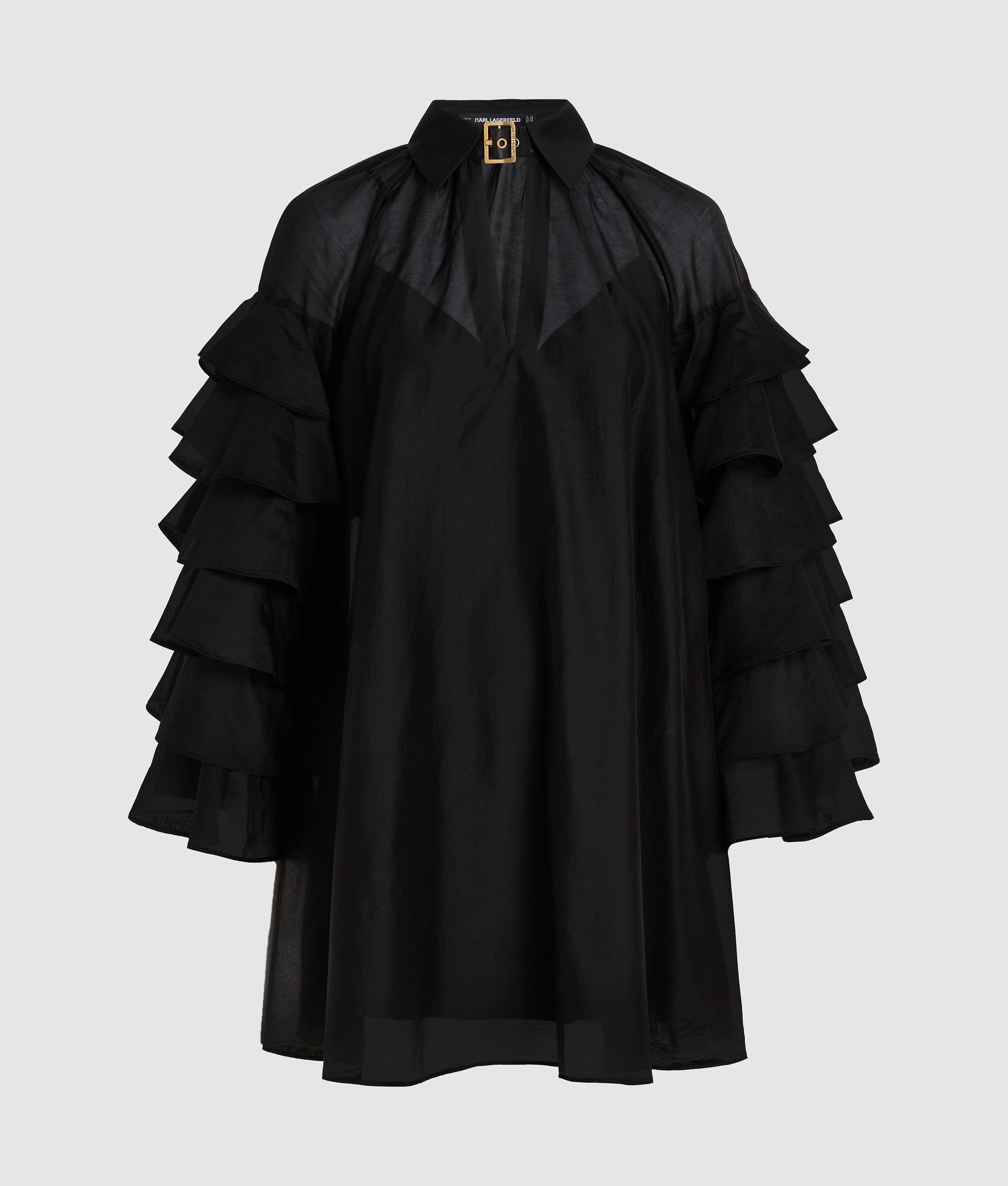 Cascading ruffled sleeves animate this sheer dress, balanced by a detachable slip for versatility. A faux-leather neckline with gold accents brings a sharp, rock-chic finish to the bold silhouette.