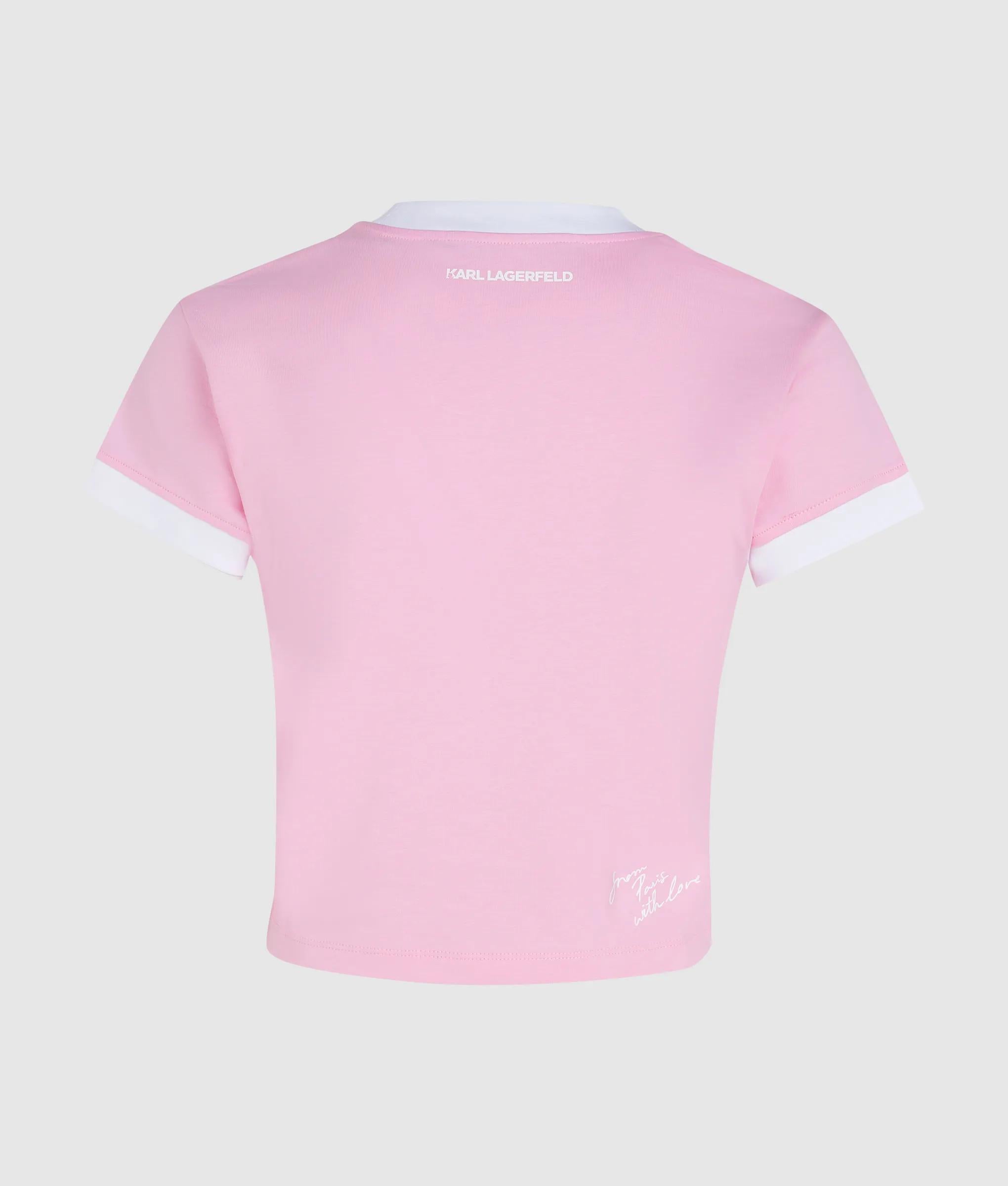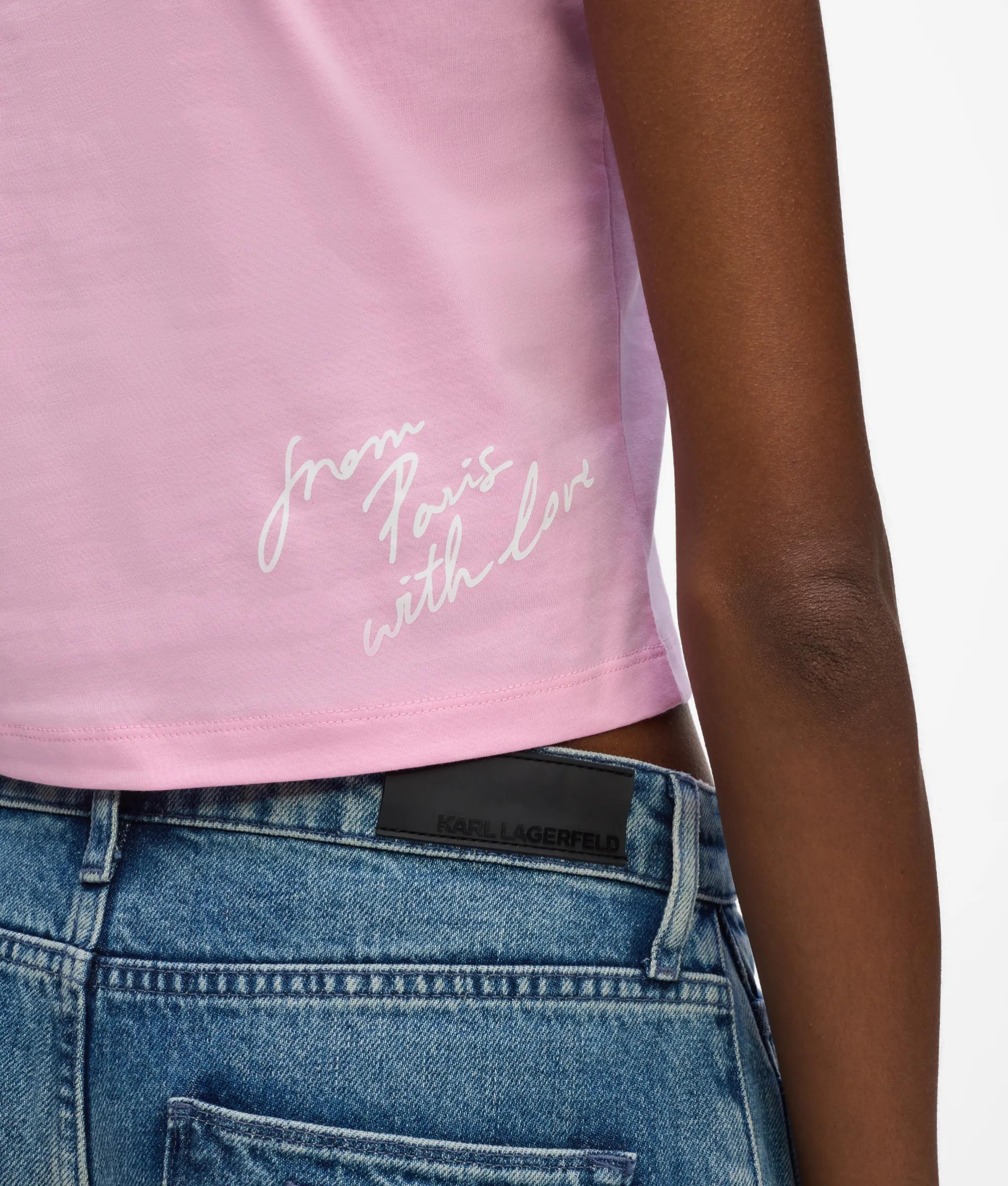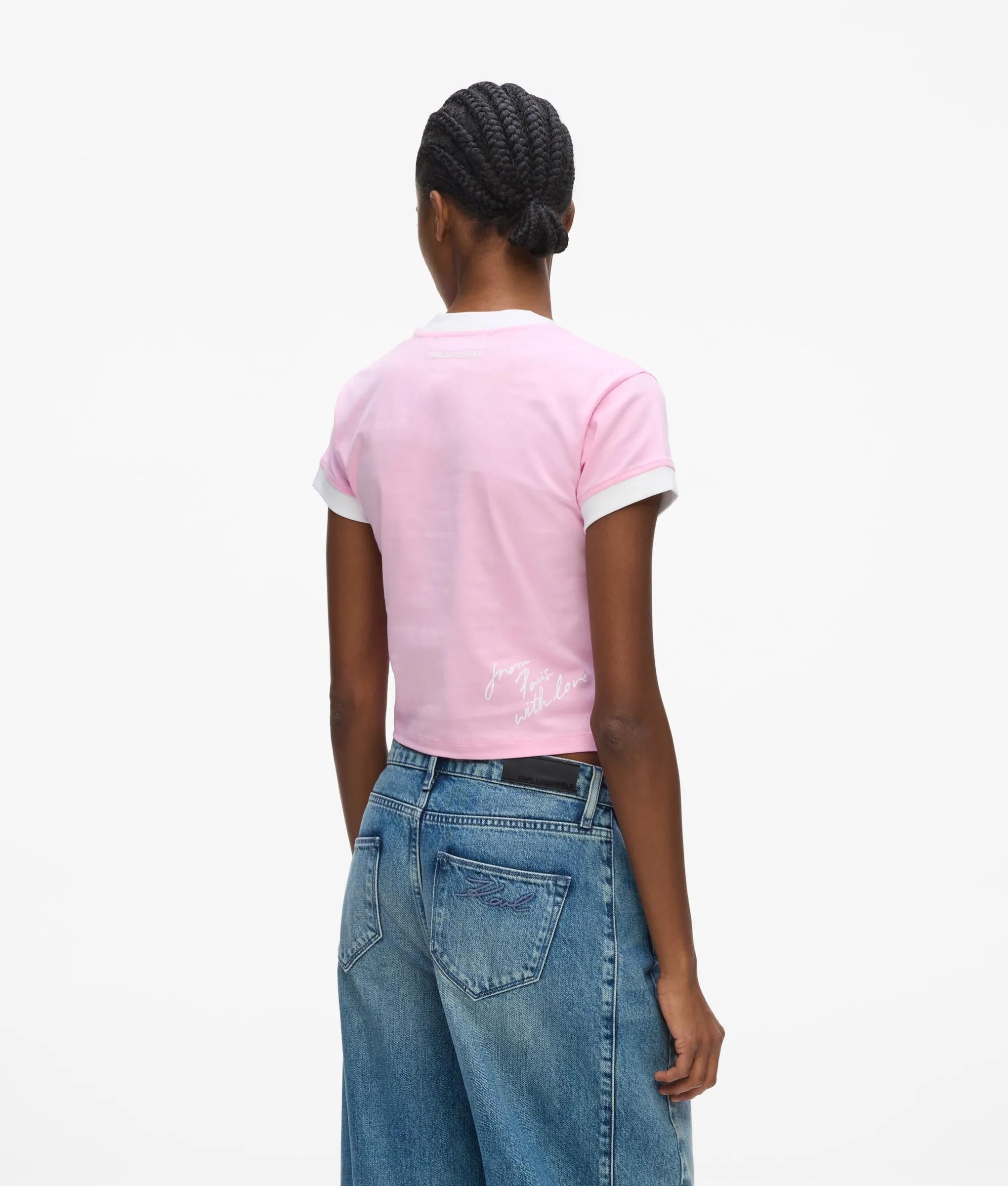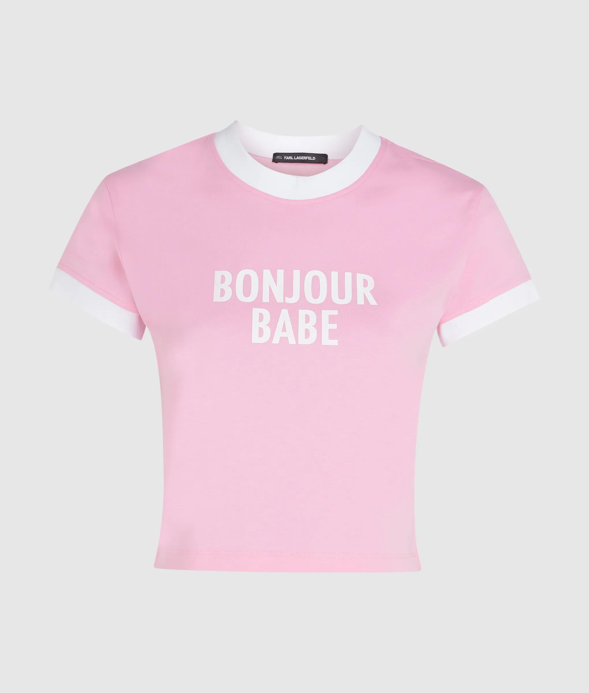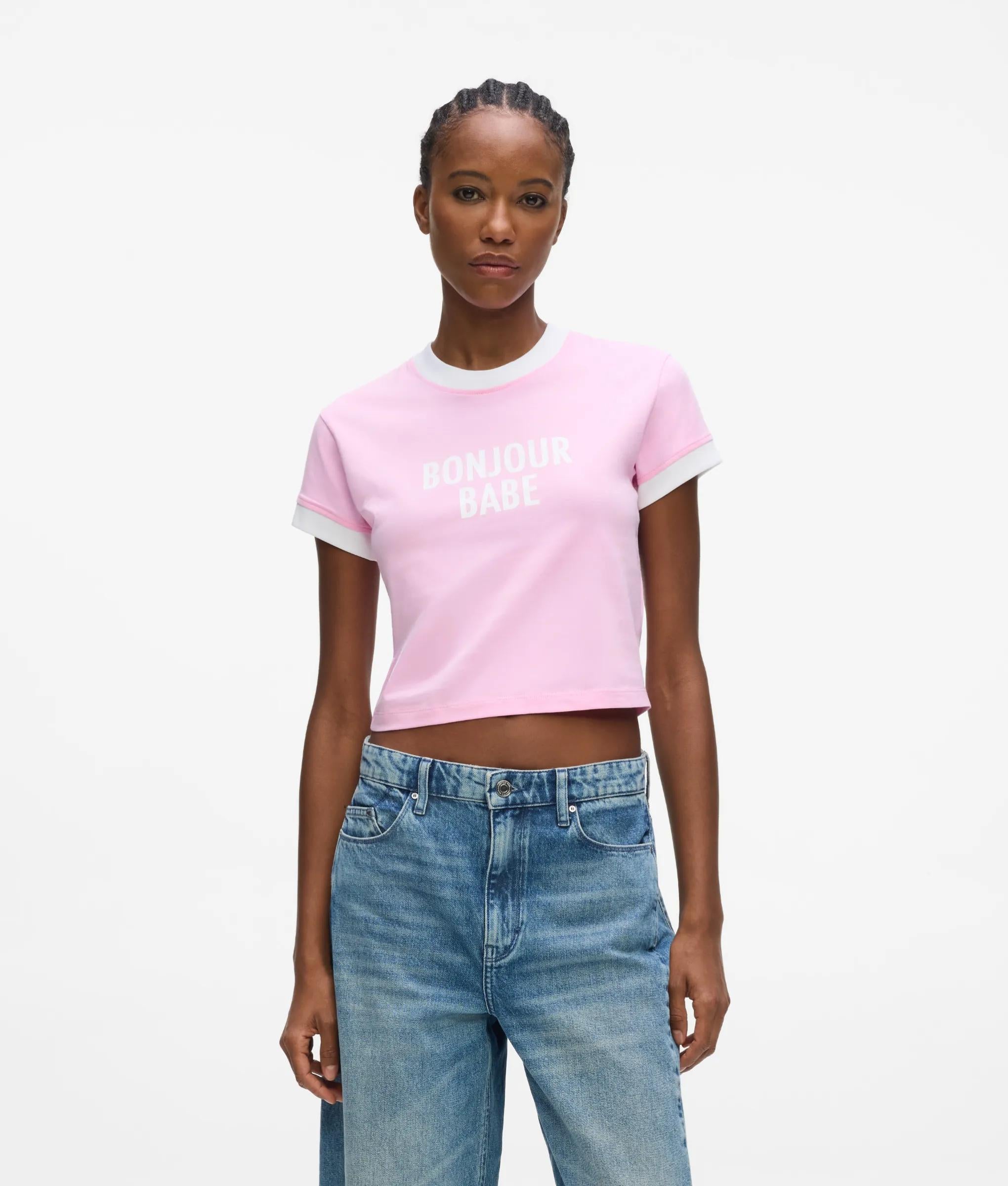 Inspired by early 2000s nostalgia, this crew-neck tee features Paris Hilton's own words: "Bonjour Babe." With playful piping and her favorite pink hue, it’s an essential piece for off-duty days.