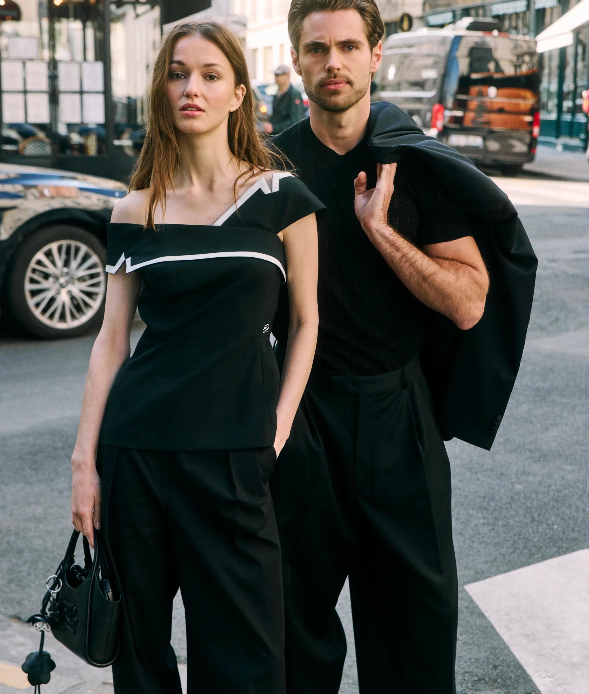 A tailored off-shoulder top with contrast piping at the lapel and subtle logo embroidery at the waist. Structured yet refined, it elevates your evening wardrobe.