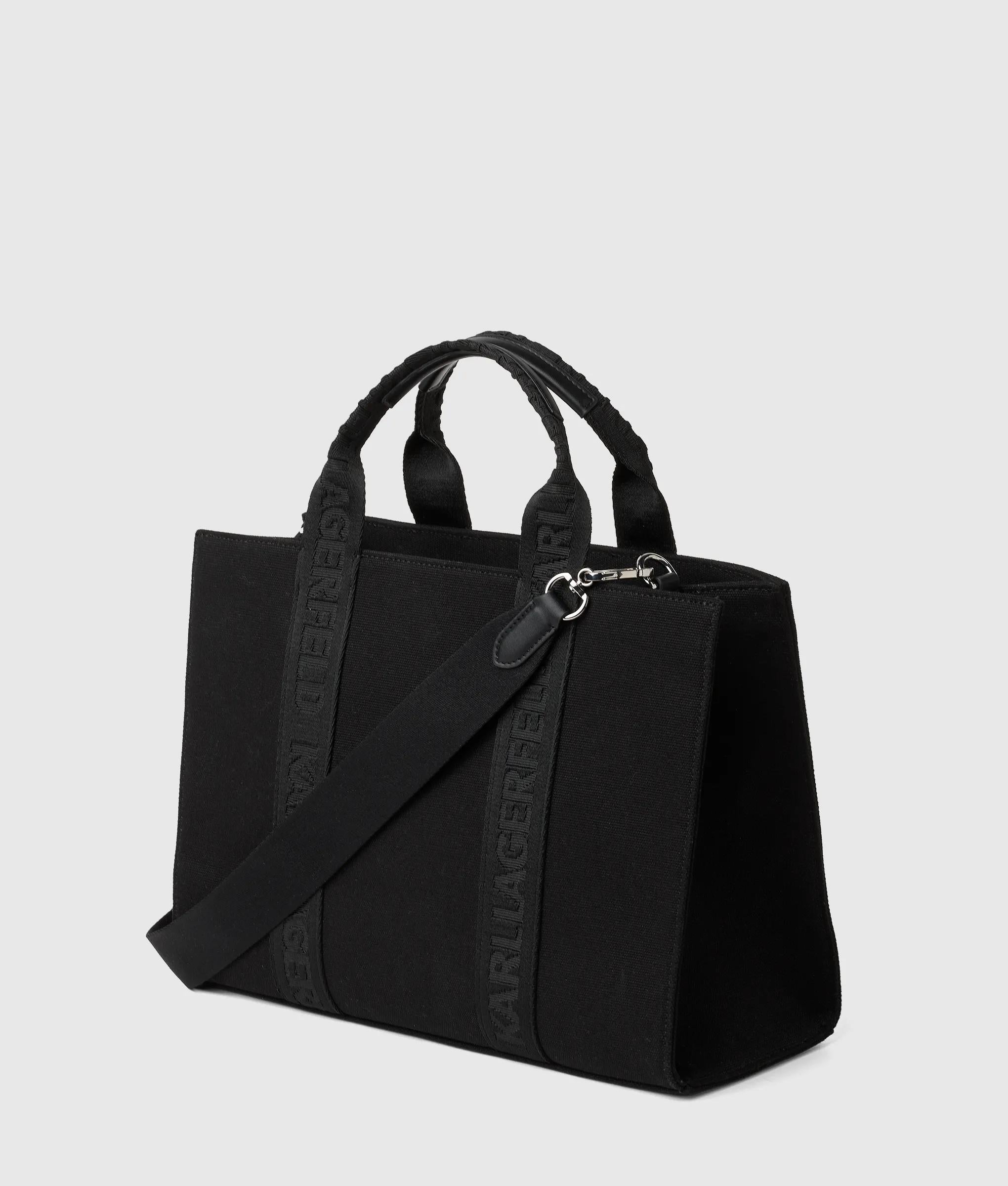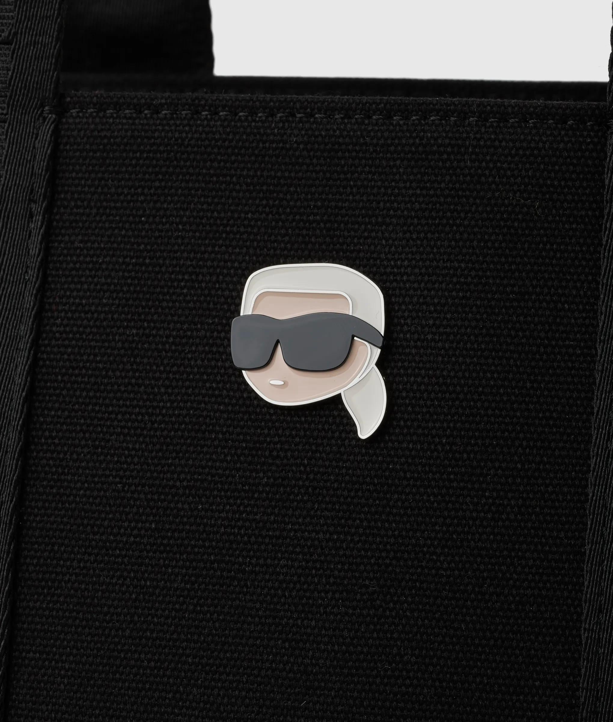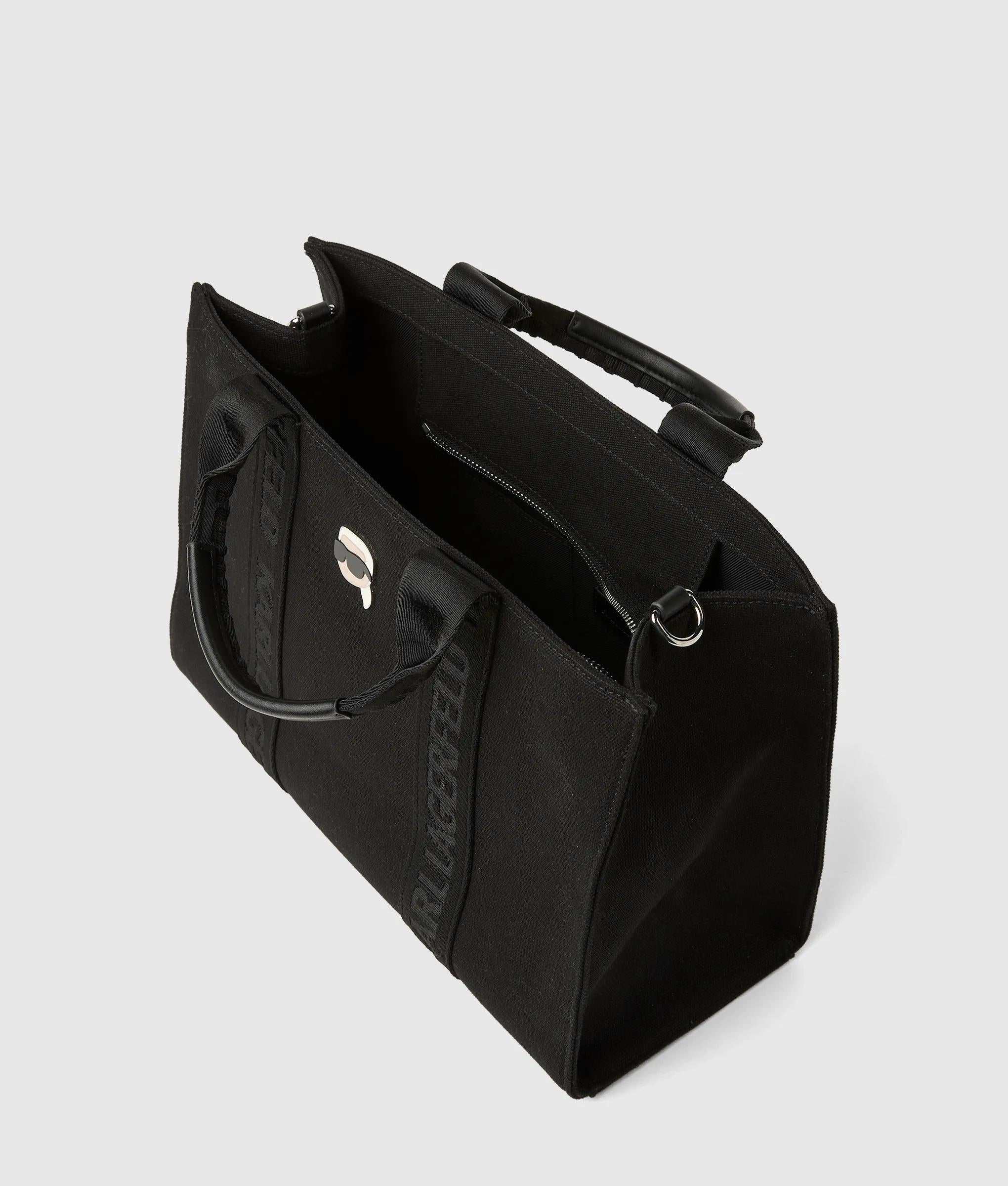 A structured square tote with a spacious feel, softened by recycled cotton. Twin handles and a detachable strap offer versatile wear, accented by a subtle Ikon Karl metal pin.